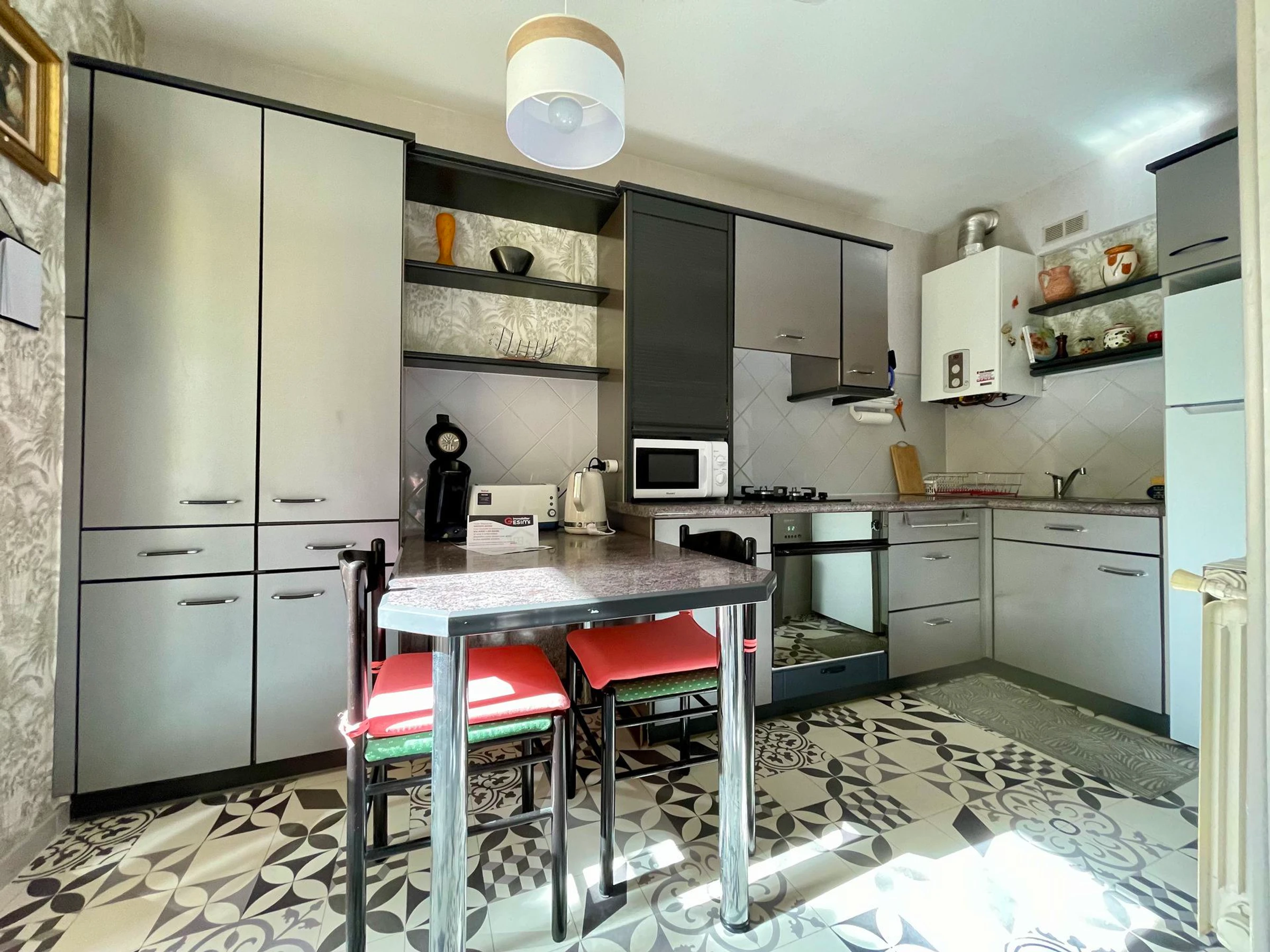 La cuisine ouverte est entièrement aménagée et équipée, avec une plaque duo gaz, un micro-ondes, un four, un frigo congélateur.