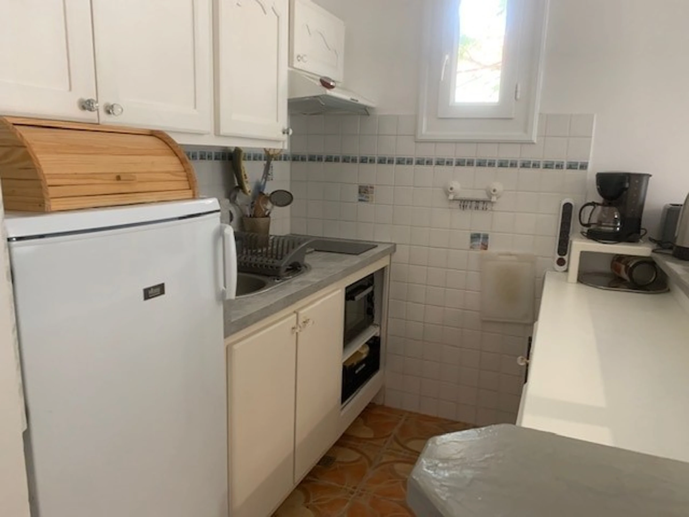 La cuisine ouverte est entièrement aménagée et équipée, avec une plaque à induction, un micro-ondes, un four, un réfrigèrateur avec un compartiment 4 étoiles.