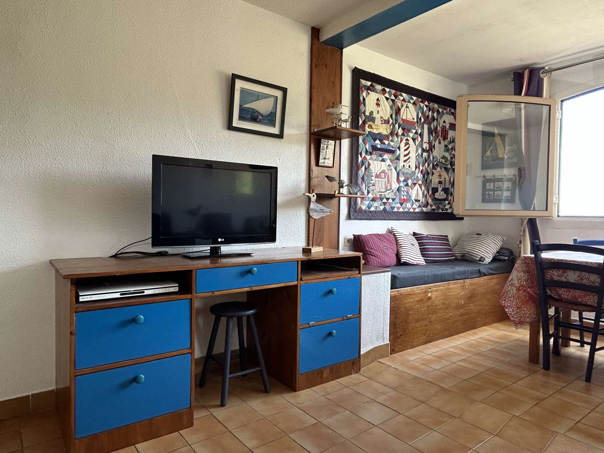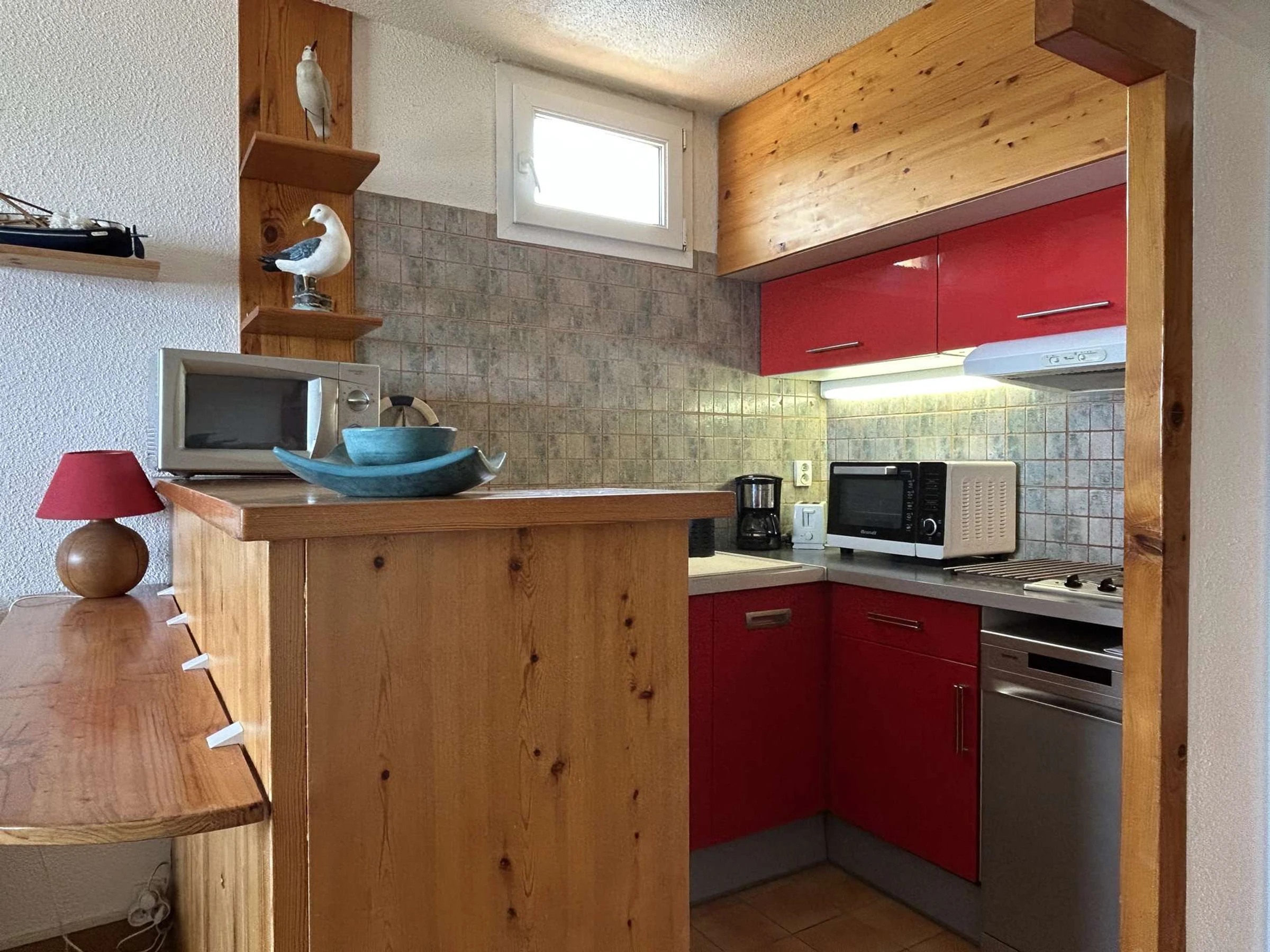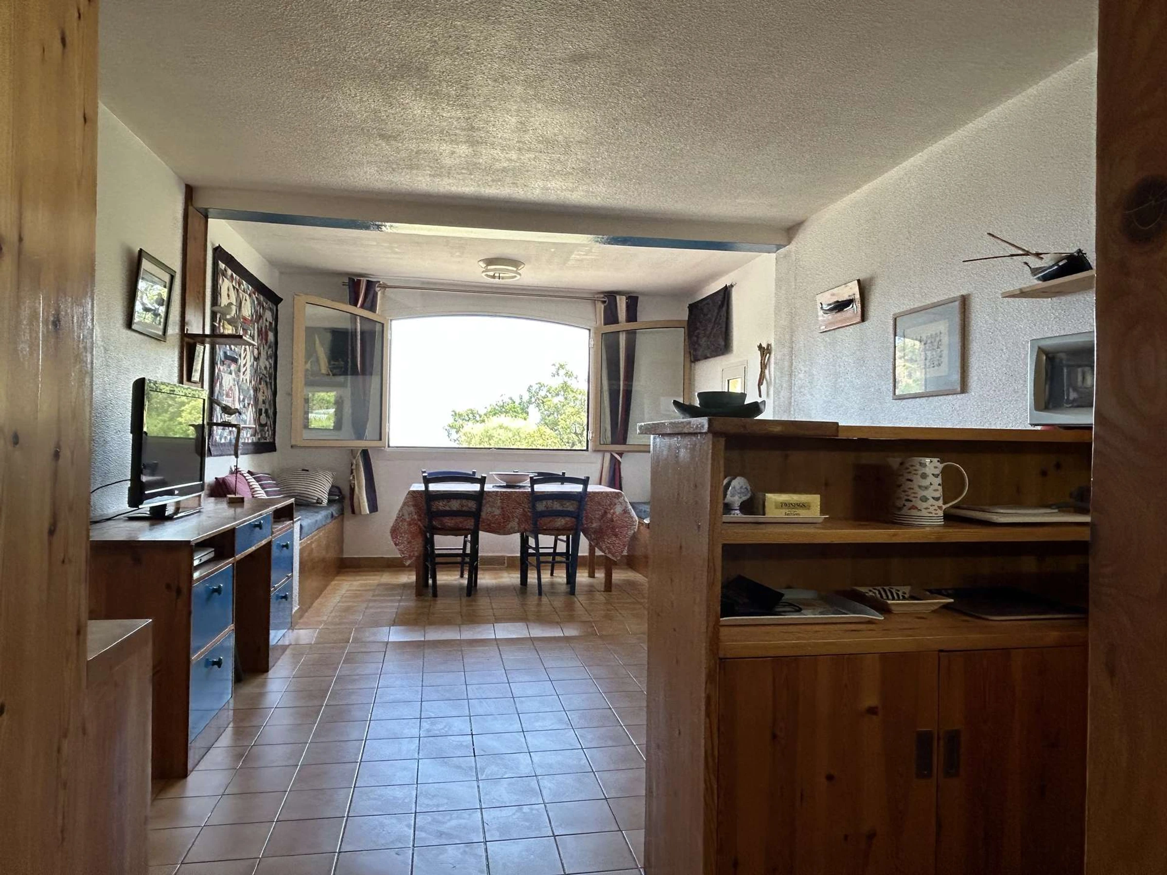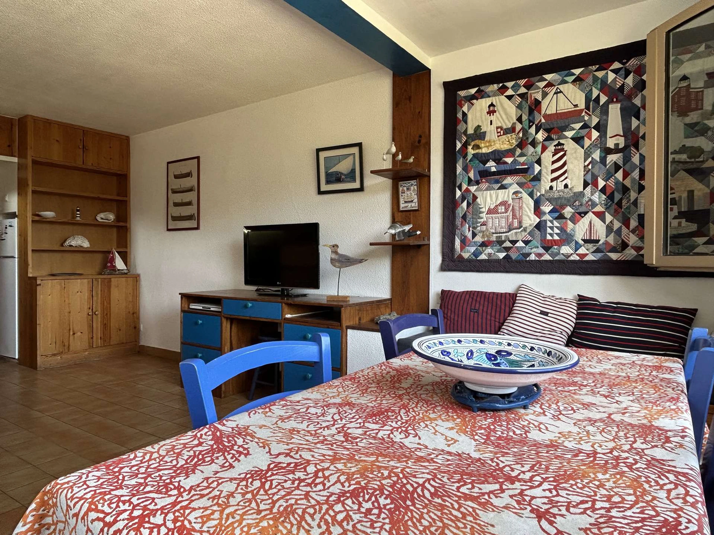 Cet appartement de vacances, situé au 1er étage et bénéficiant d'une vue directe sur la mer, se compose d’une cuisine équipée ouverte sur un séjour avec canapé convertible, d’une chambre avec un lit double, d’un coin cabine avec lits superposés, d’une salle d’eau et de WC indépendants.