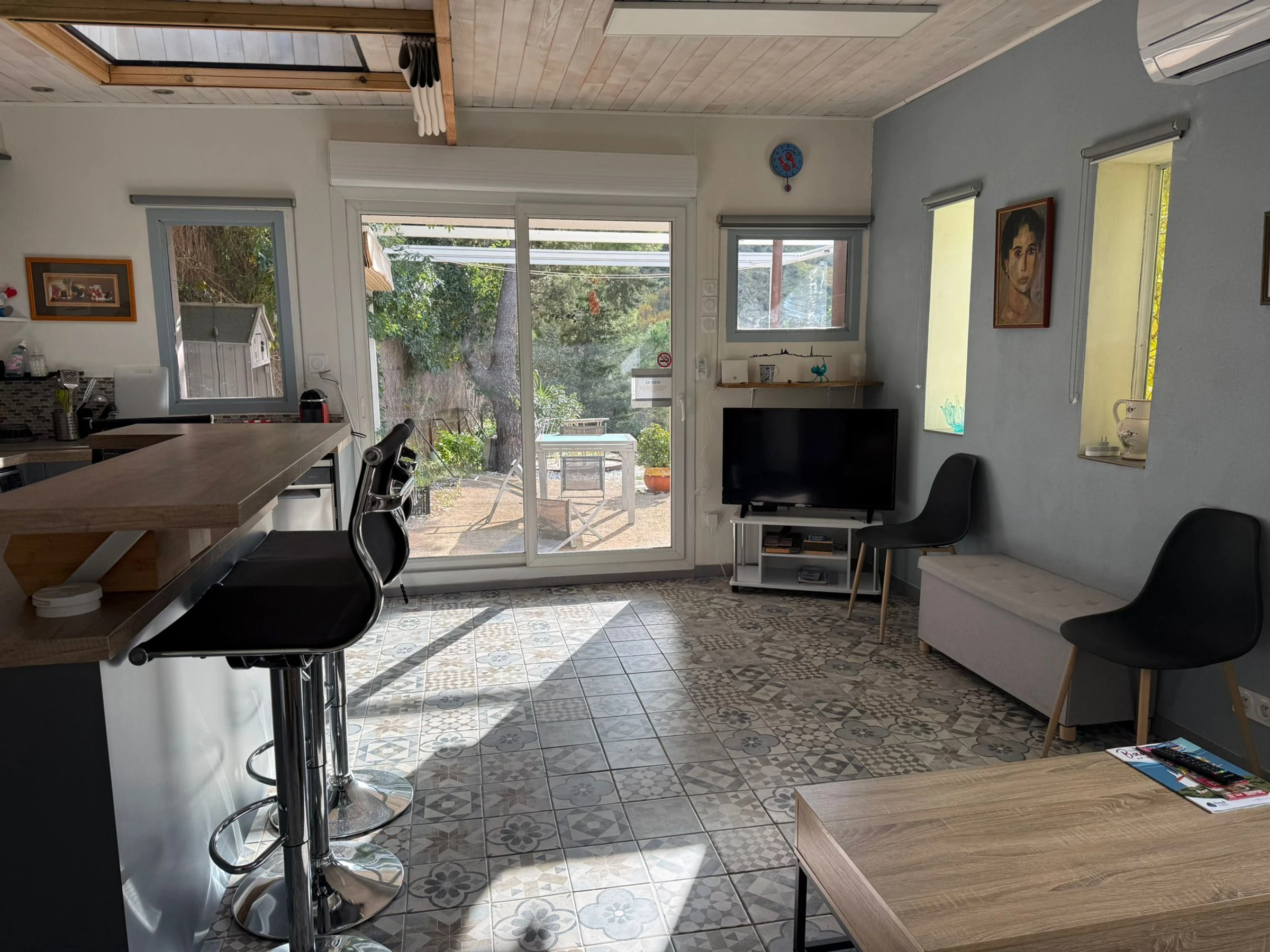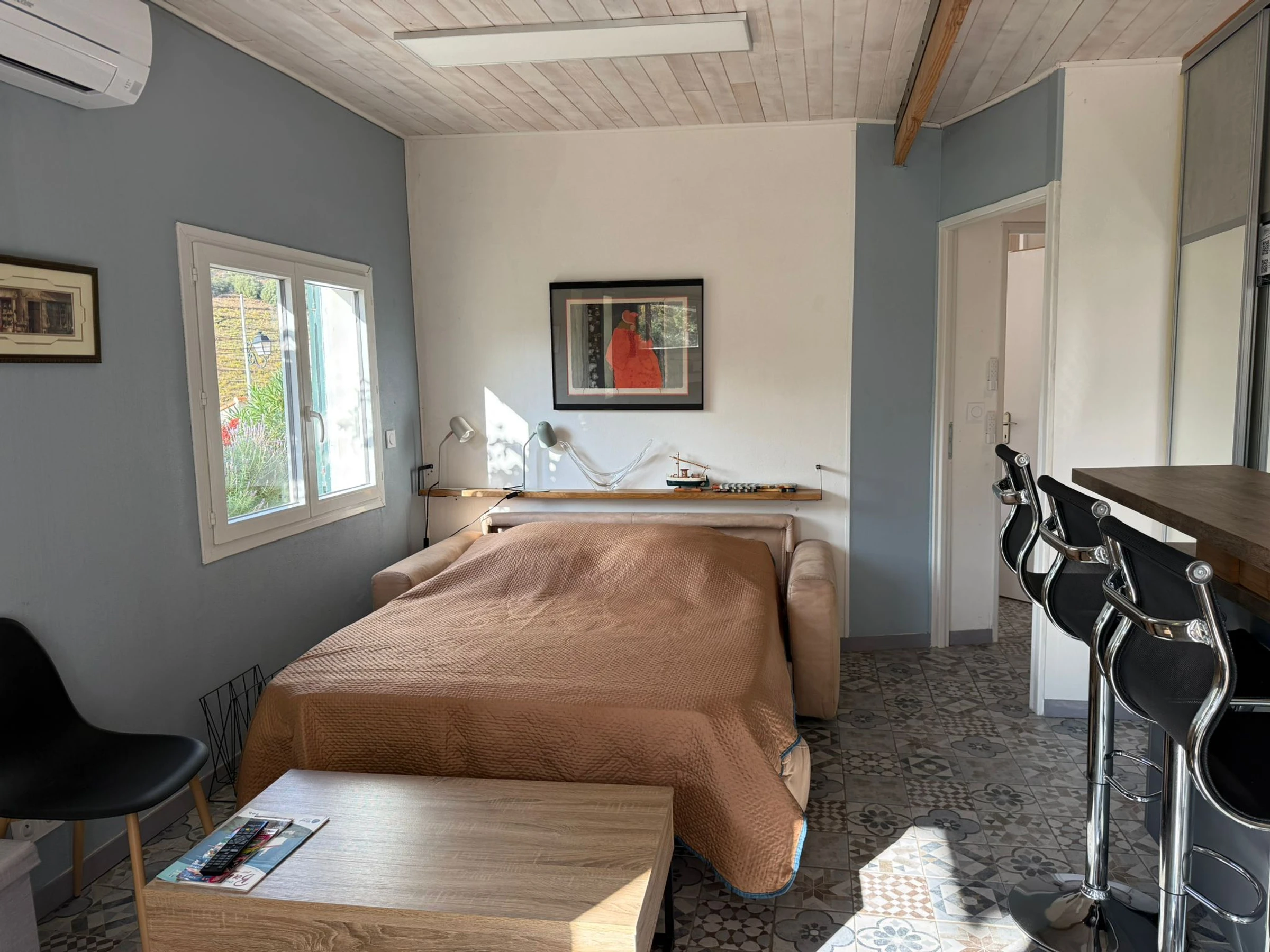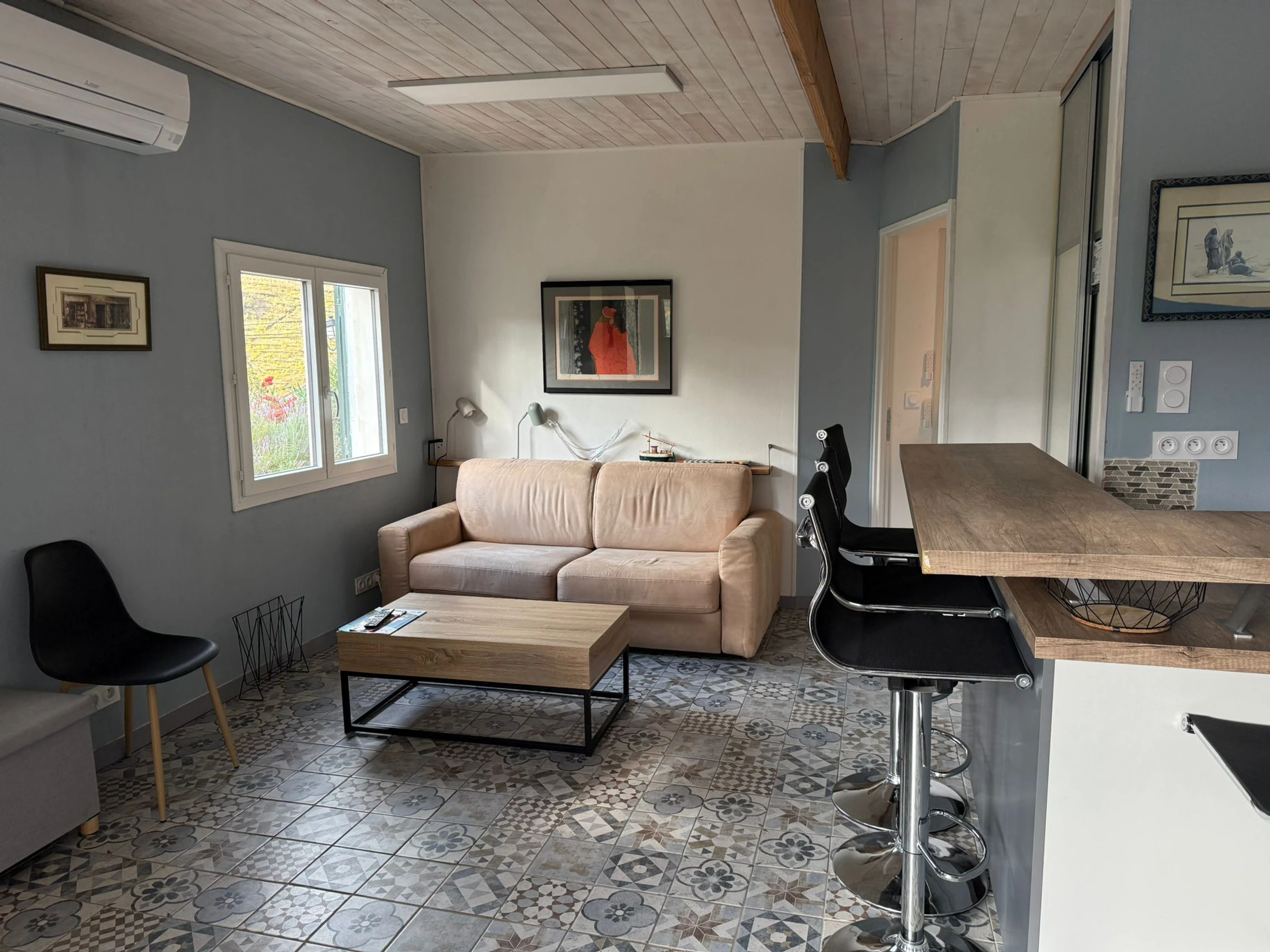 Un séjour lumineux avec canapé-lit (couchage permanent), ouvrant sur la terrasse.