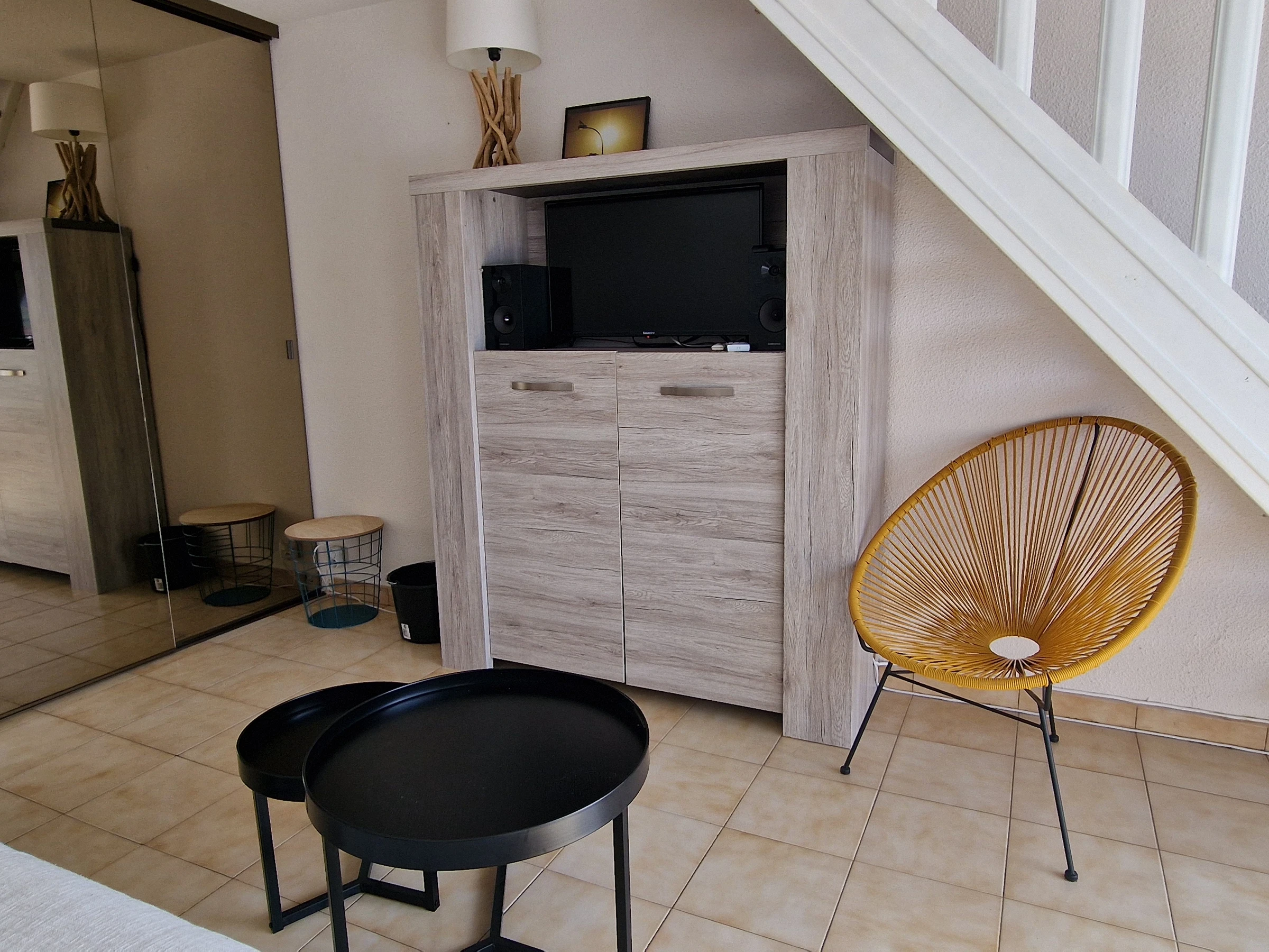 Idéal pour 4 personnes, il se compose au rez-de-chaussée d'un séjour climatisé, d'une cuisine toute équipée ( cafetière à filtre), une salle d'eau et un WC indépendant.