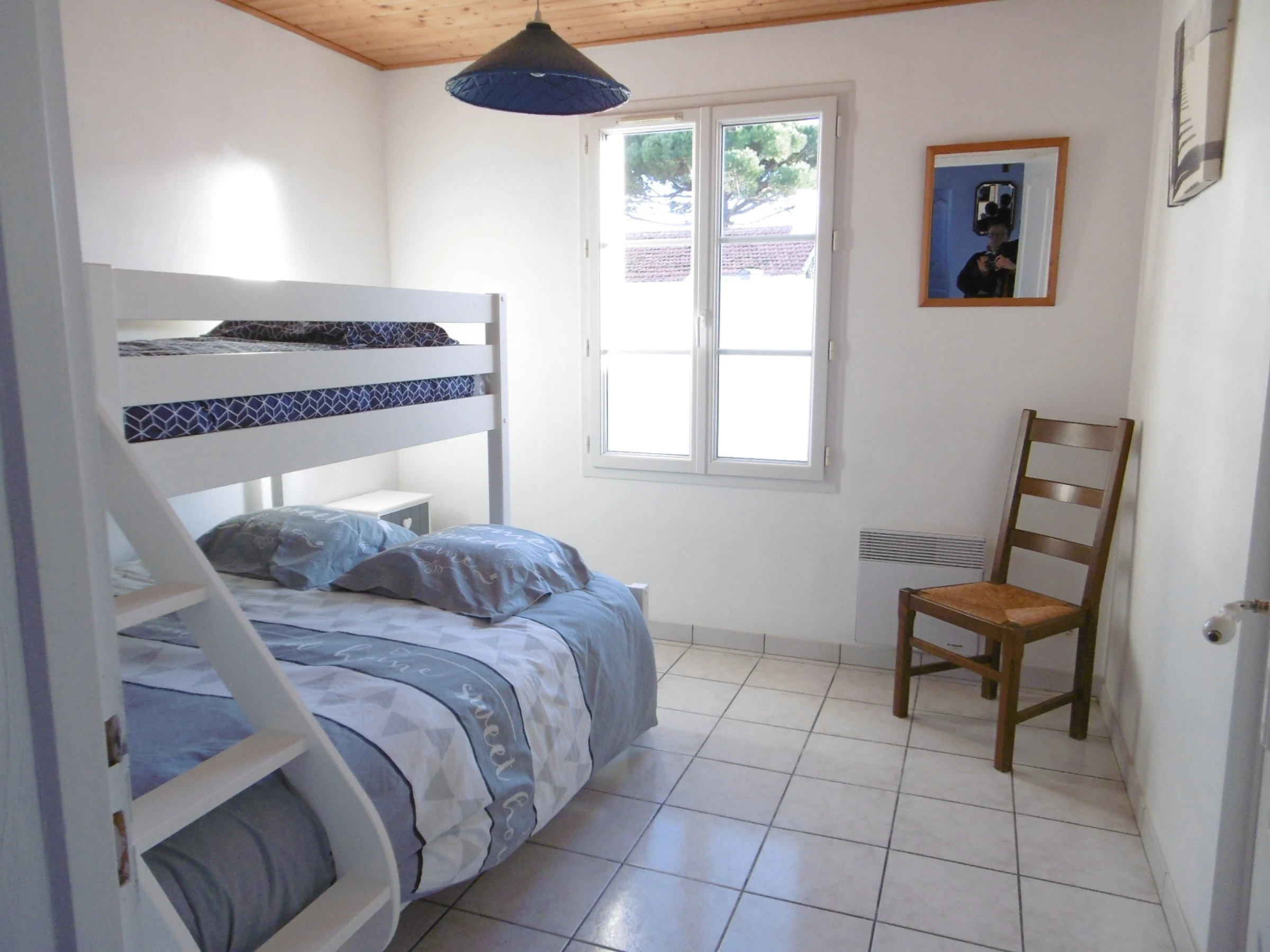 Maison standard de plain pied – 80 m² environ – 6/7 pers – comprenant séjour/salon, cuisine aménagée et équipée, une chambre avec un lit en 140, une chambre avec un lit en 140, une chambre avec un lit en 140 et un lit en 90 superposés, salle d’eau, wc, garage. Télévision, lave-linge, congélateur, four, lave-vaisselle, plaque induction, équipement bébé (baignoire, anneau de douche, rehausseur). Jardin/cour clos. Mobilier de jardin, 6 transats, plancha électrique. Stationnement sur jardin/cour. Animaux non admis. 2 CLEVACANCES. Possibilité d'un forfait ménage de 95 €.