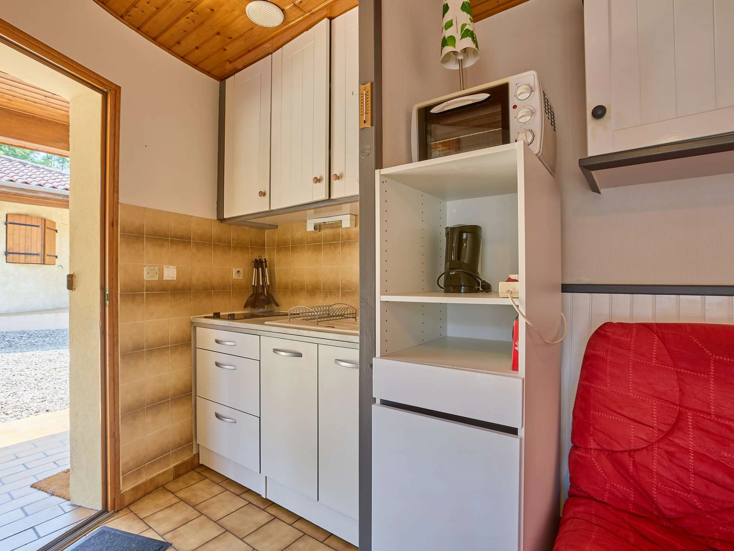 La pièce principale de 17 m² comprend une kitchenette équipée (deux plaques électriques, réfrigérateur, mini-four, micro-ondes…), un coin repas avec table et chaises, ainsi qu’un espace salon avec clic-clac, table basse et téléviseur.
