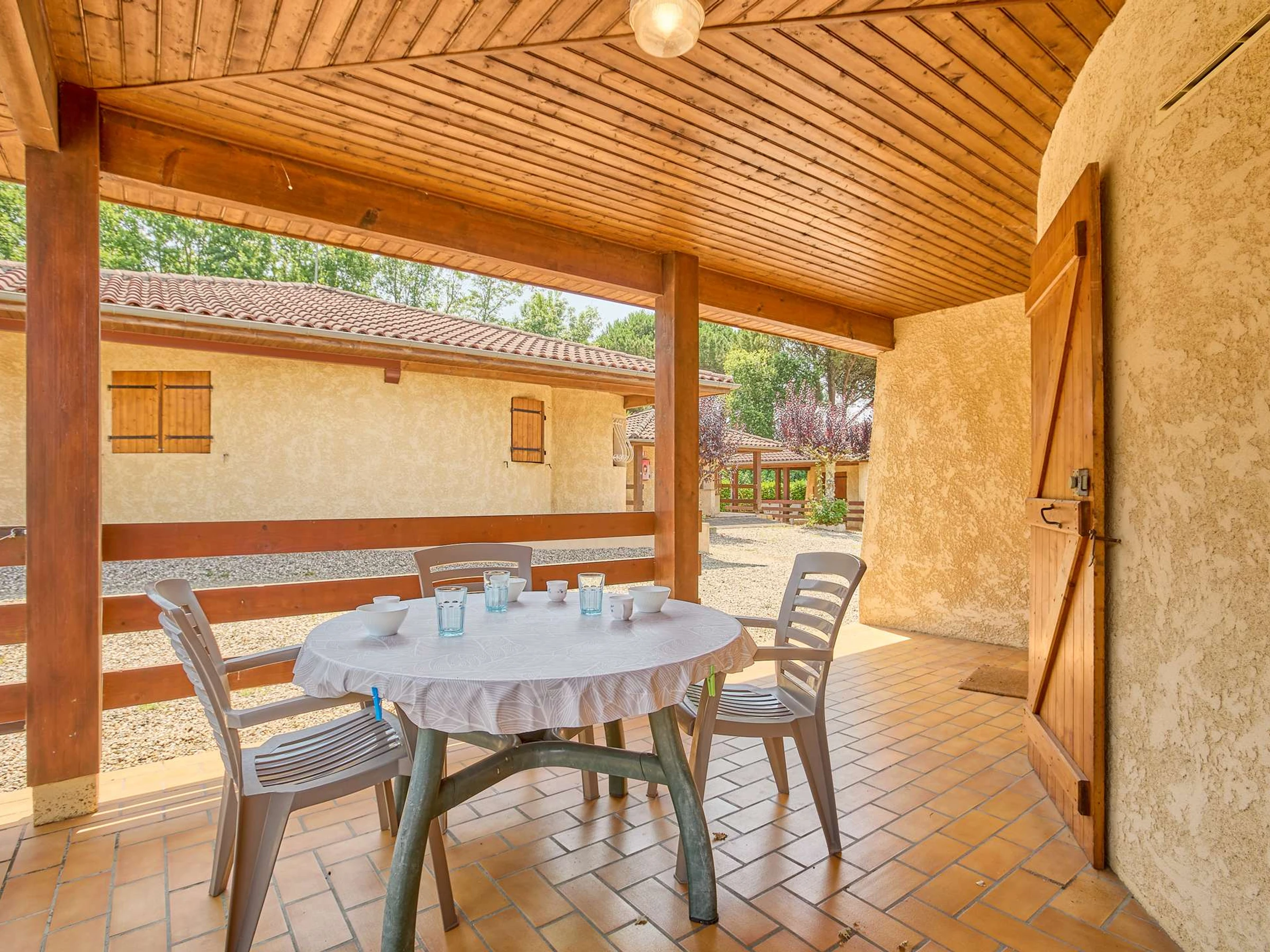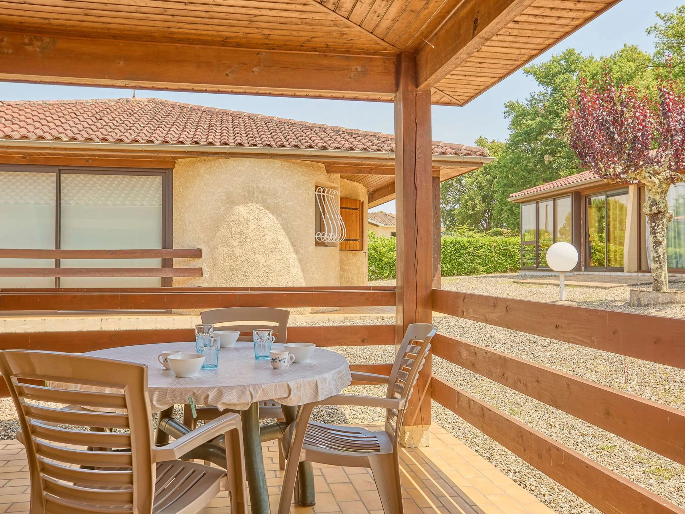 Ce T2 de 32 m² de plain-pied, situé route de Lagrange, dispose d’une grande terrasse orientée à l’est, aménagée avec une table, trois fauteuils et un relax.