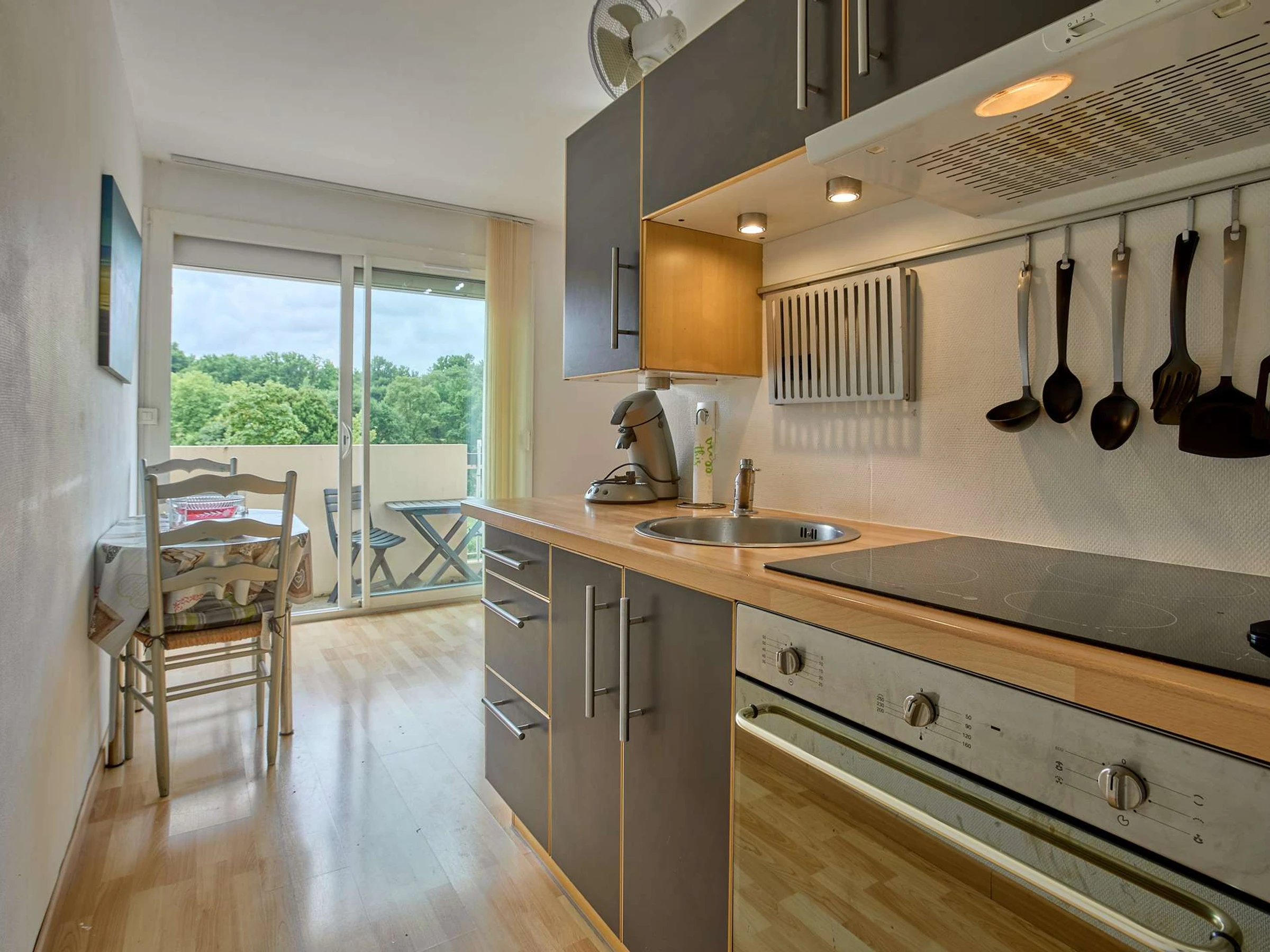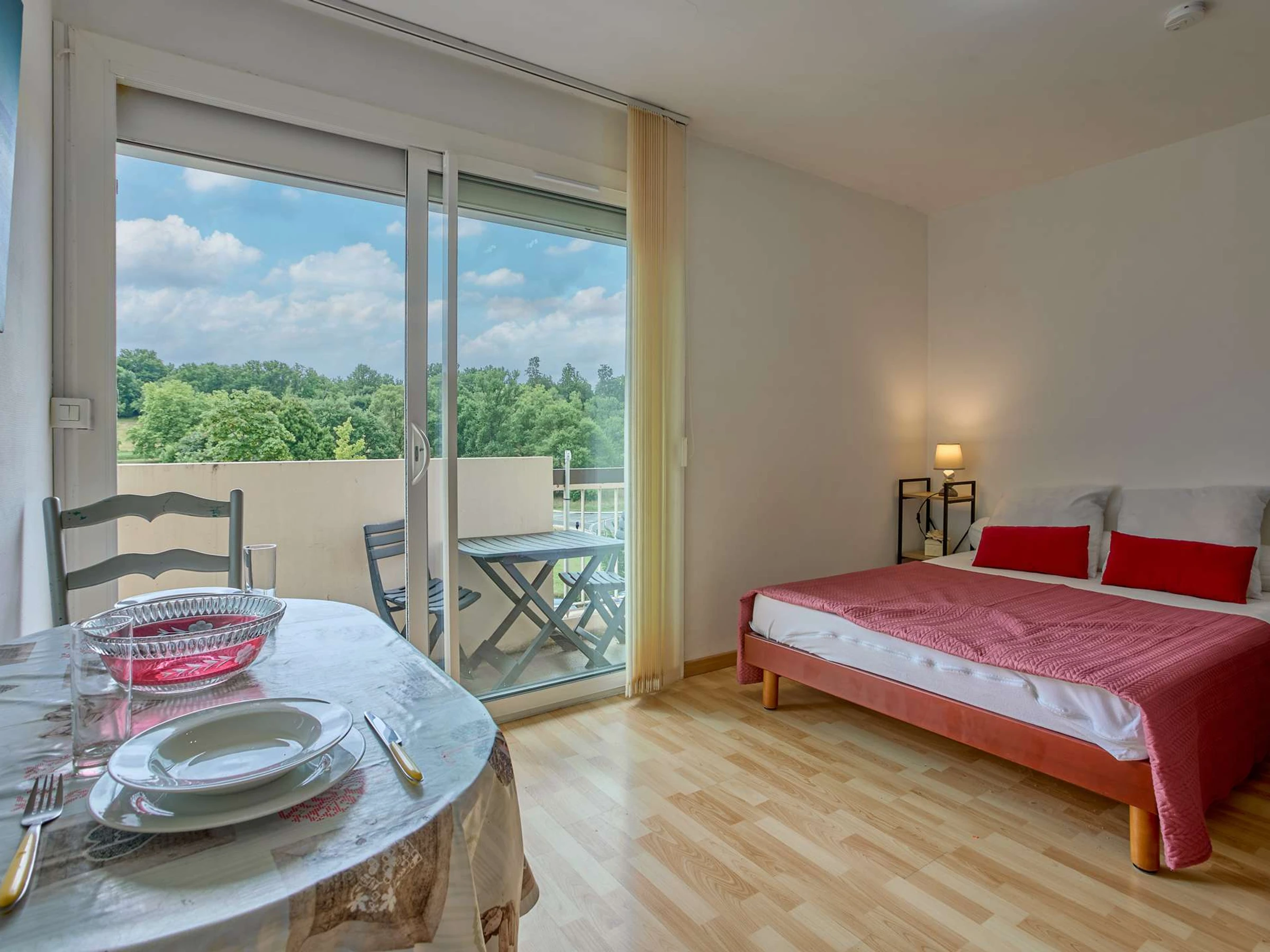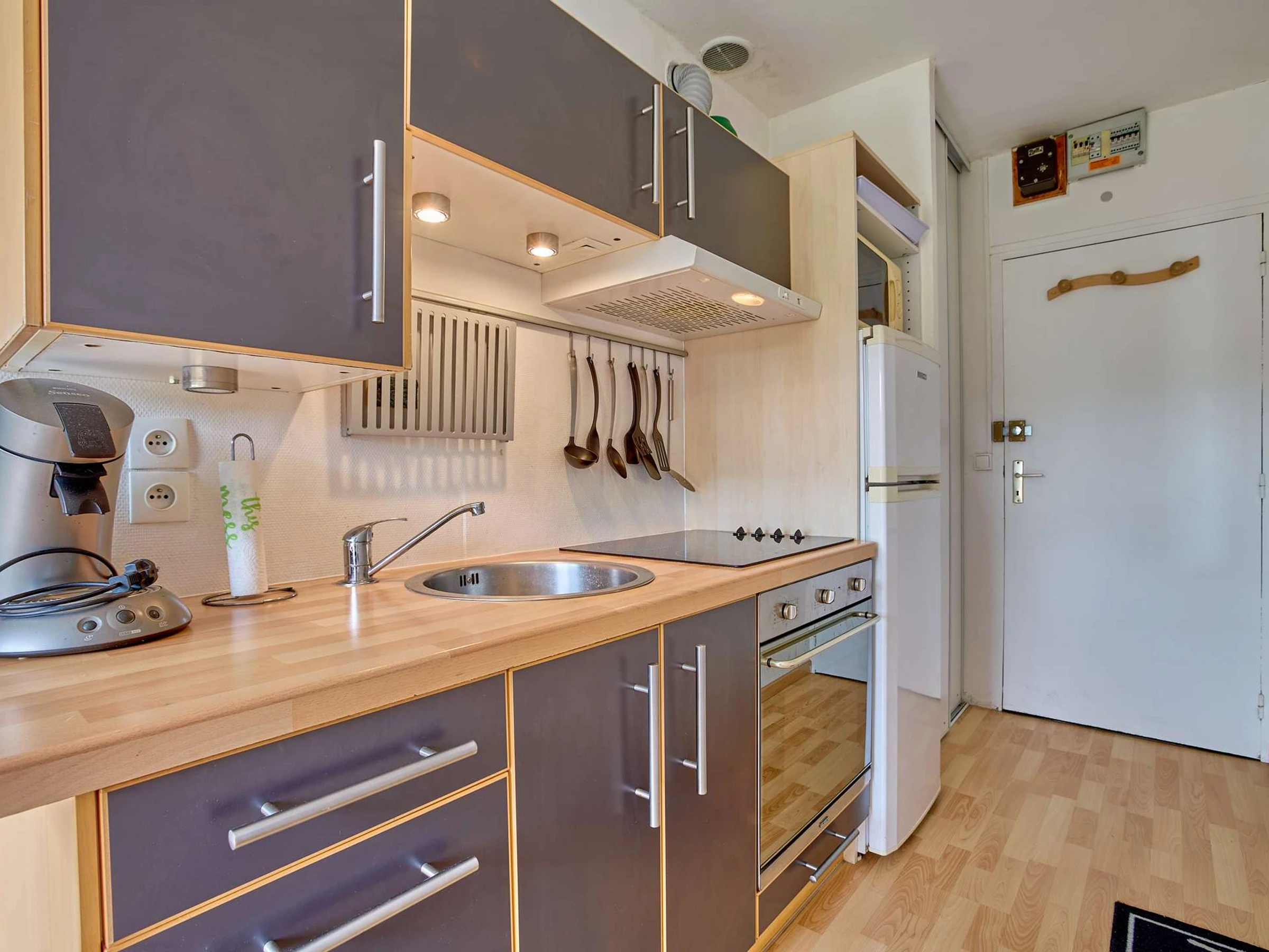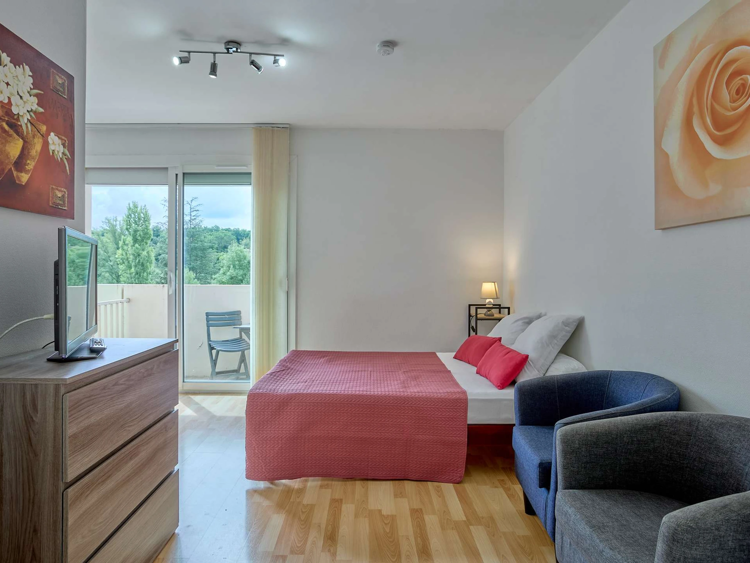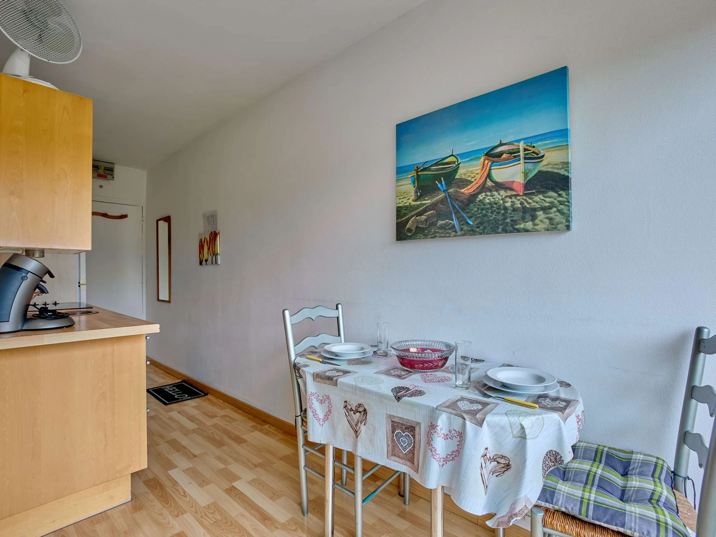 Ce studio entièrement rénové avec balcon est au 2ème étage de la résidence et exposé plein sud, aménagé avec un lit en 140 cm, 2 fauteuils, une télévision, un coin repas et cuisine équipée avec four électrique, micro-ondes, grande plaque vitrocéramique et grand réfrigérateur/congélateur.