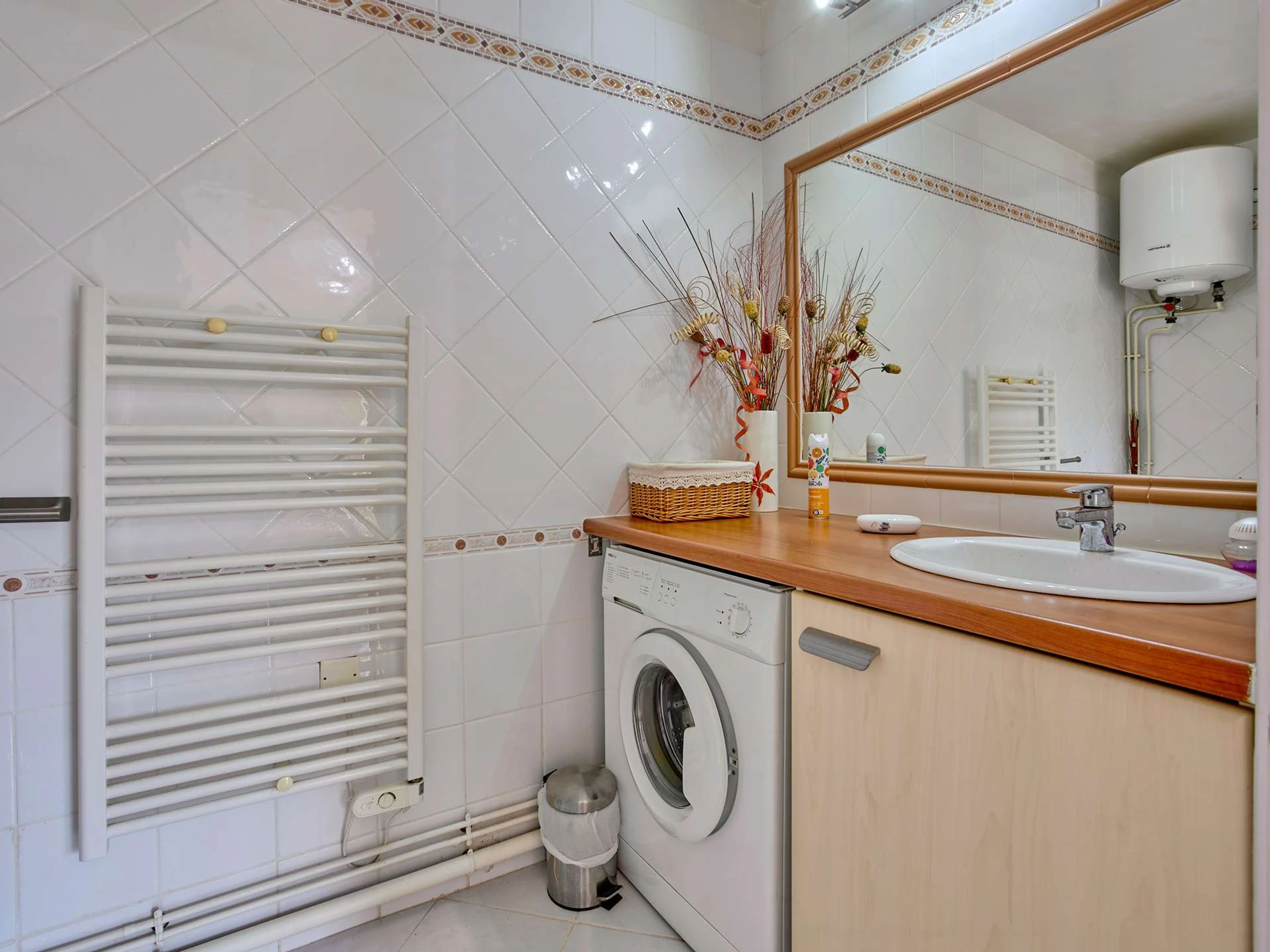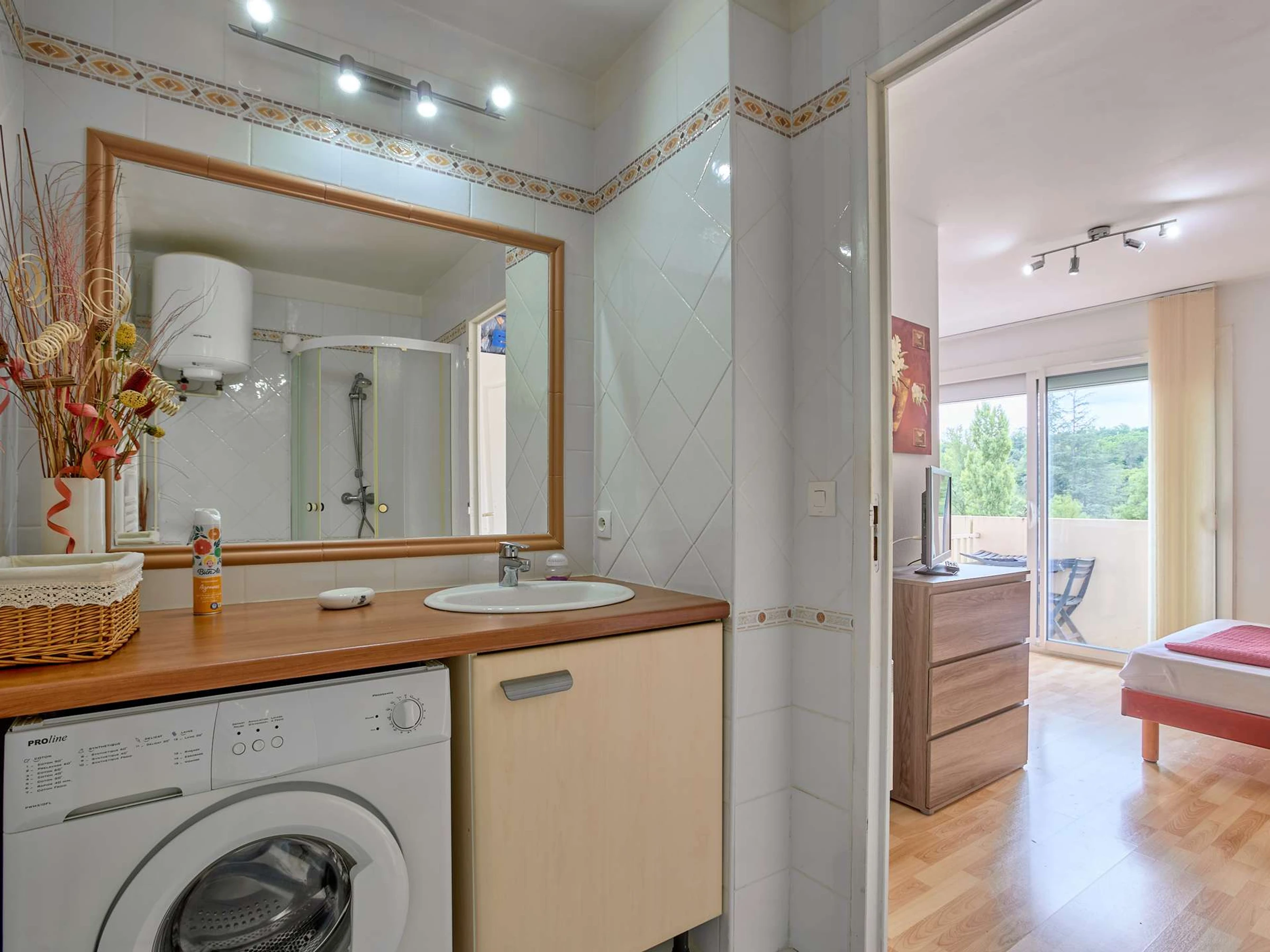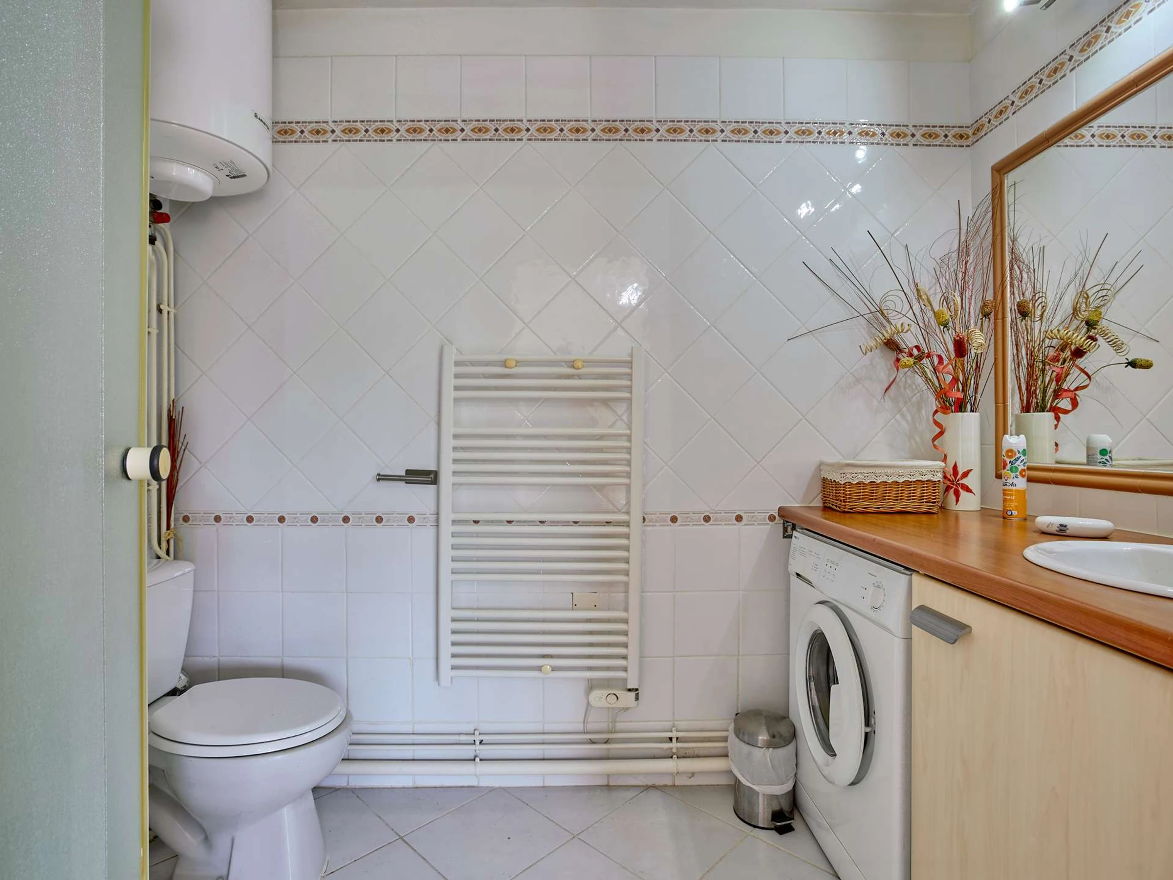 Sa salle d'eau possède une cabine de douche, un radiateur sèche-serviettes, une vasque, un lave-linge et des toilettes.