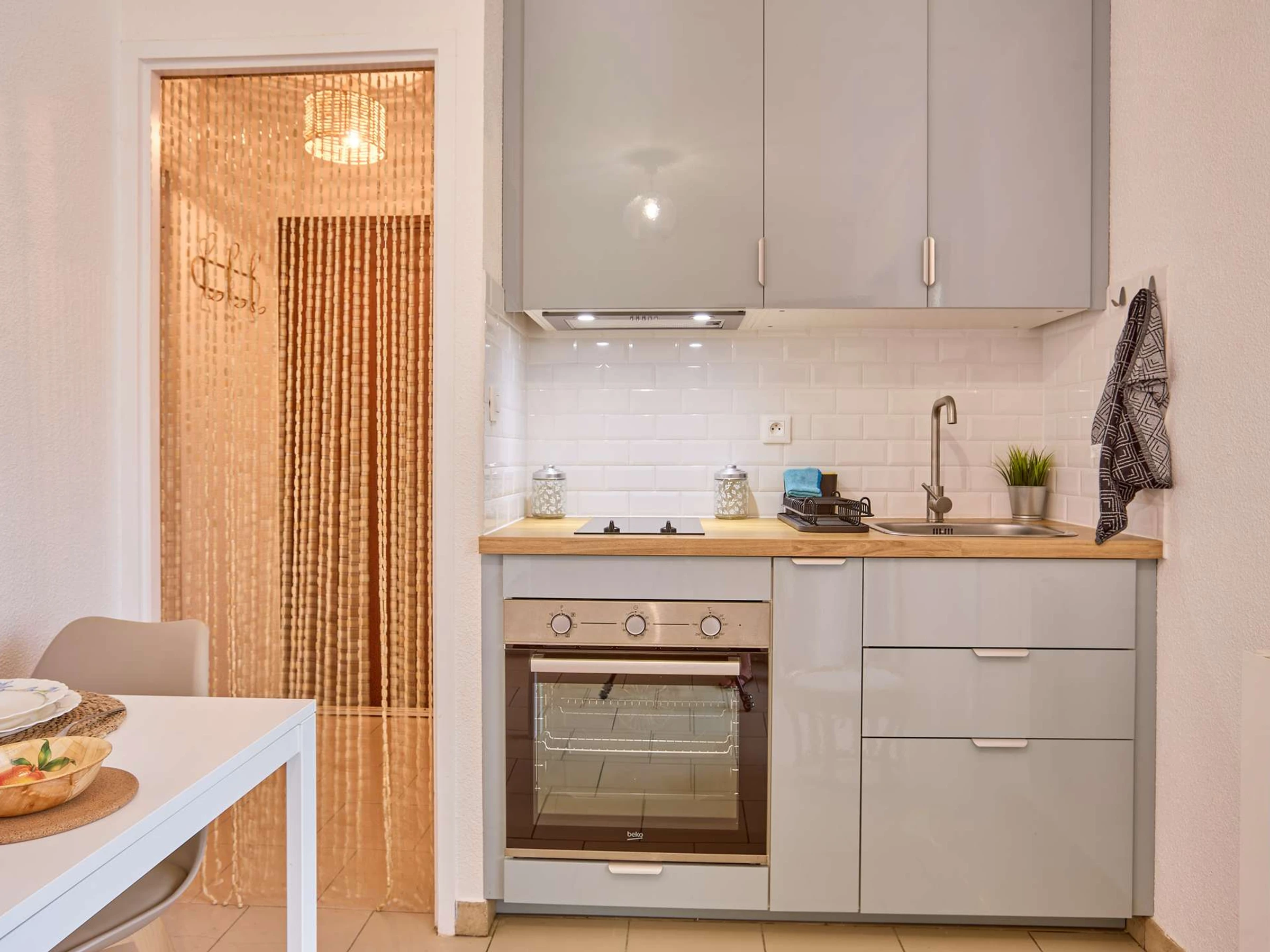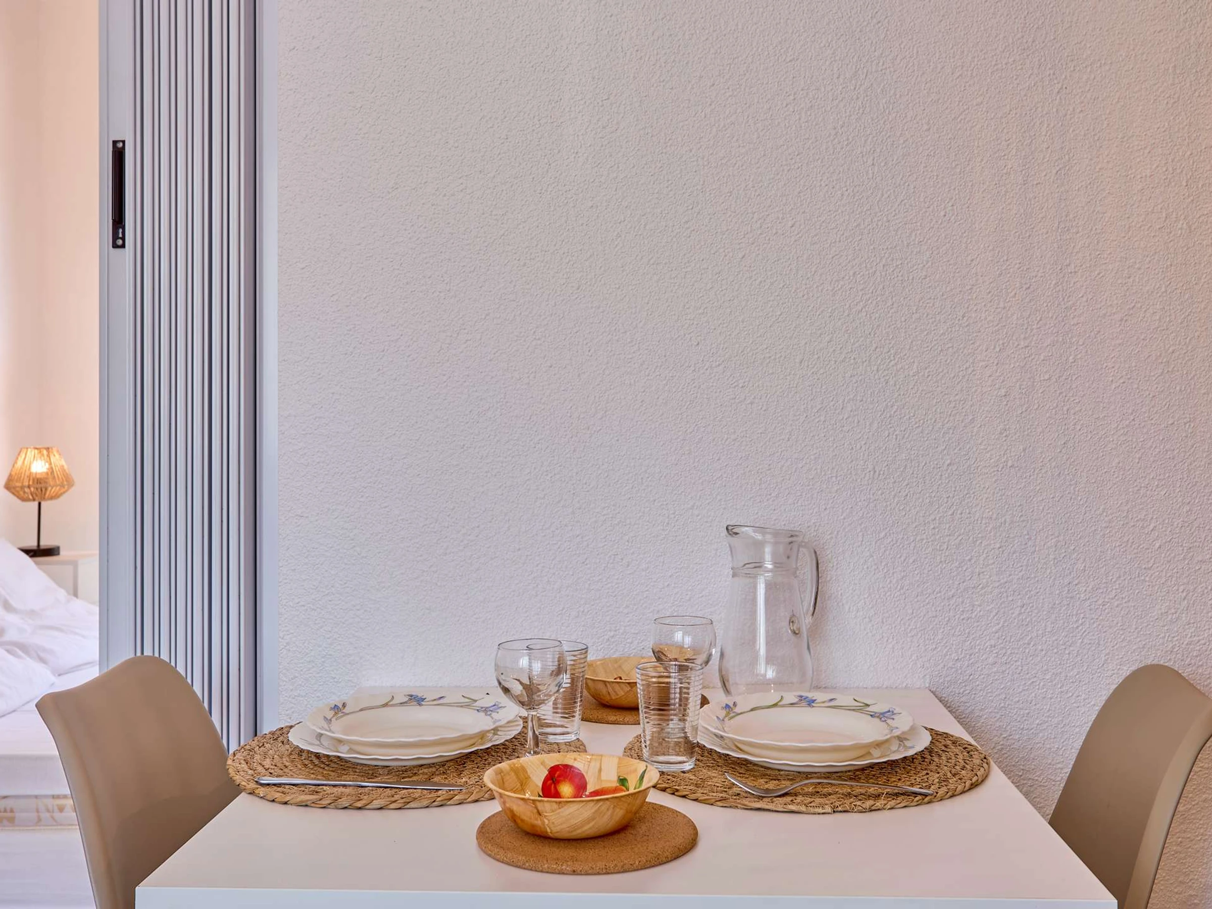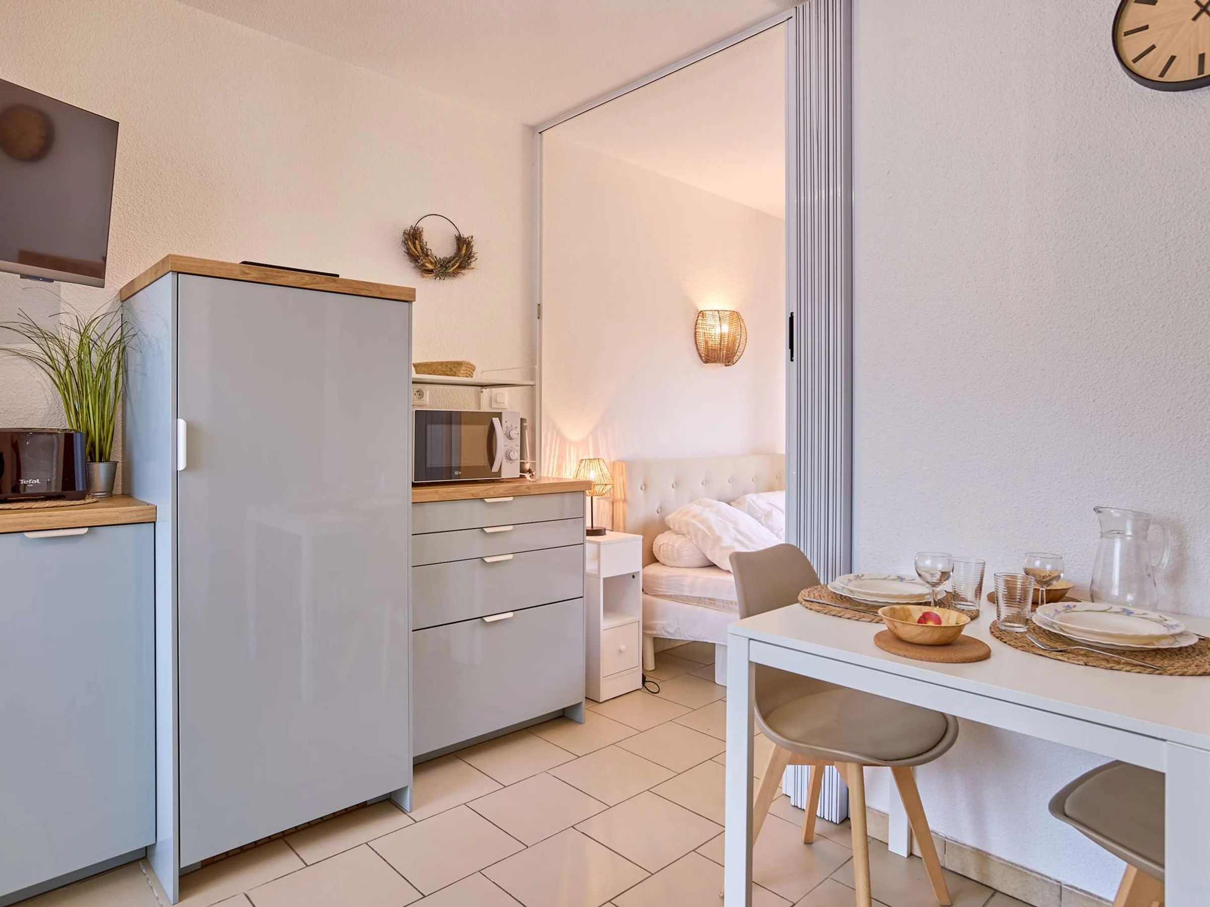 Son séjour, coin repas/cuisine, vous accueillera autour d’une table et 2 chaises, ainsi qu’une cuisine équipée (2 plaques vitrocéramiques, réfrigérateur avec congélateur, micro-ondes, cafetière …), un téléviseur au centre de la pièce. Son coin nuit semi-séparé par une cloison, est aménagé d’un lit en 140 cm et d’un placard. Cet appartement possède aussi une salle d’eau avec douche, lavabo et lave-linge, et des toilettes séparées, ces dernières pièces jouissant d’une fenêtre chacune.