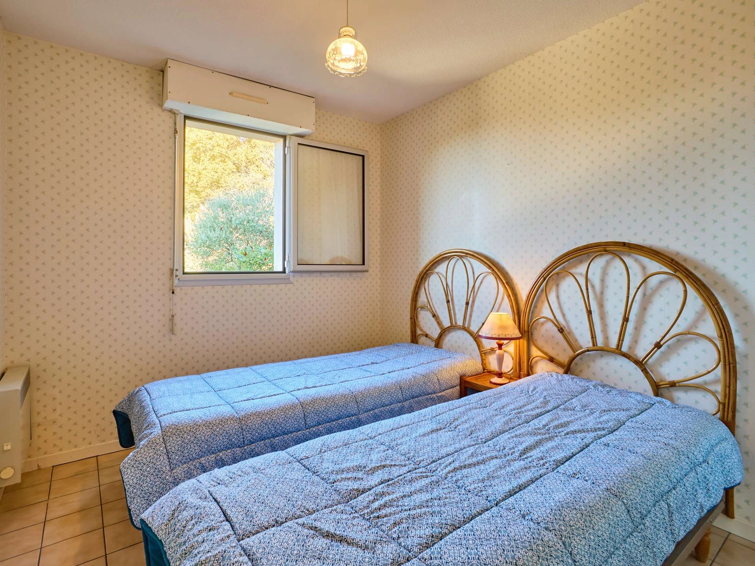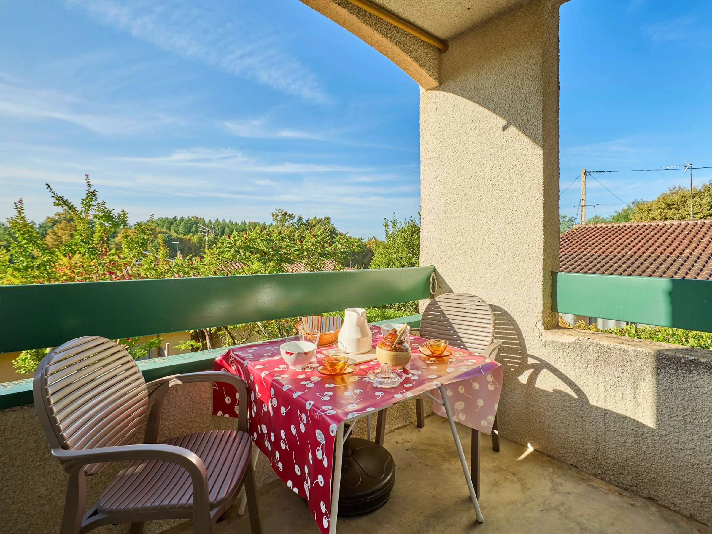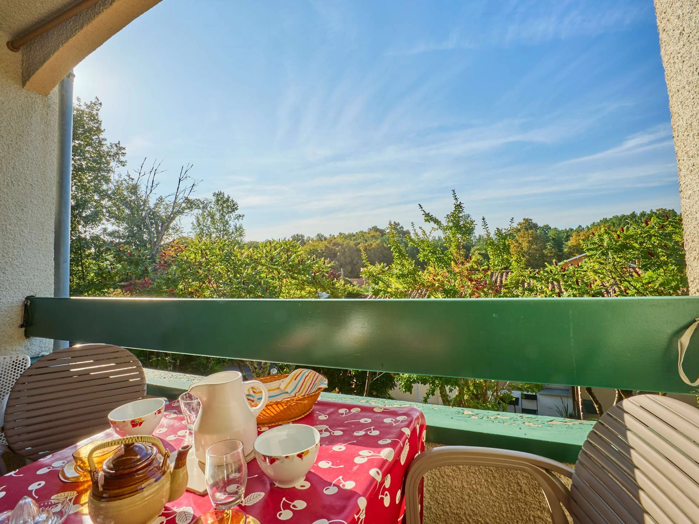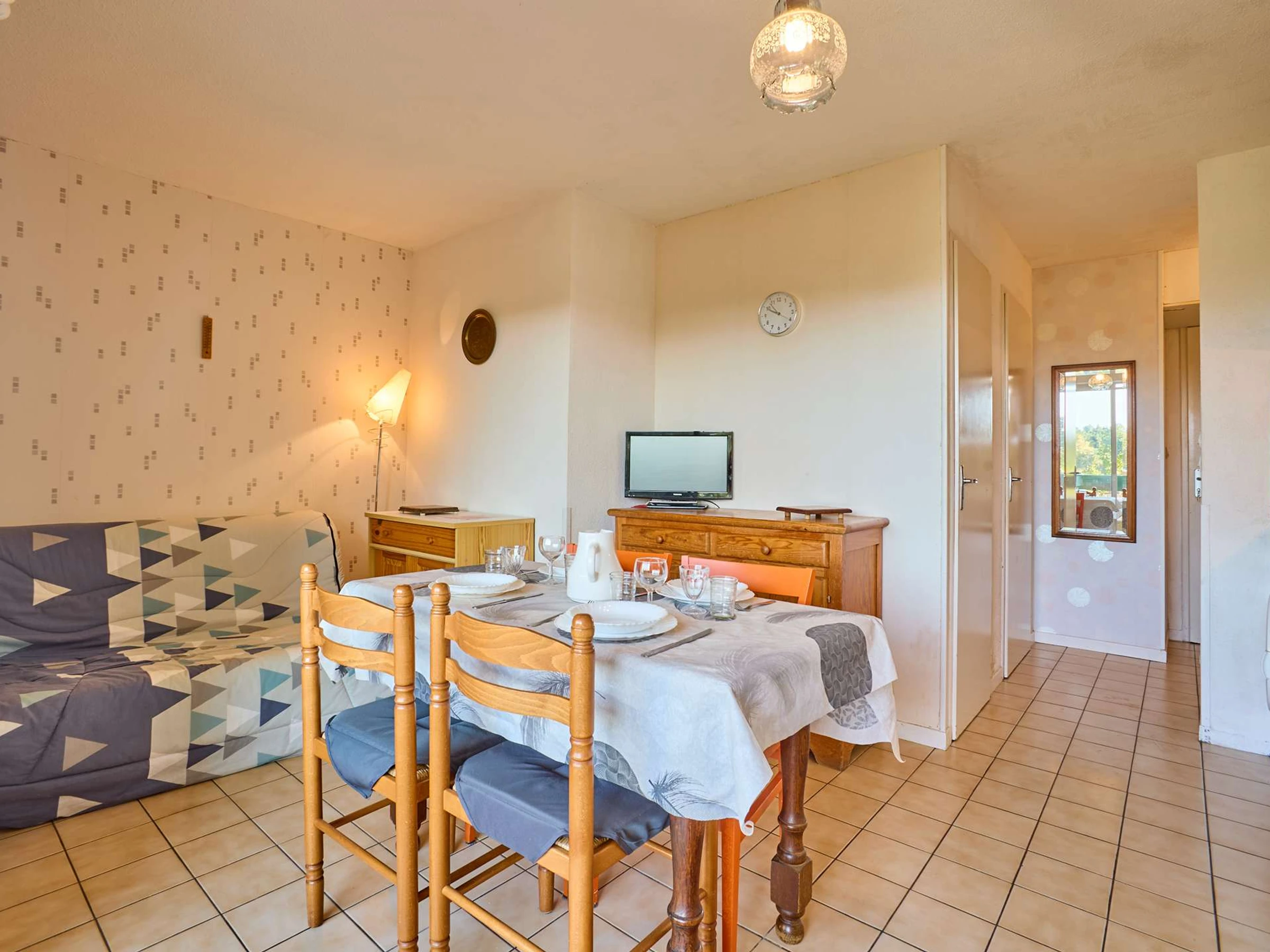 Balcon exposé au sud avec mobilier de jardin, salon lumineux avec coin repas, canapé-lit, et télévision. Kitchenette entièrement équipée. Chambre avec deux lits simples et salle de bains attenante. Toilettes séparées.