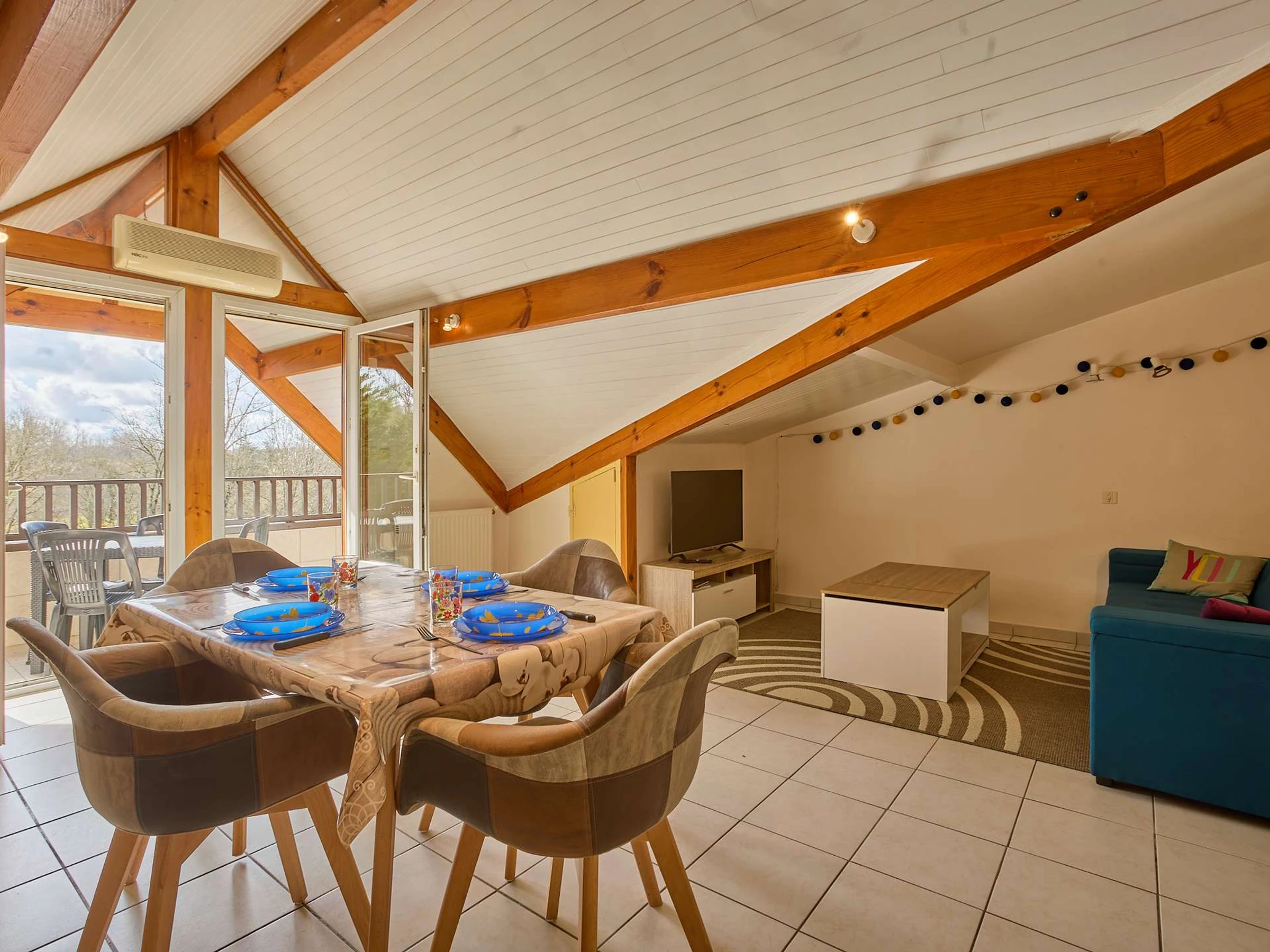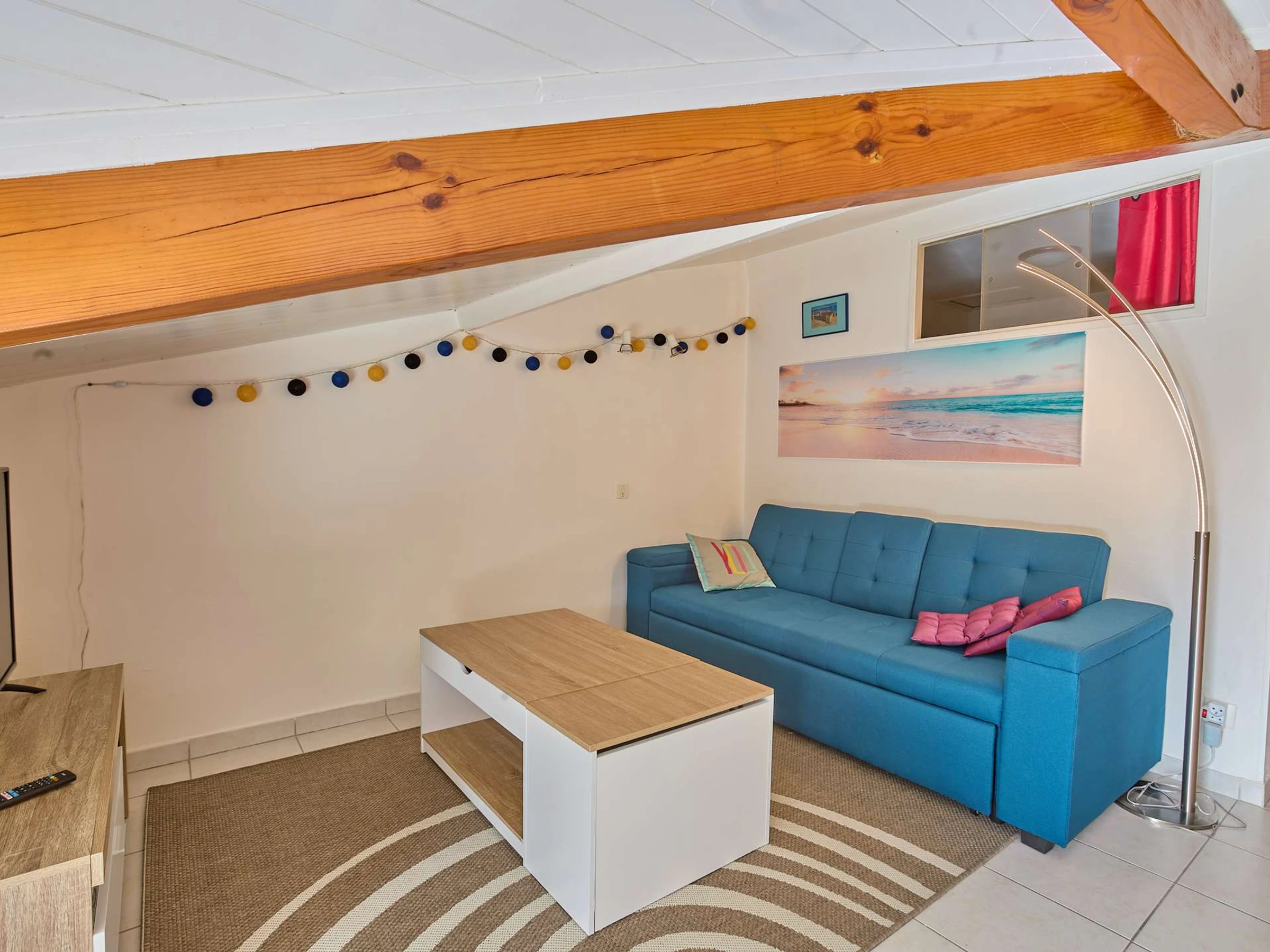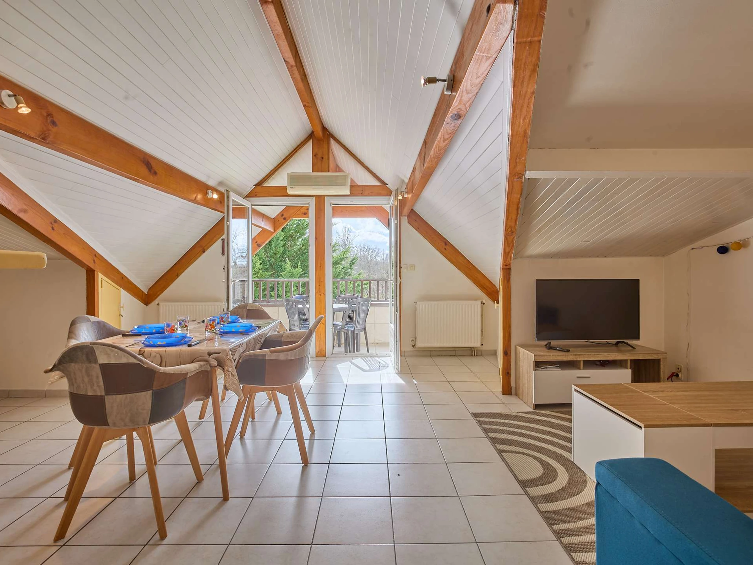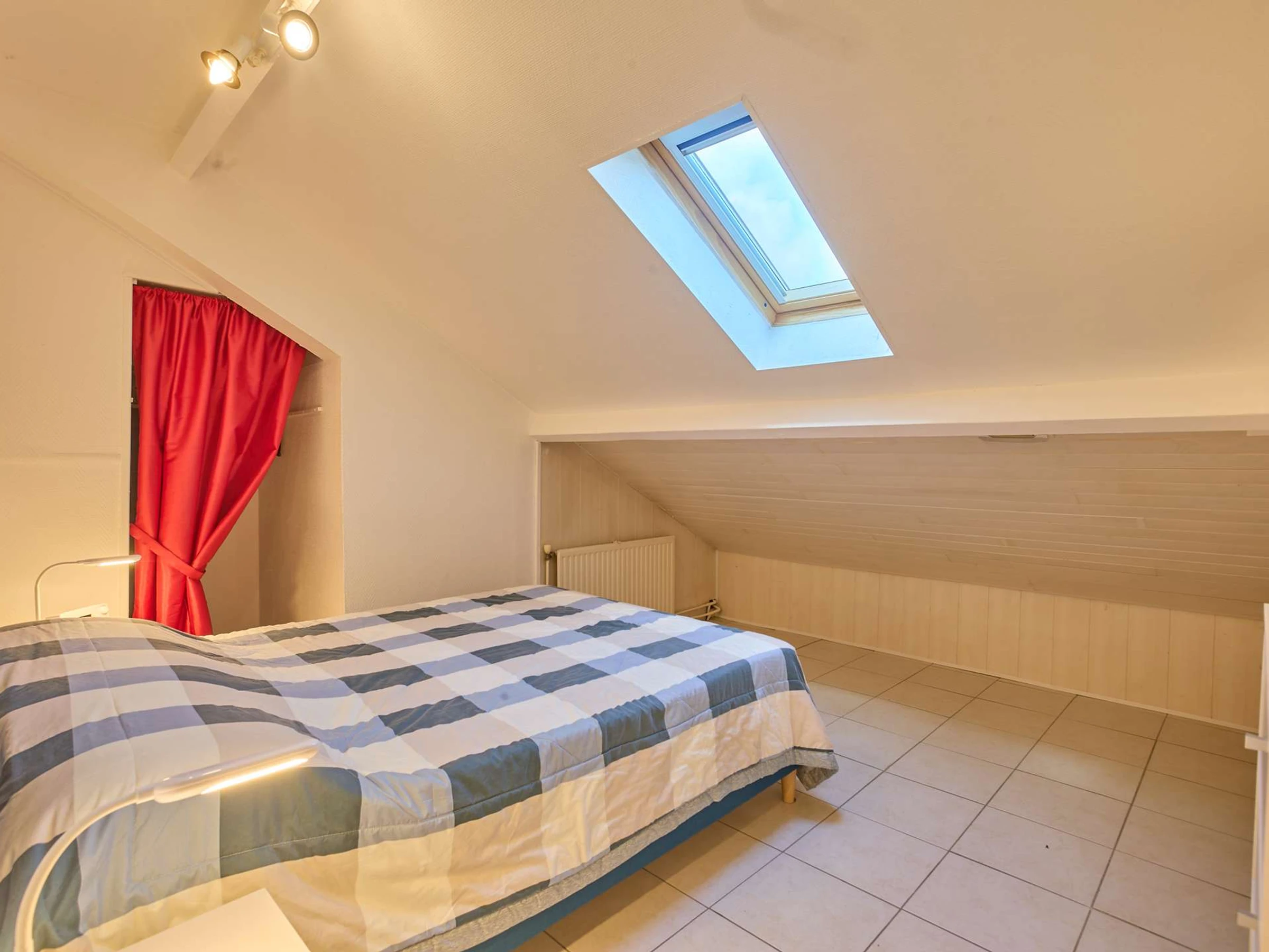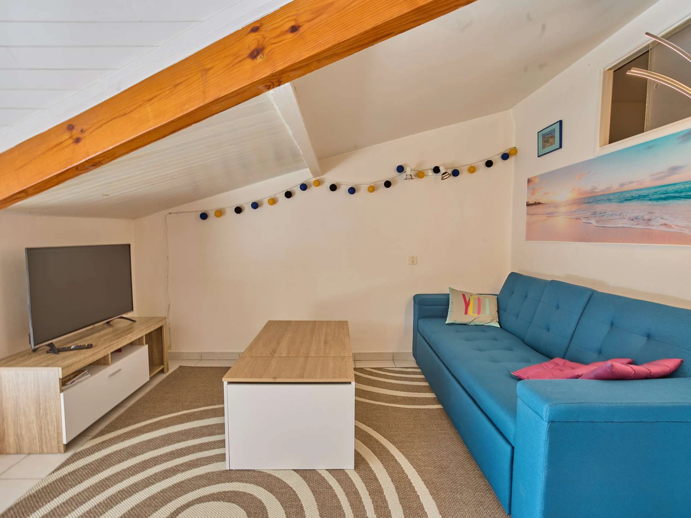 Ce spacieux T2bis cabine mansardée de plus de 45 m² est situé au second étage de la résidence des Ormes, et offre une vue dégagée sur la nature avec son exposition au [hidden] grande pièce à vivre intègre une cuisine ouverte équipée de 4 plaques de cuisson, d'un réfrigérateur-congélateur, d'un micro-ondes, d'un mini-four et d'un lave-linge, une partie salon avec canapé et téléviseur, une table à manger avec 4 chaises, un buffet. Cette dernière est éclairée par une porte fenêtre, s'ouvrant sur un balcon exposé au sud, offrant un salon de jardin. Sa chambre mansardée avec un lit en 140 cm (petit dressing) , une seconde chambre cabine avec un lit de 90 cm et un placard de rangement . Sa salle d'eau offre une cabine de douche et un meuble-vasque et son lave-linge. Ses wc sont indépendants.chauffage électrique.