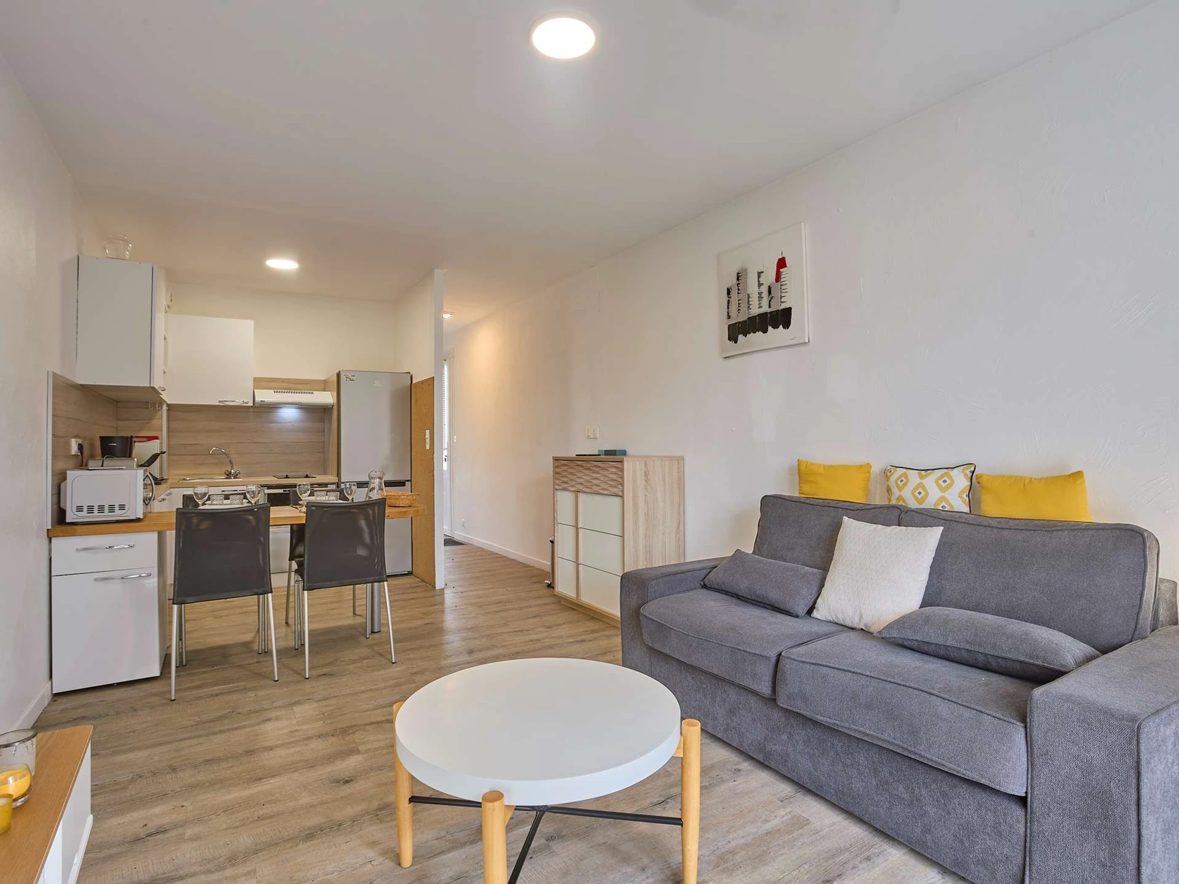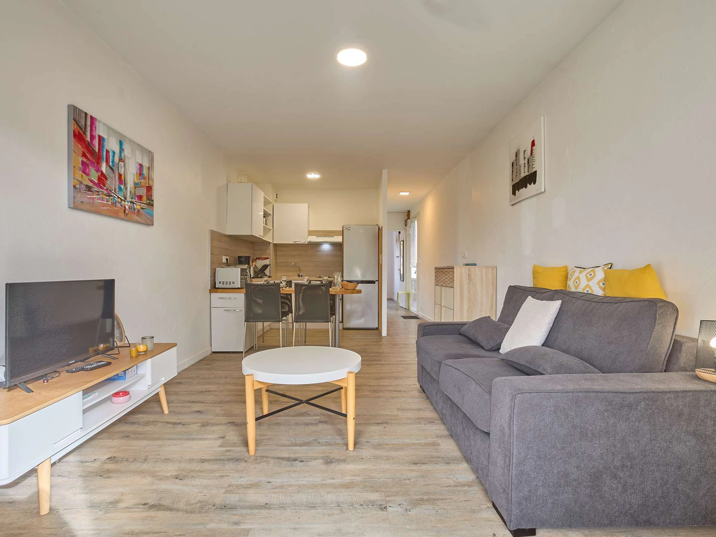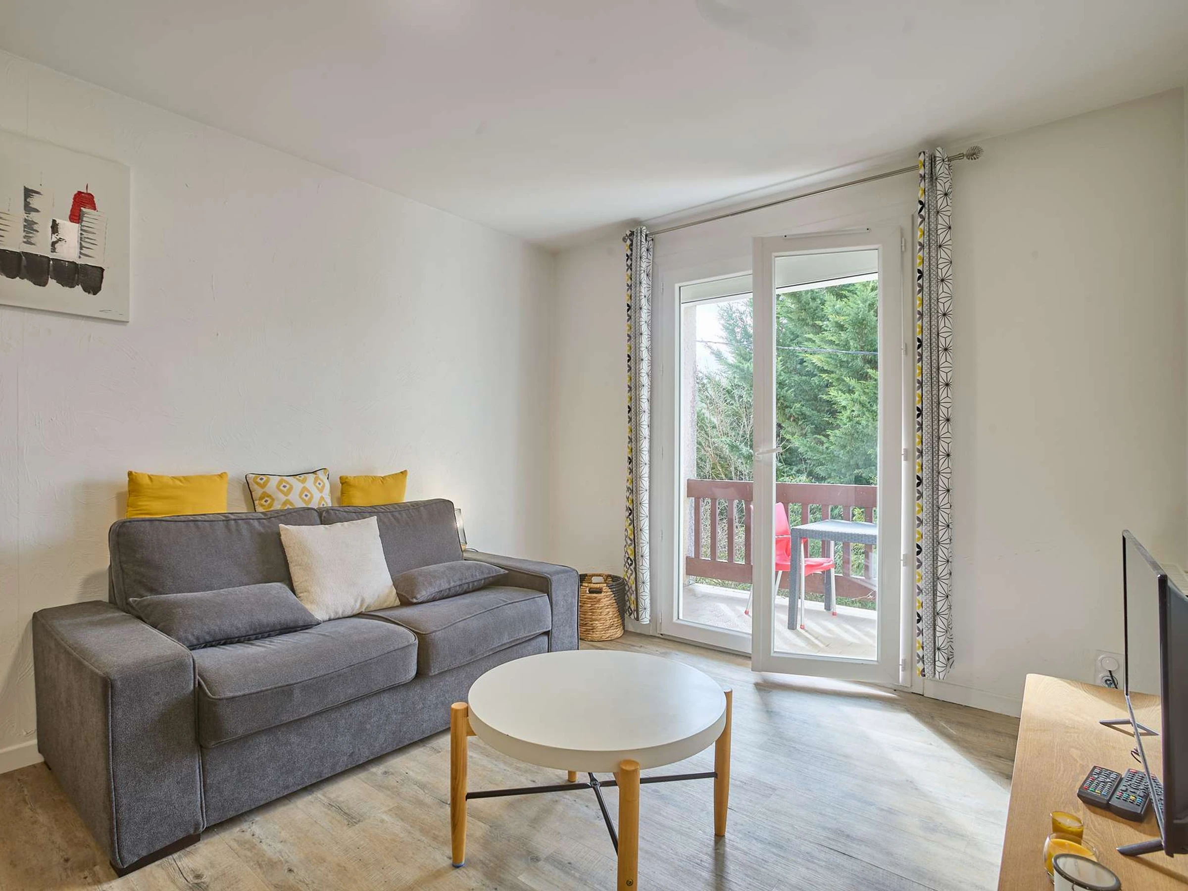 La grande pièce à vivre de 19 m² comprend une cuisine ouverte entièrement équipée (plaques vitrocéramiques, réfrigérateur-congélateur, lave-vaisselle, micro-ondes, mini-four), ainsi qu’un salon avec canapé convertible et téléviseur. Une porte-fenêtre apporte une belle luminosité et donne accès à un balcon exposé plein sud, aménagé avec un salon de jardin.