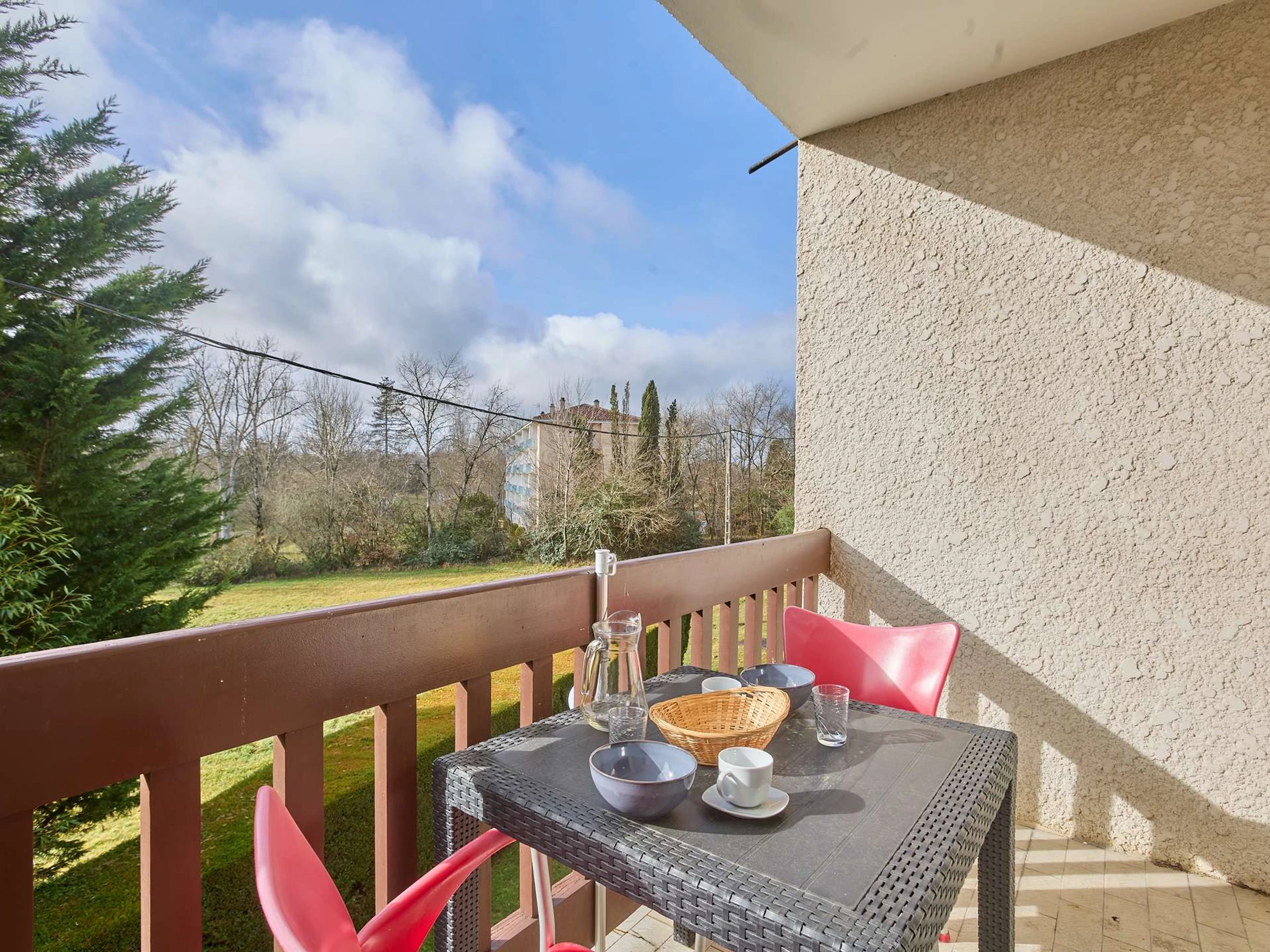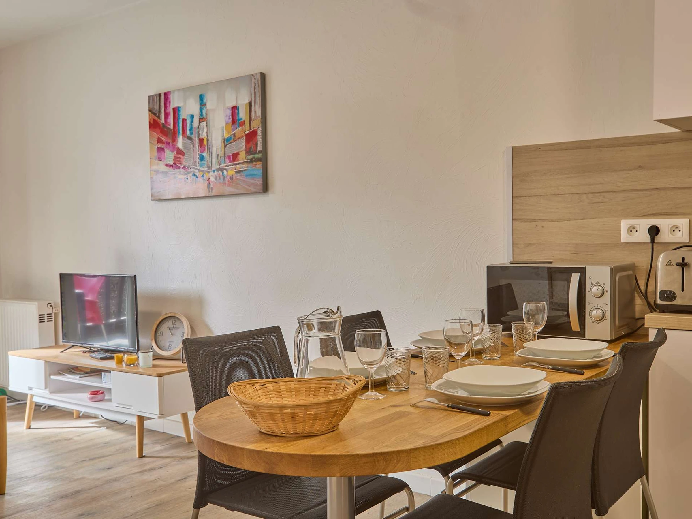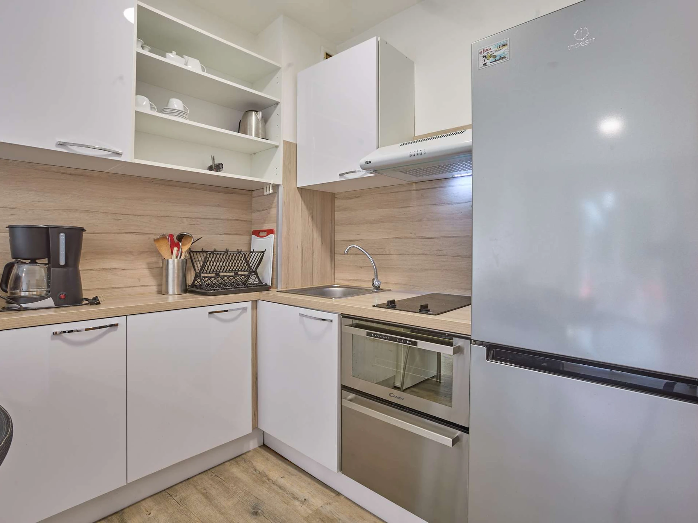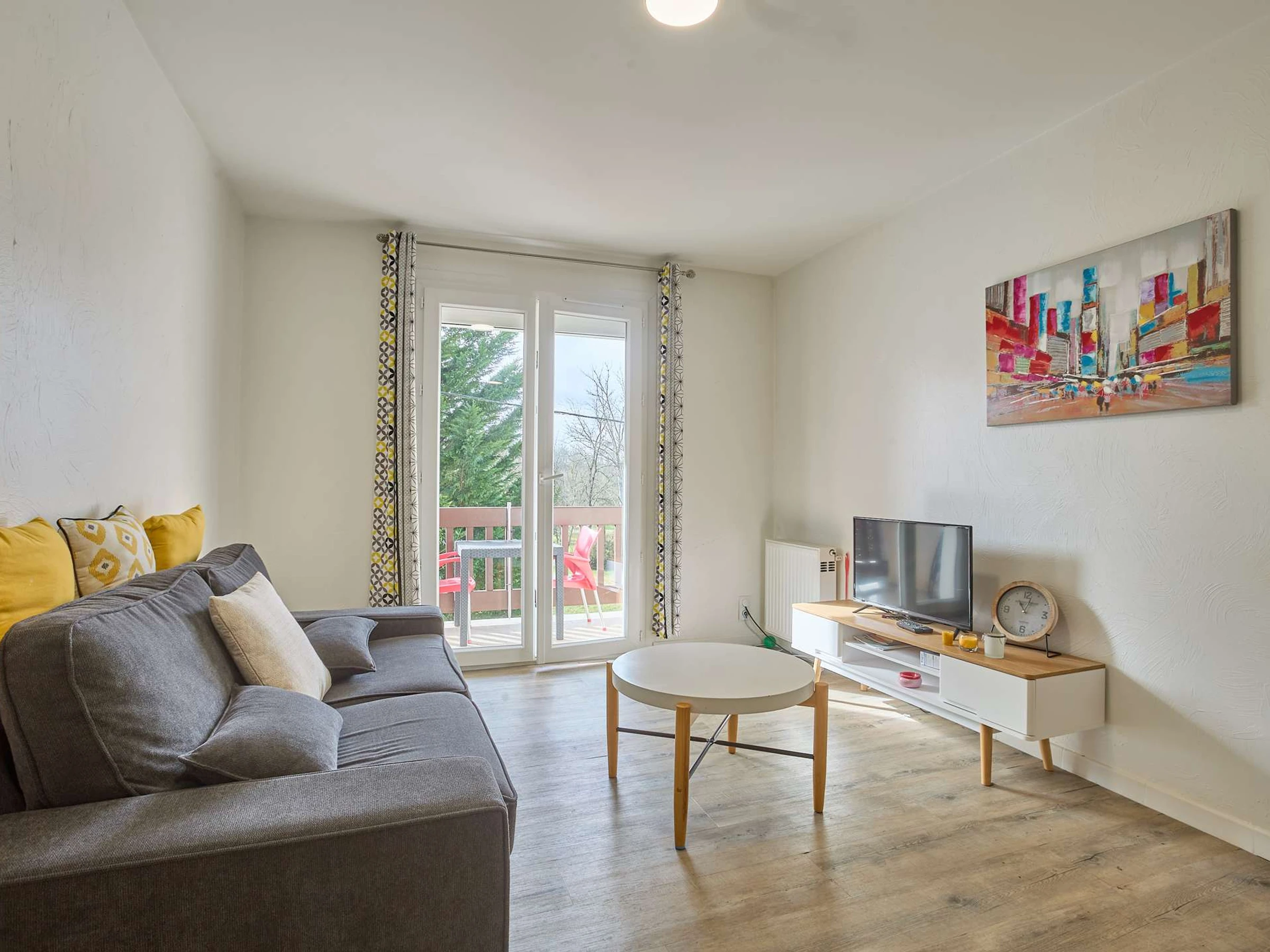 La grande pièce à vivre de 19 m² comprend une cuisine ouverte entièrement équipée (plaques vitrocéramiques, réfrigérateur-congélateur, lave-vaisselle, micro-ondes, mini-four), ainsi qu’un salon avec canapé convertible et téléviseur. Une porte-fenêtre apporte une belle luminosité et donne accès à un balcon exposé plein sud, aménagé avec un salon de jardin.