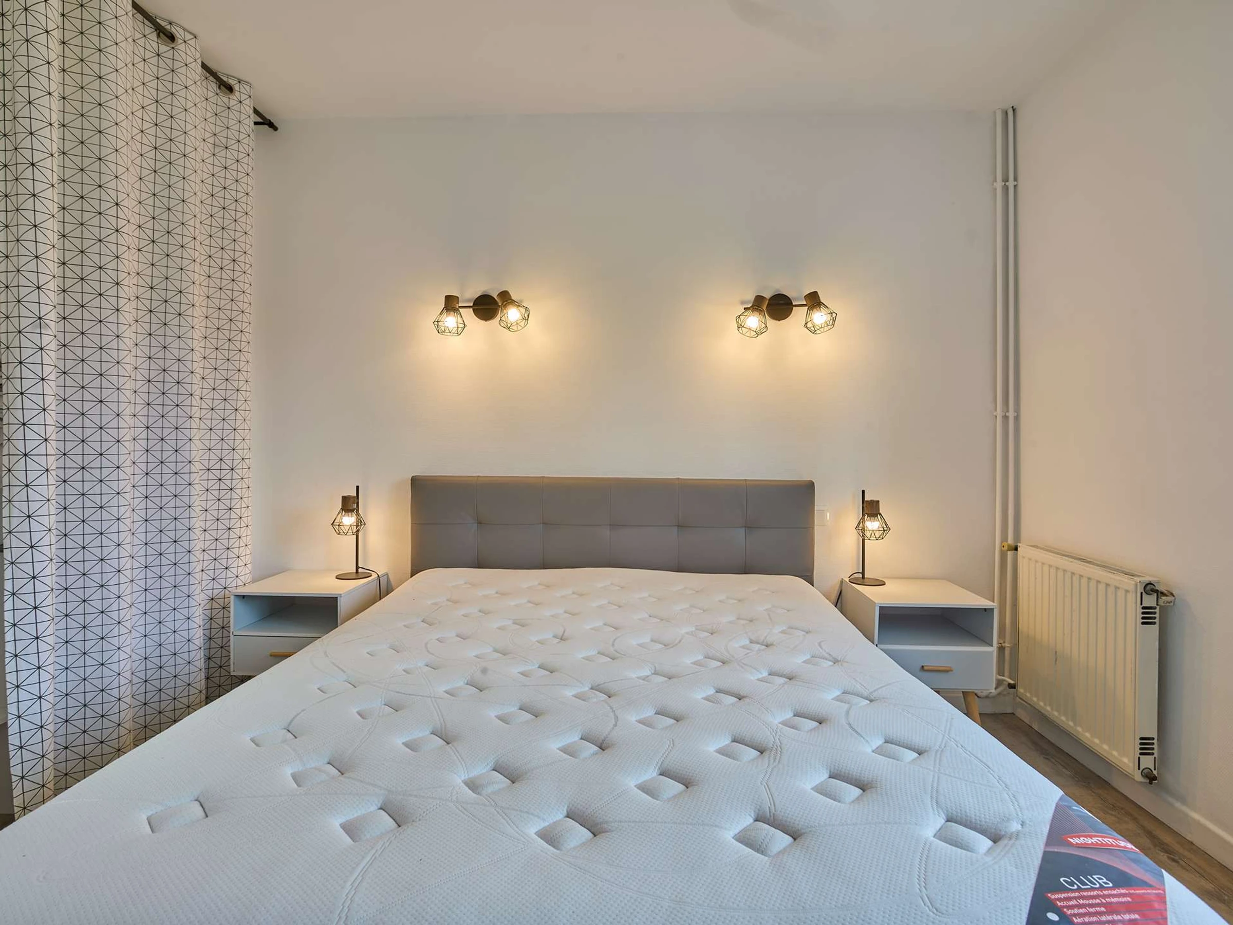 La chambre dispose d’un lit double (160 cm) et d’un grand placard de rangement.