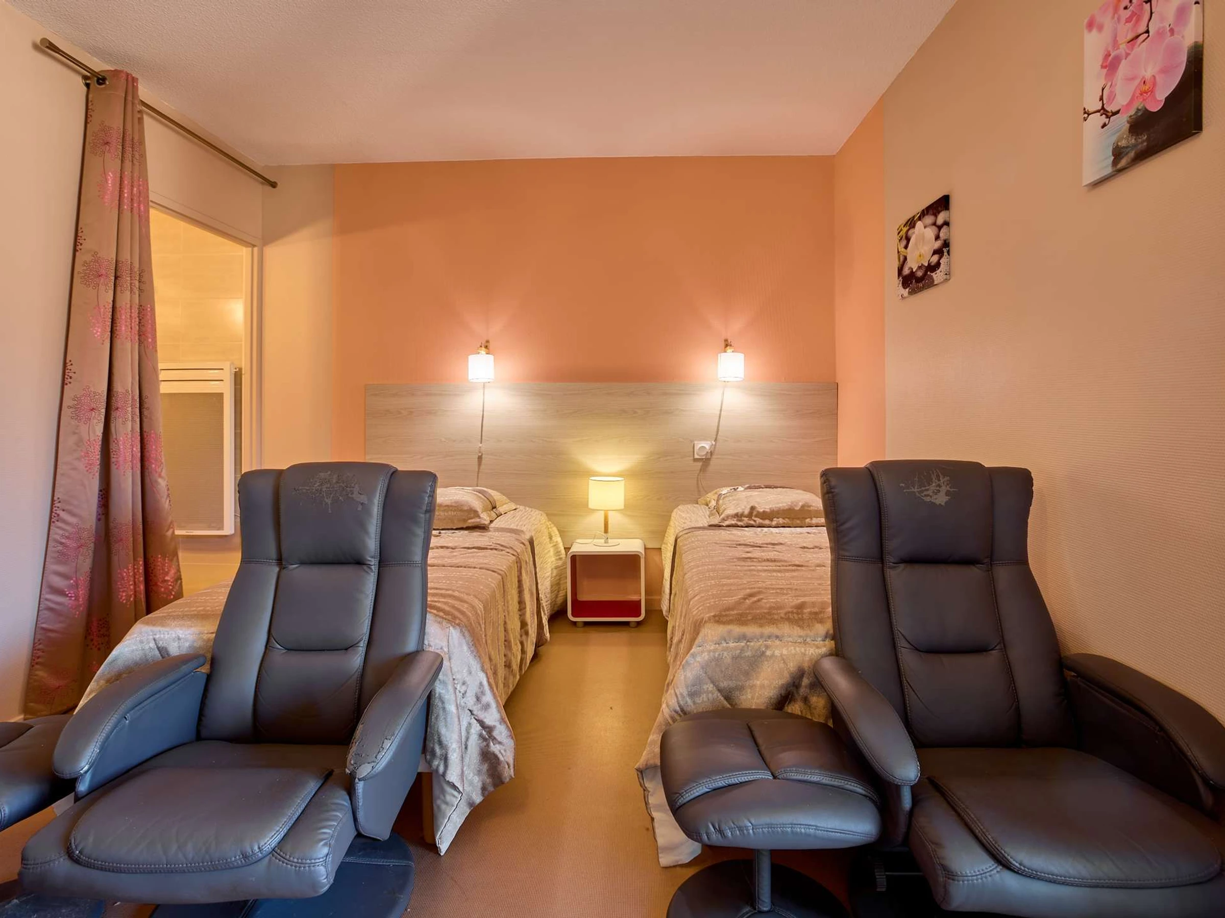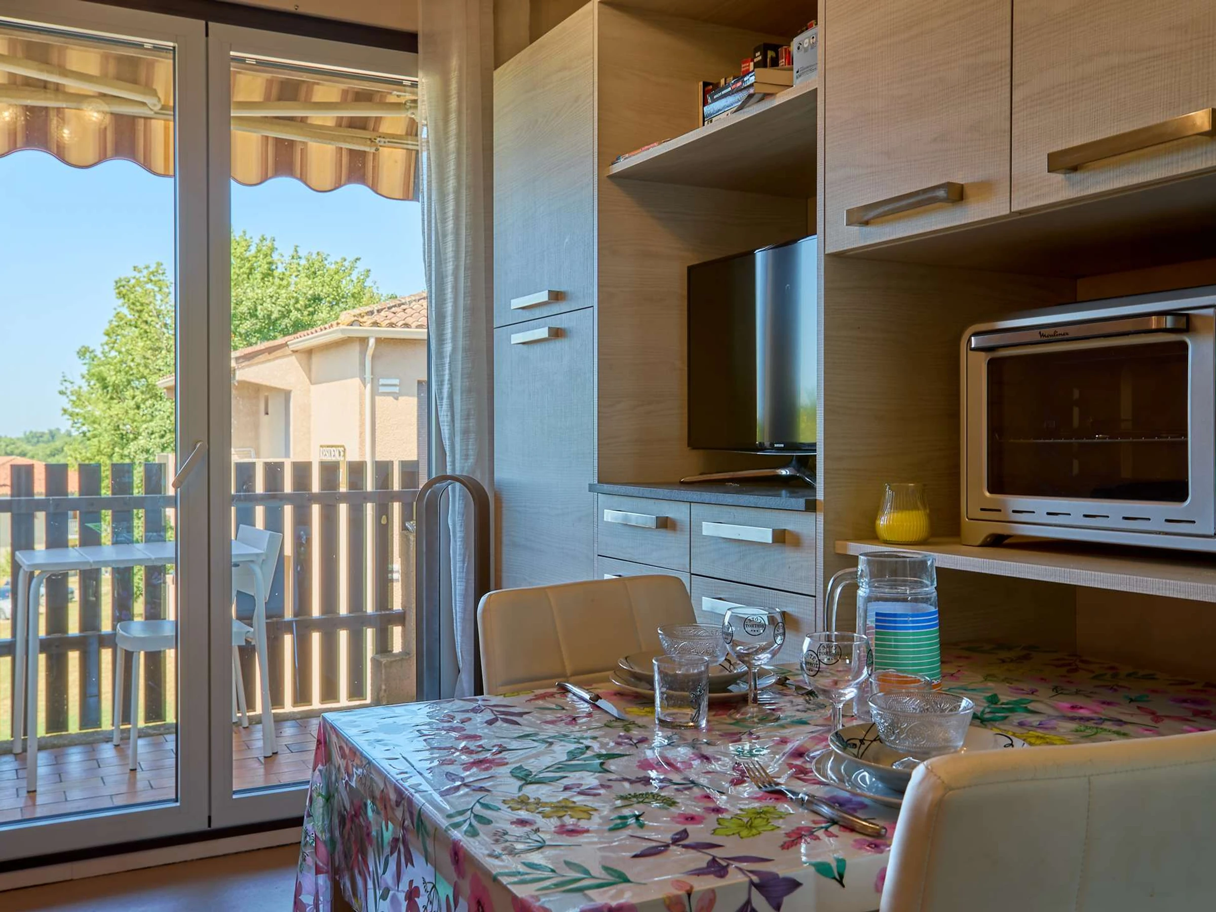 La pièce principale comprend une table avec fauteuils, un meuble TV, ainsi que deux lits simples de 90 cm pouvant être rapprochés selon vos besoins. La cuisine équipée dispose de tout le nécessaire pour votre séjour (plaques de cuisson, réfrigérateur, micro-ondes, rangements…).