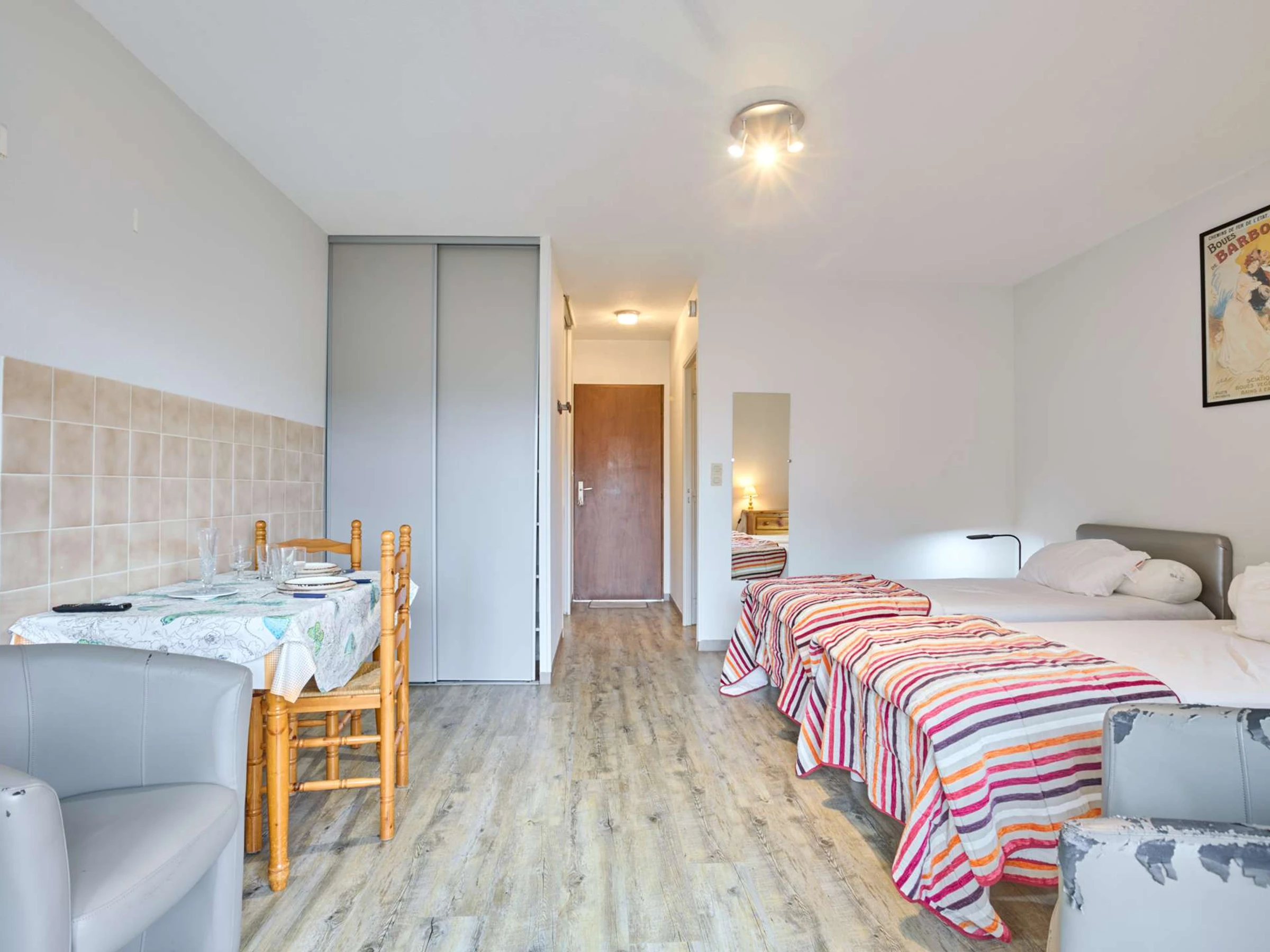 Studio de 26,5 m² situé au 1er étage, avec balcon et salon de jardin pour deux personnes. Il se compose d’une grande pièce principale avec coin repas, coin salon/TV, deux fauteuils et deux lits en 90.