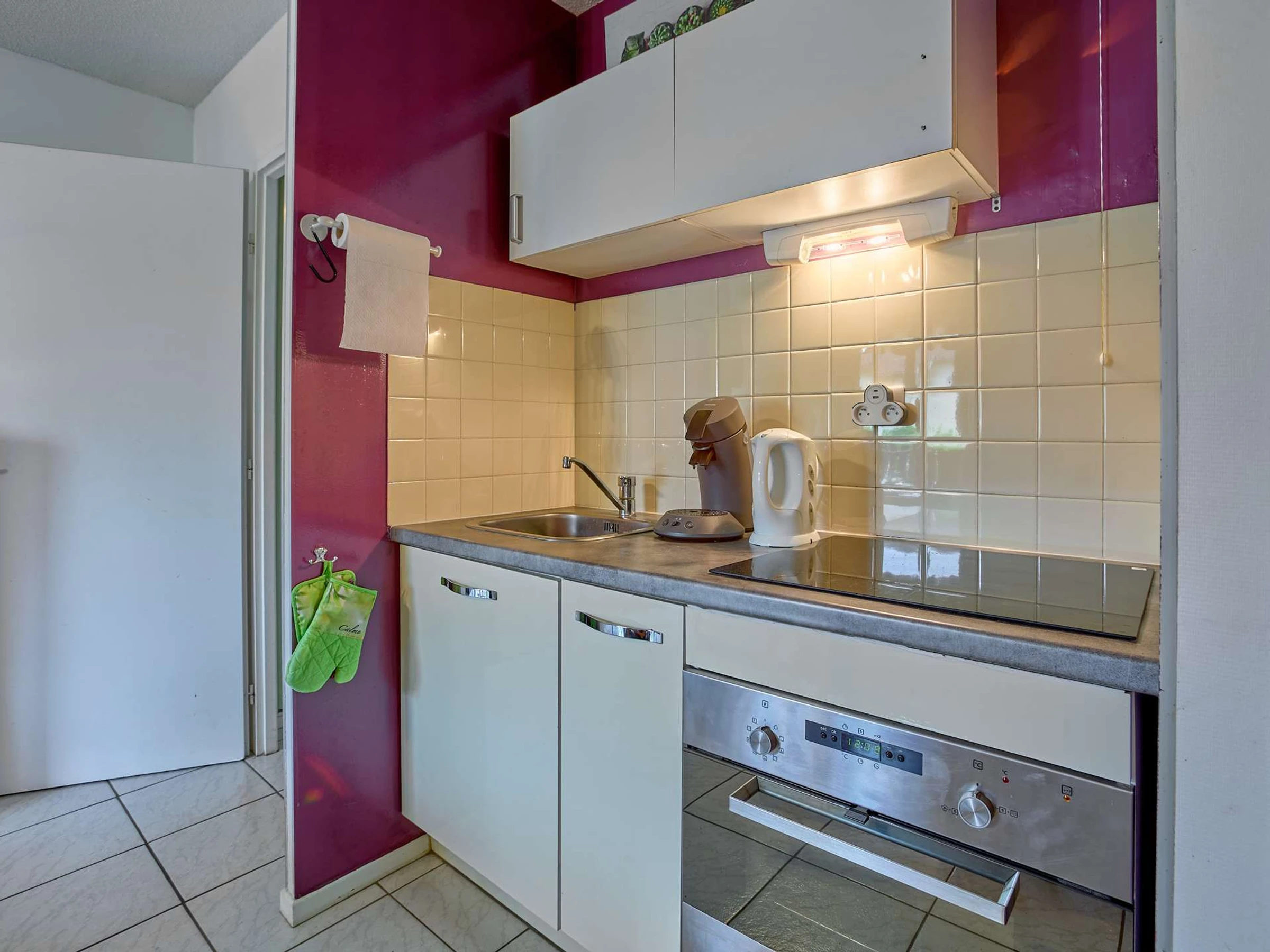 La pièce principale est aménagée avec une table et quatre chaises, deux fauteuils, une commode et une télévision. La cuisine est équipée de plaques à induction, d’un four électrique, d’un micro-ondes, d’un réfrigérateur et d’une cafetière.