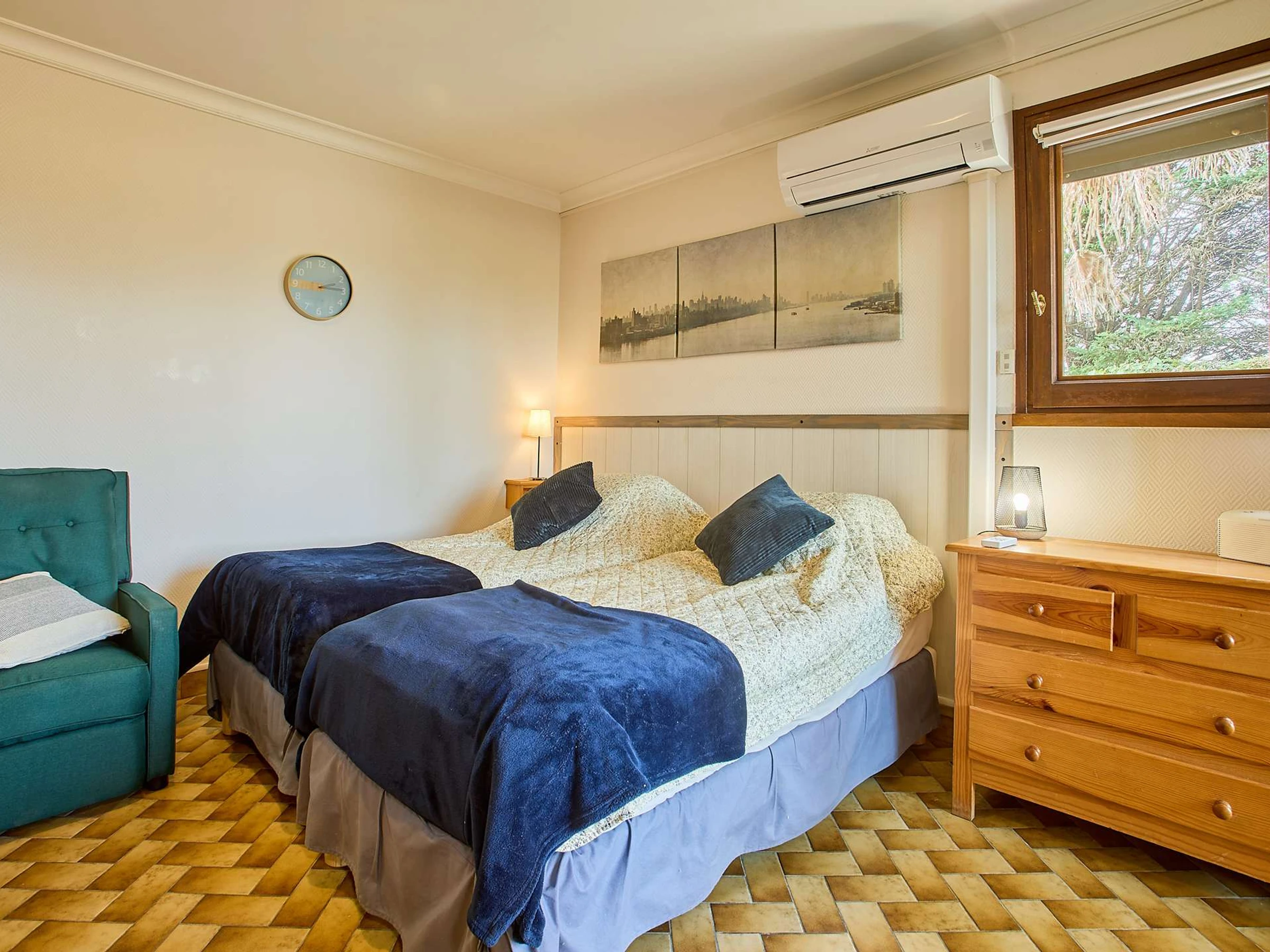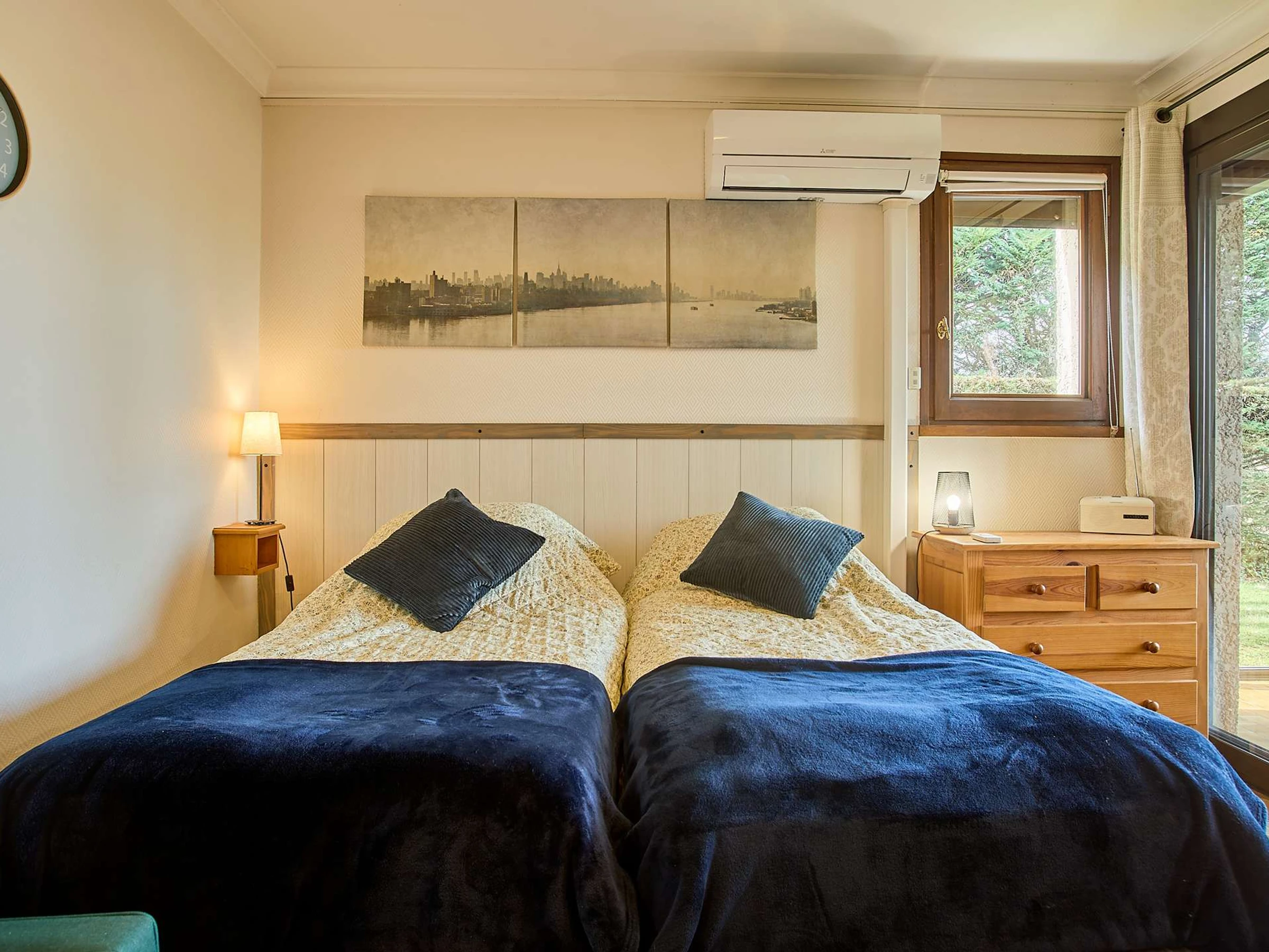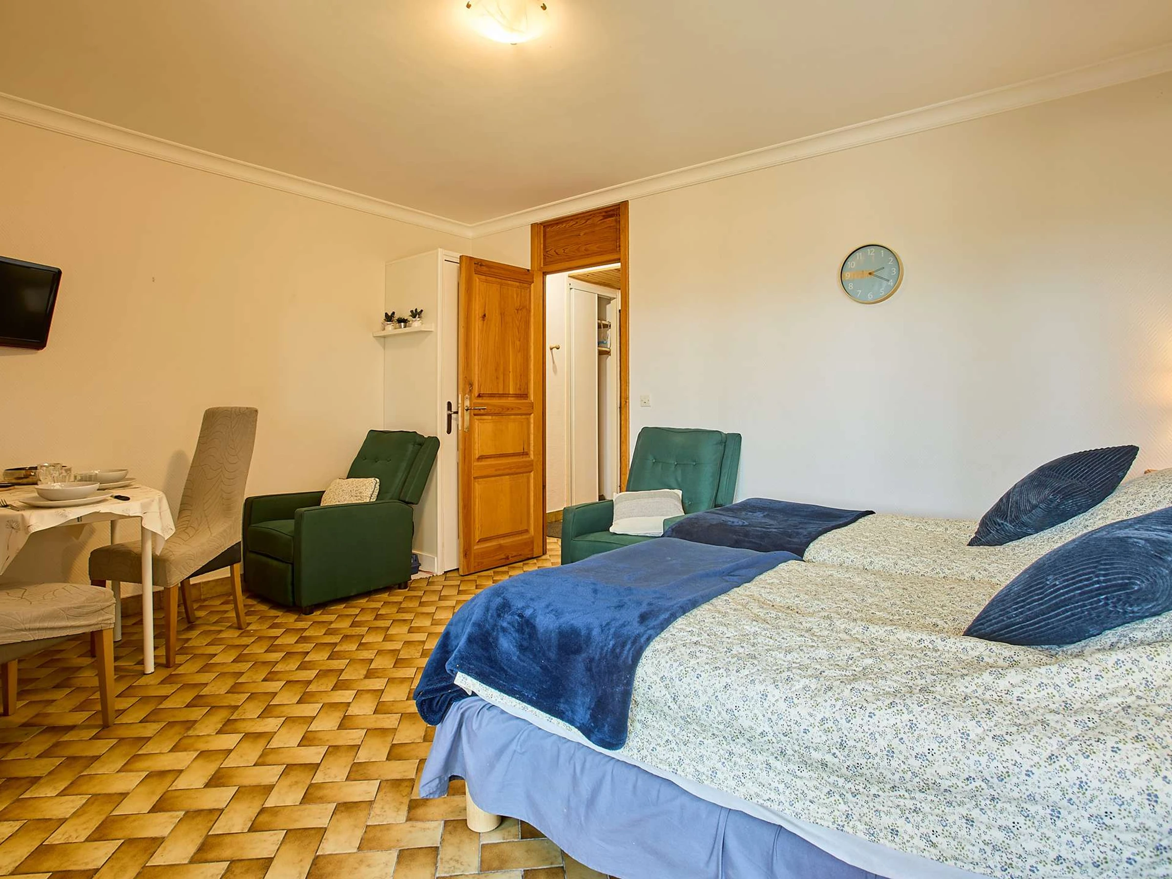 La pièce principale comprend un coin repas avec table et chaises, une commode, une télévision, ainsi qu’une cuisine fonctionnelle entièrement équipée : plaques électriques, réfrigérateur top avec freezer, micro-ondes et cafetière. Le coin nuit est aménagé avec deux lits en 90 et d'une climatisation.