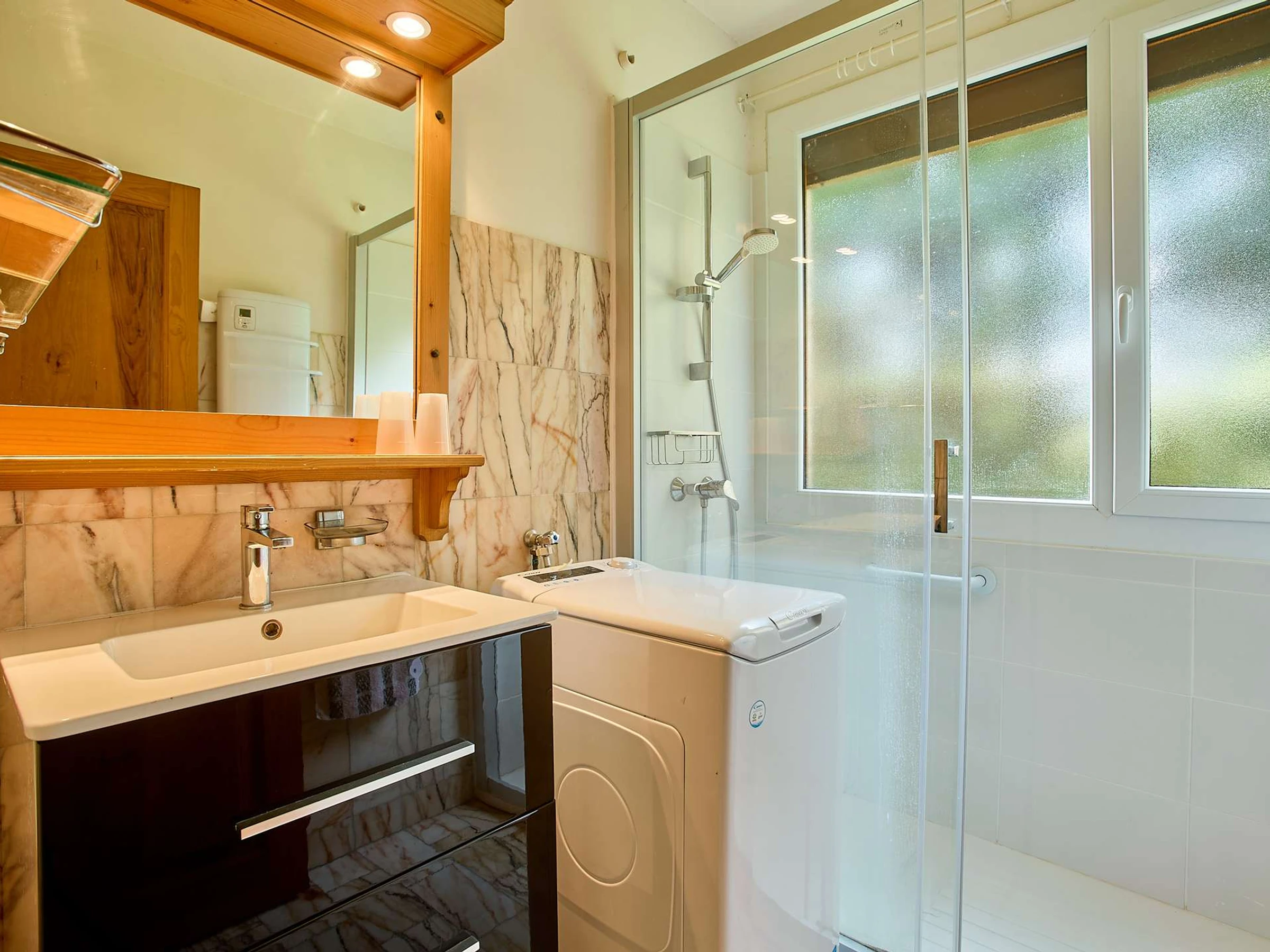 La salle d’eau se compose d’une douche, d’un meuble vasque, ainsi que d’un WC séparé.