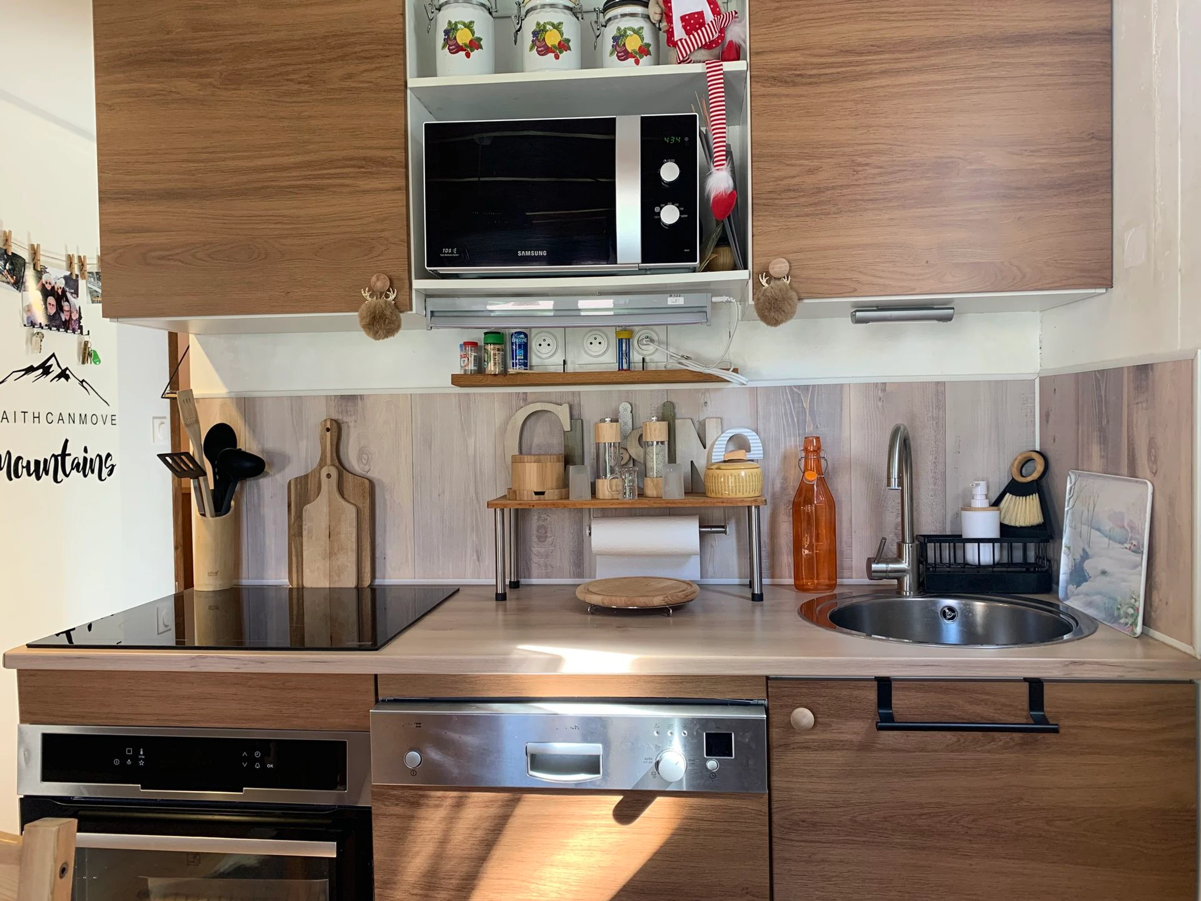 * Coin cuisine ouvert sur le séjour avec espace repas : plaque vitrocéramique, four, réfrigérateur/congélateur, lave vaisselle, micro-ondes, cafetière Nespresso, bouilloire, grille-pain, plancha électrique, placards de rangement ;