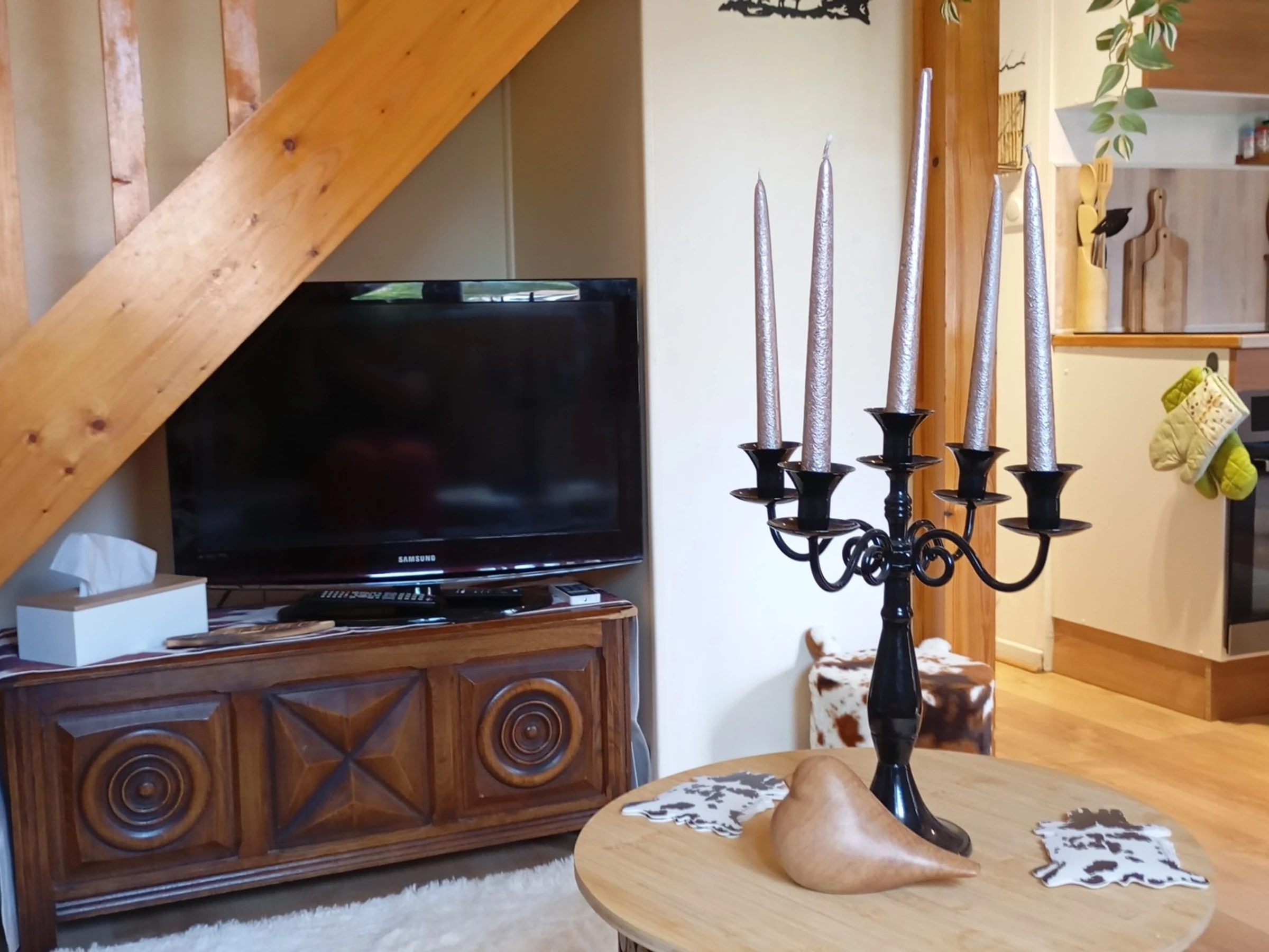 * Séjour cosy avec canapé d'angle, télévision, climatiseur réversible, accès terrasse ;