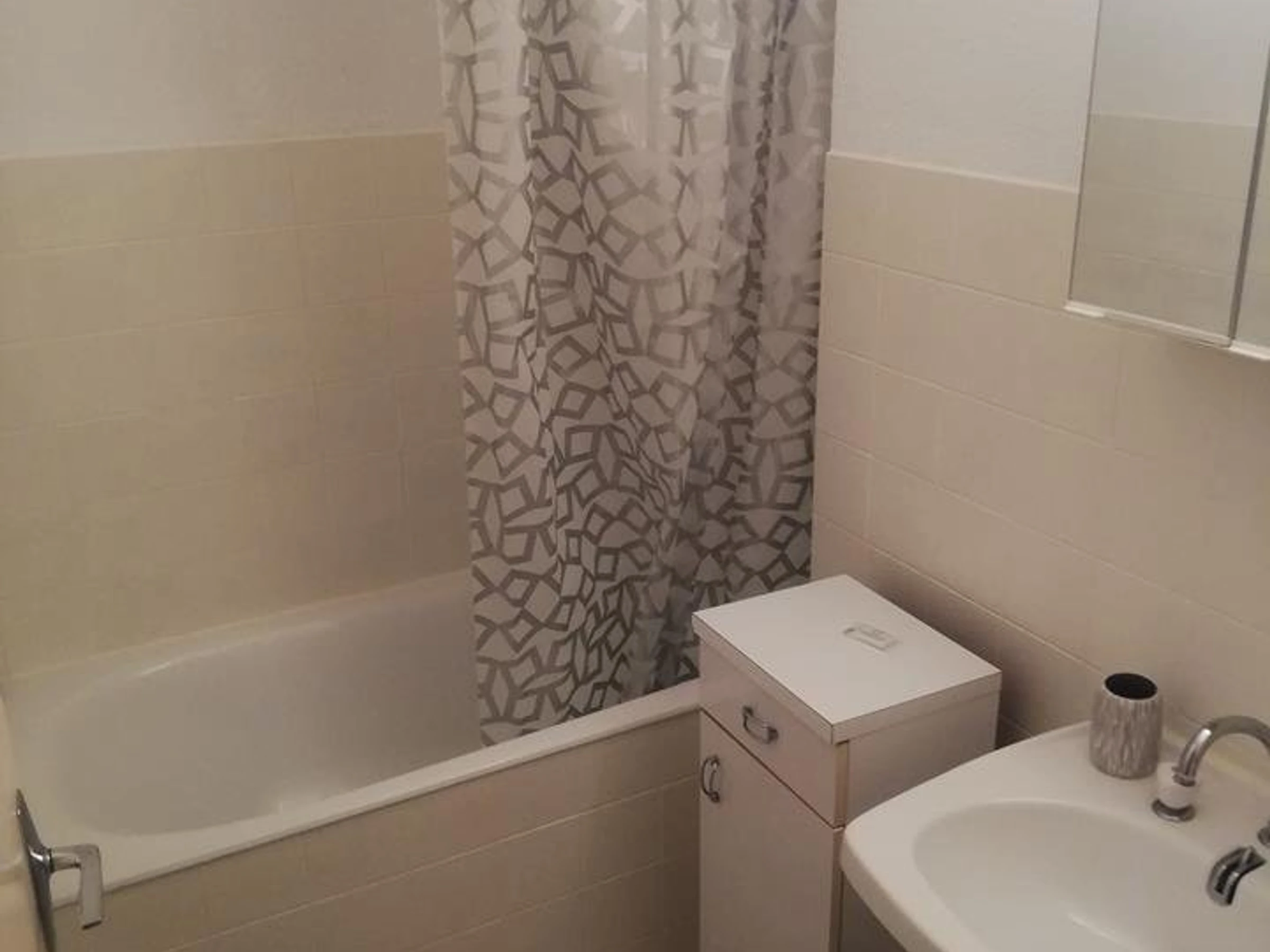 Salle de bain avec baignoire et chauffage électrique.