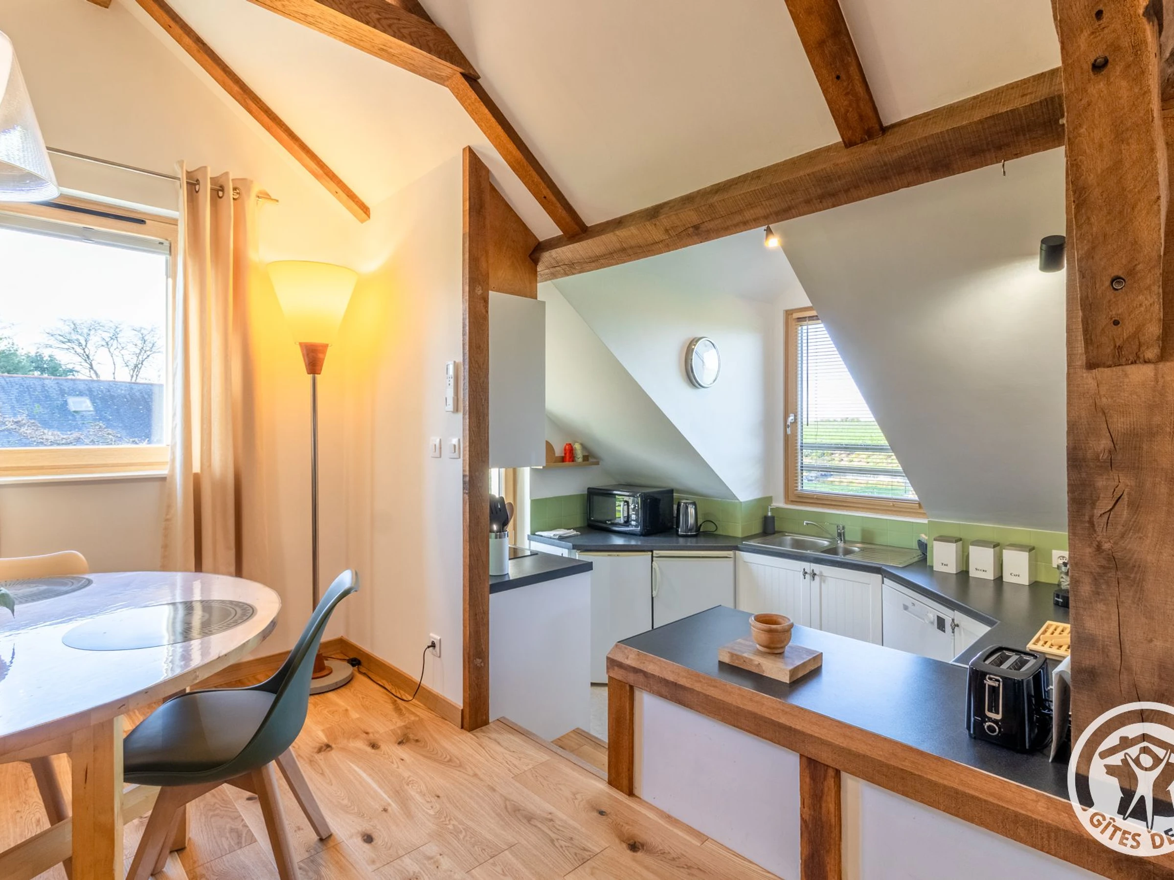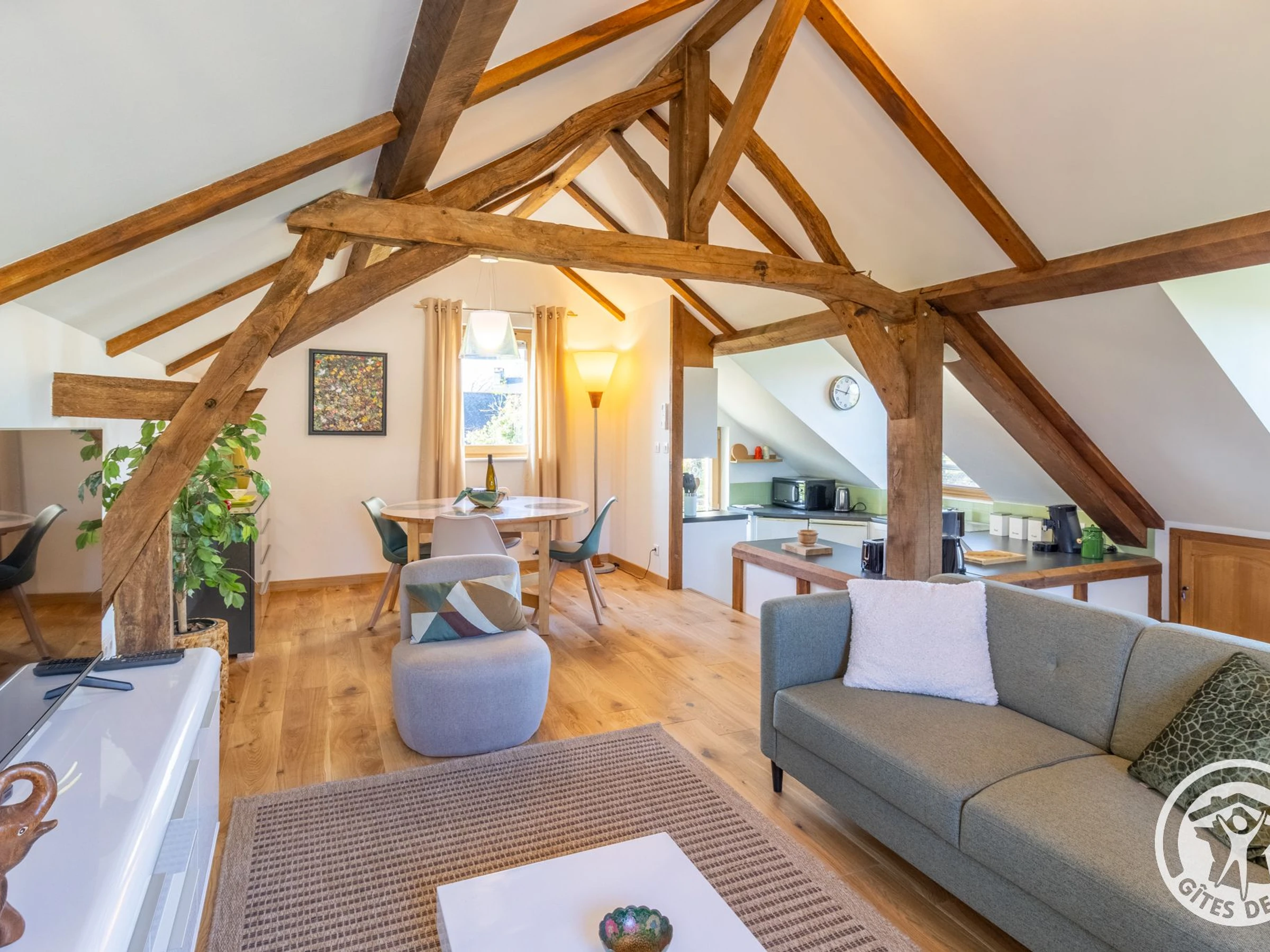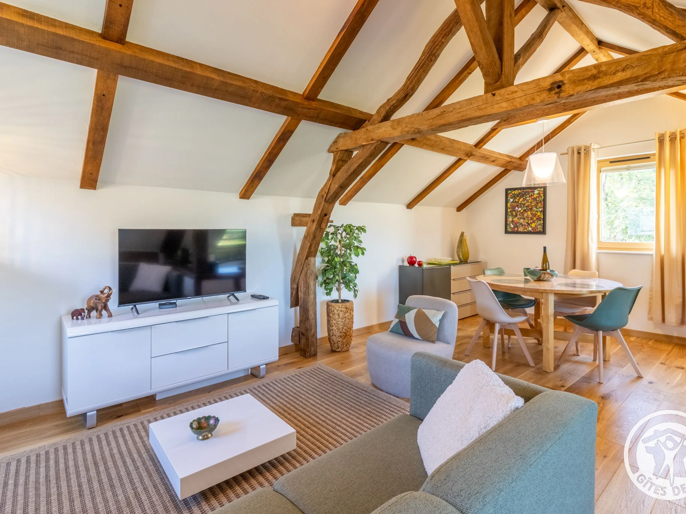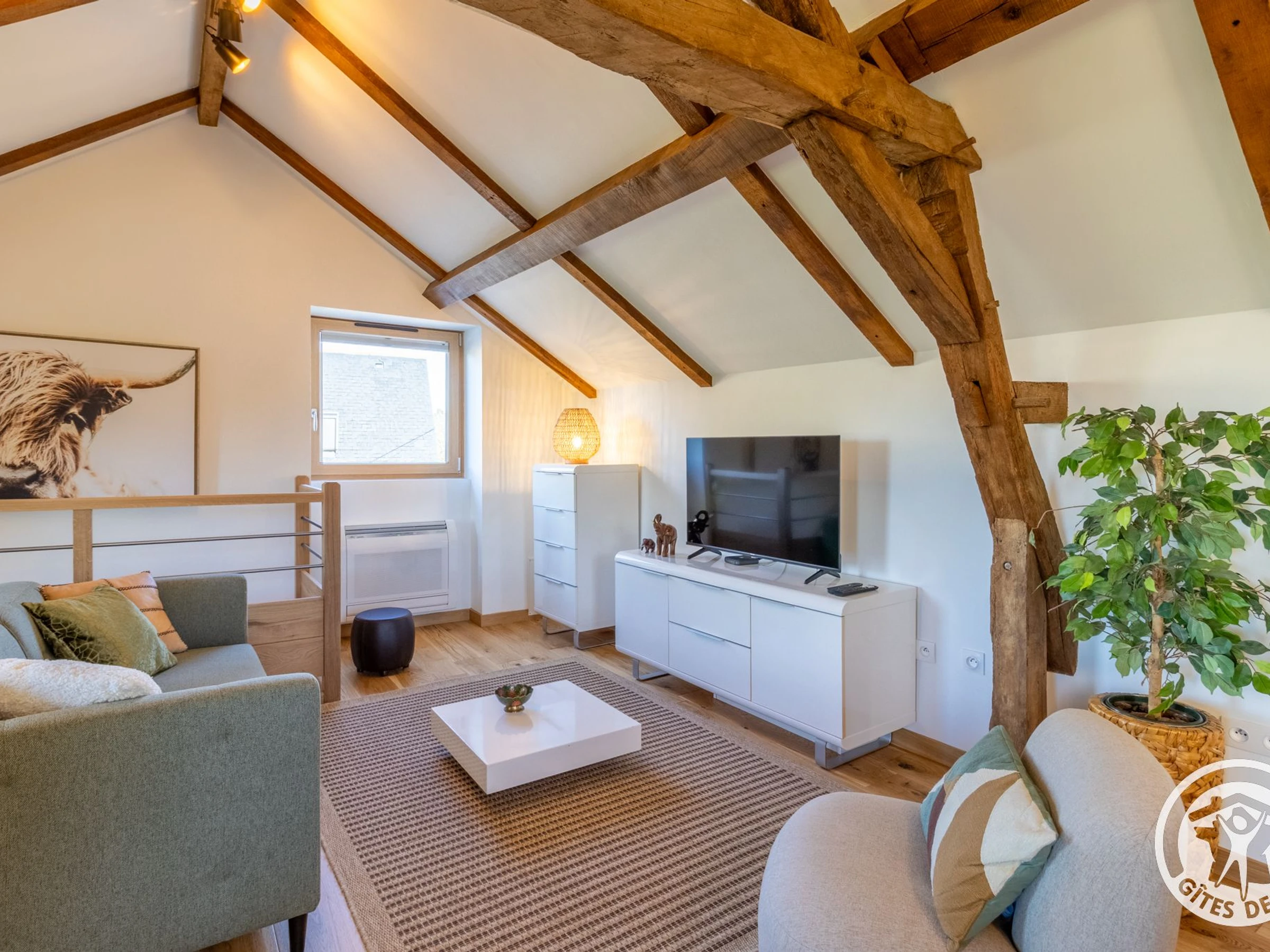 A l'étage, jolie pièce à vivre lumineuse et cosy avec salon et télévision, espace repas pour 4 personnes, cuisine équipée.