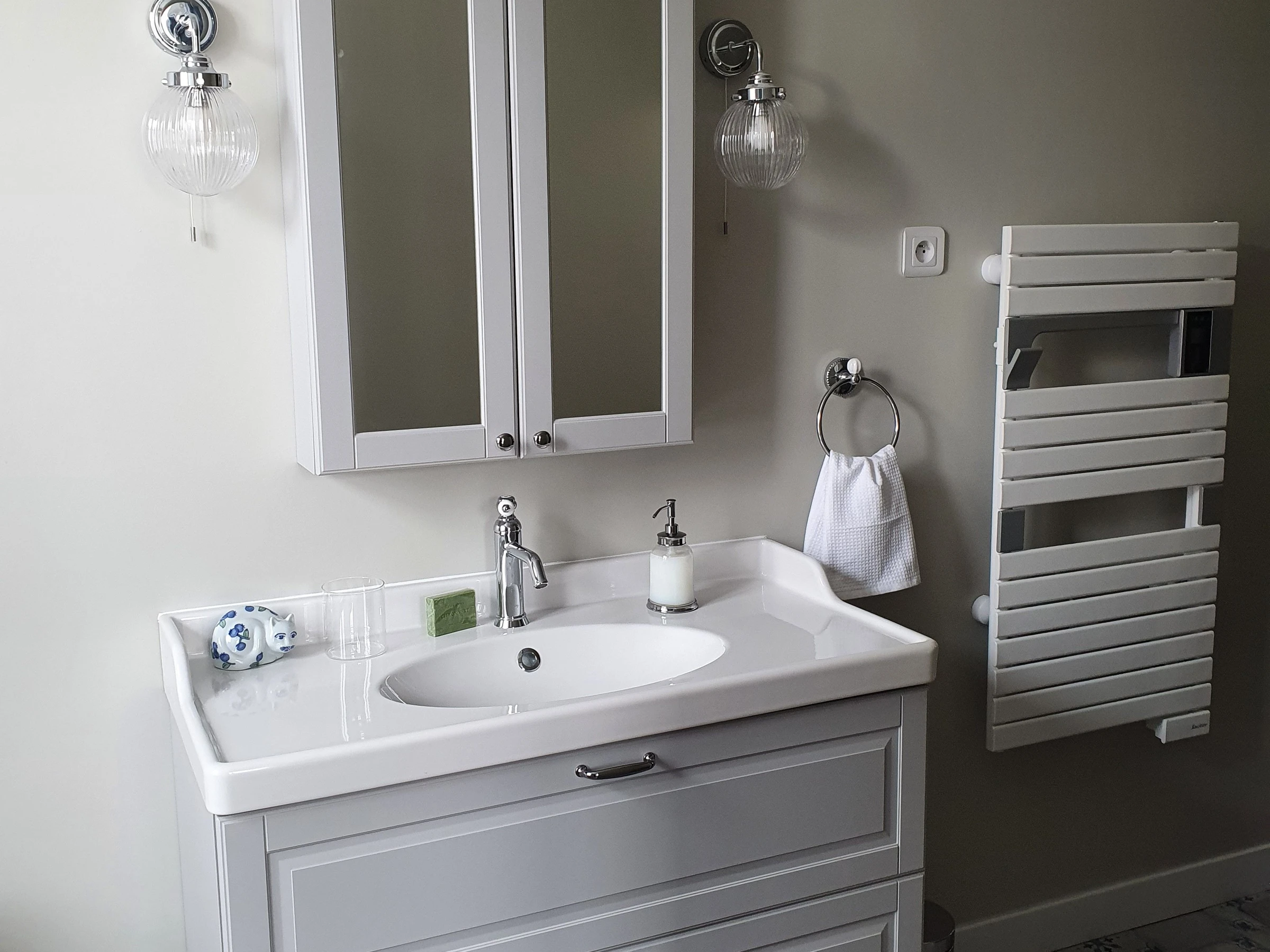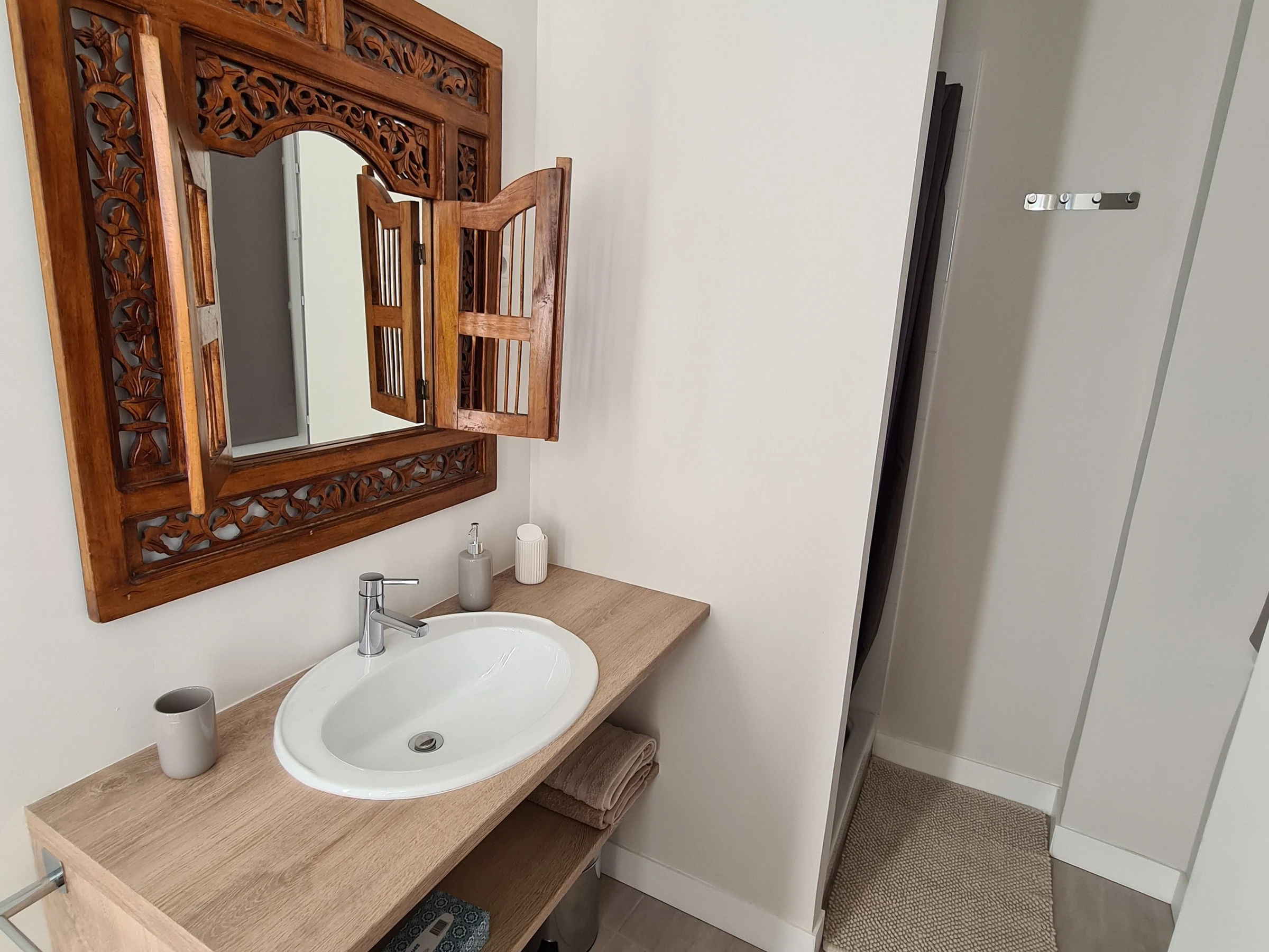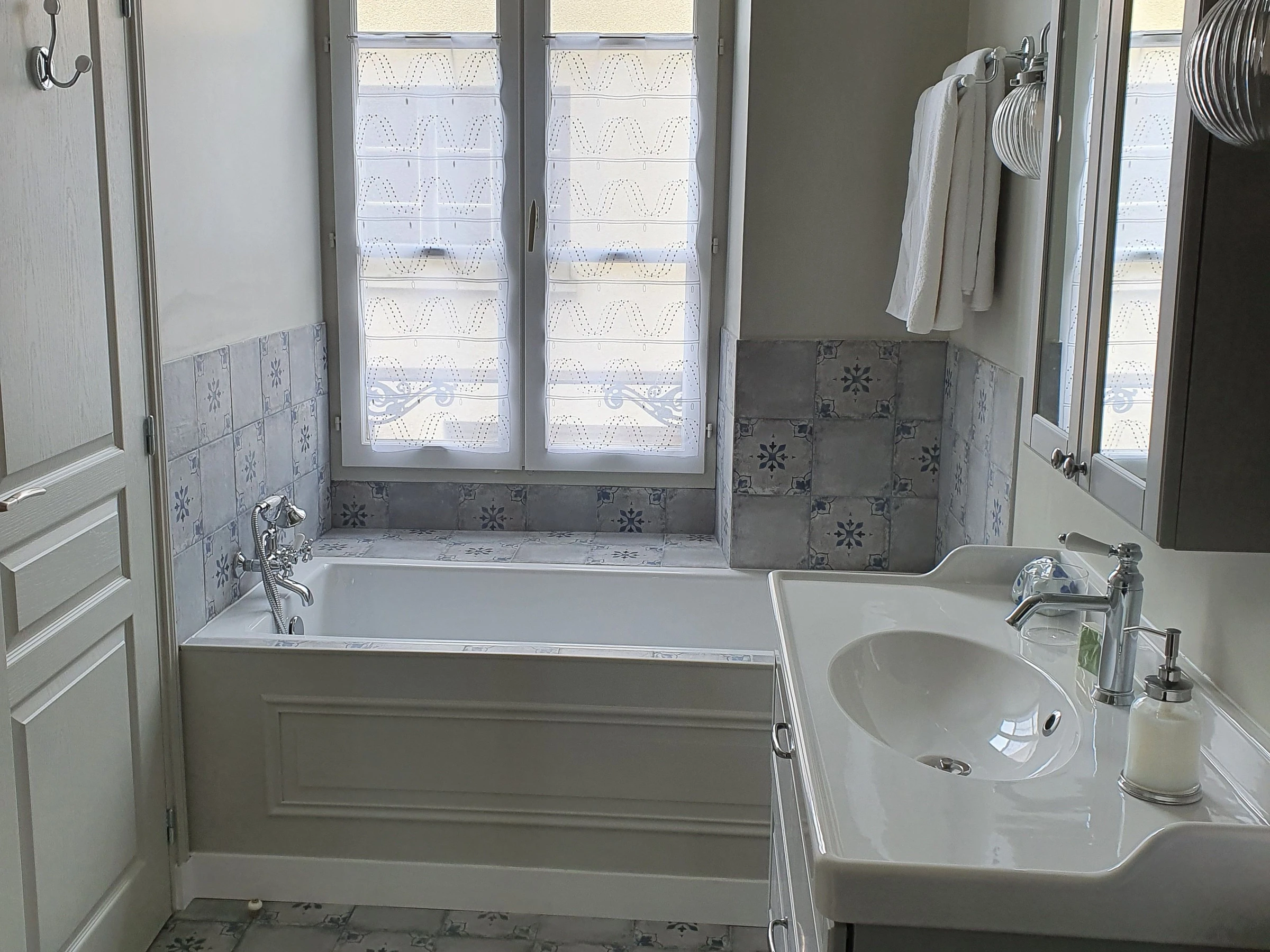 Au 1er étage, une magnifique chambre équipée d'un lit de 160 cm et sa salle de bain (douche et baignoire) wc et une autre chambre avec un couchage de 140 cm et sa salle d'eau et wc.
