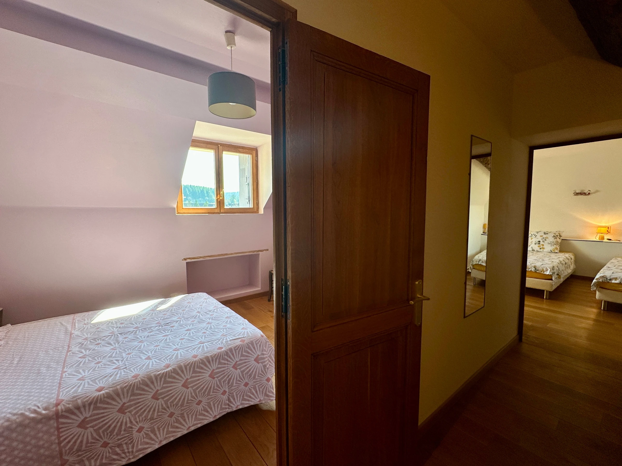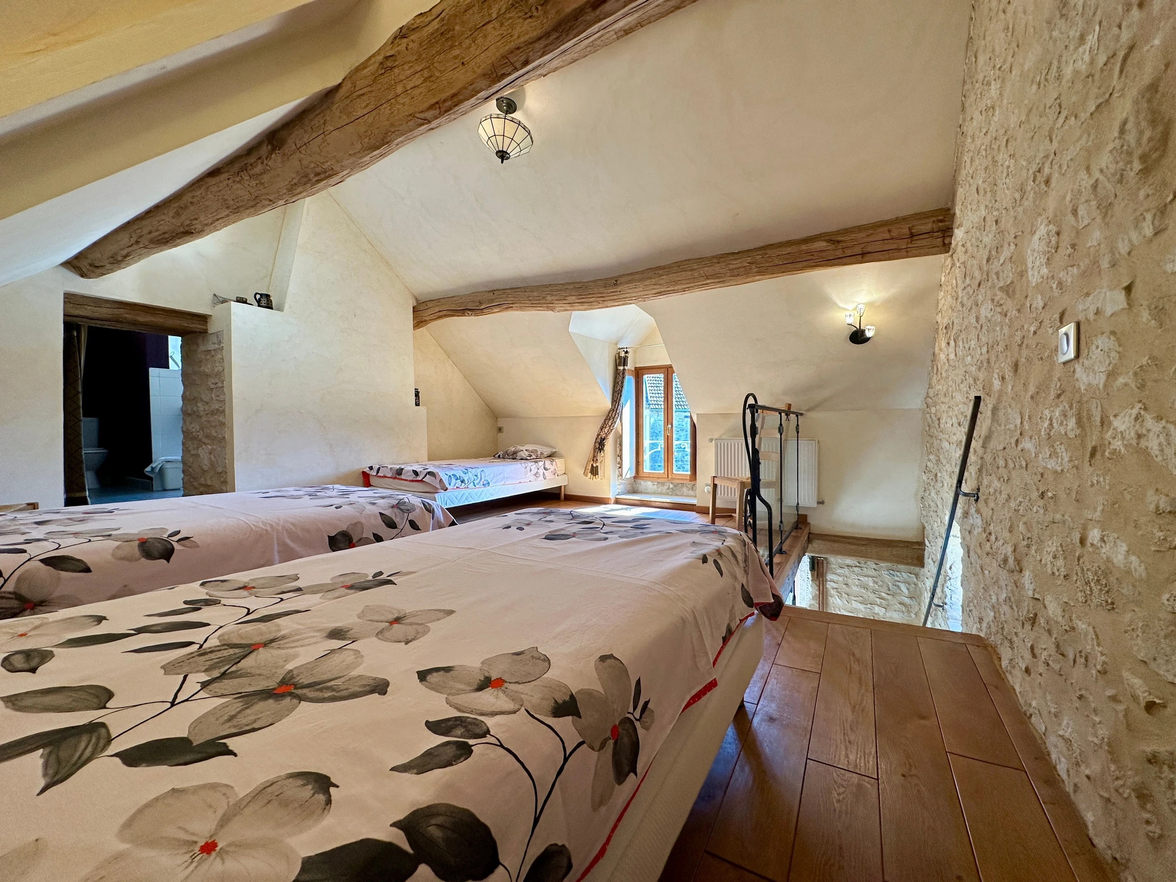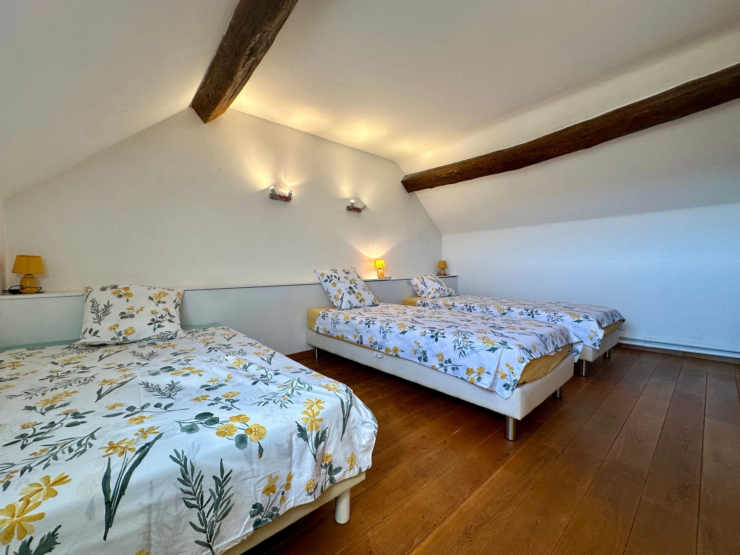 A l’étage, deux chambres, l’une dotée d’un lit 140x190cm et l’autre de trois lits (1 lit 120x190 cm et deux lits 90x210cm). Grande salle de bains avec douche et baignoire. WC indépendant.
