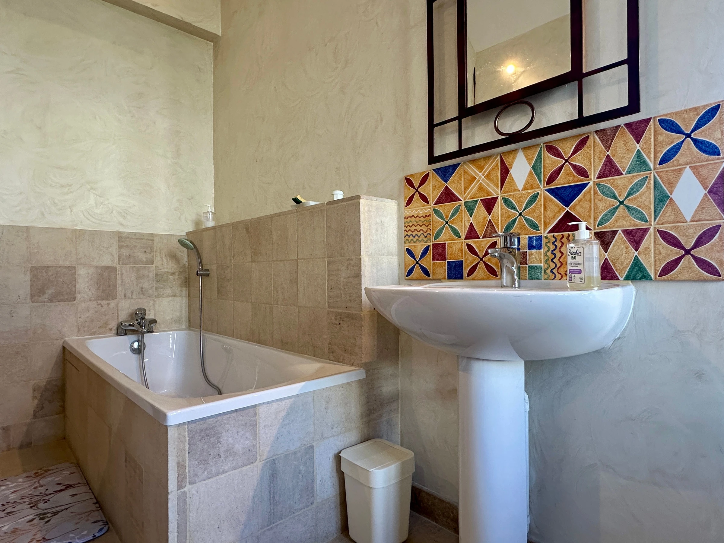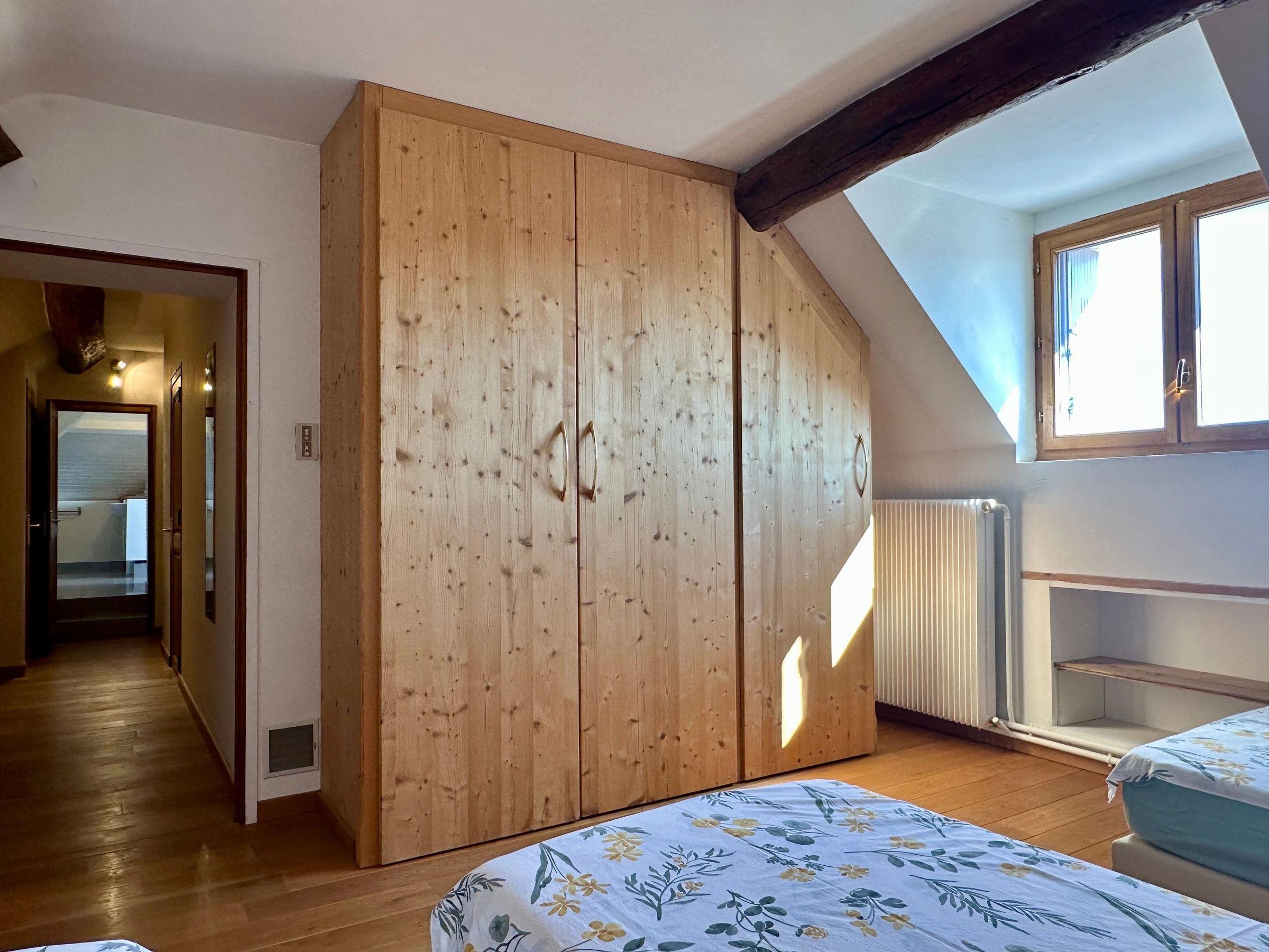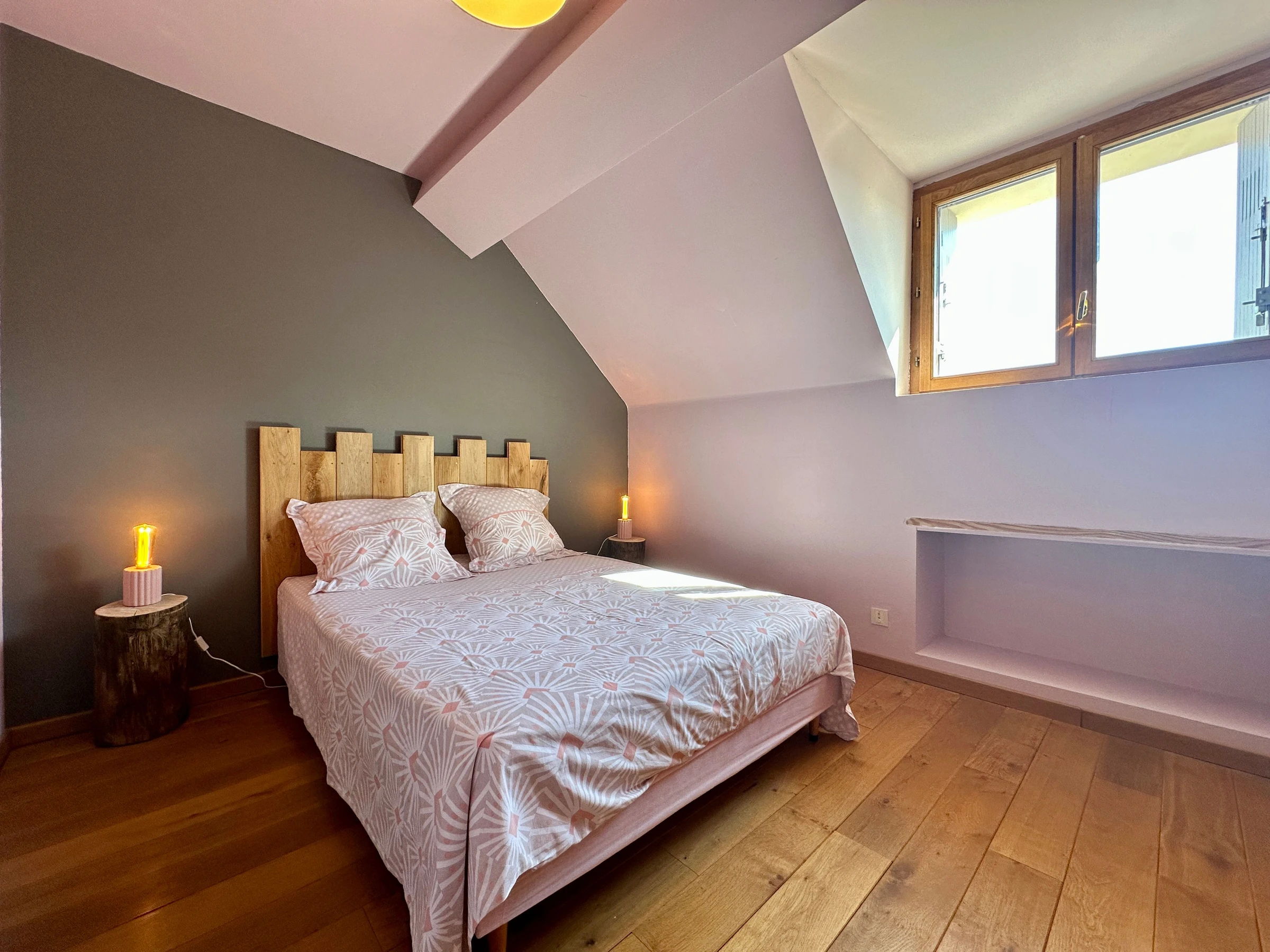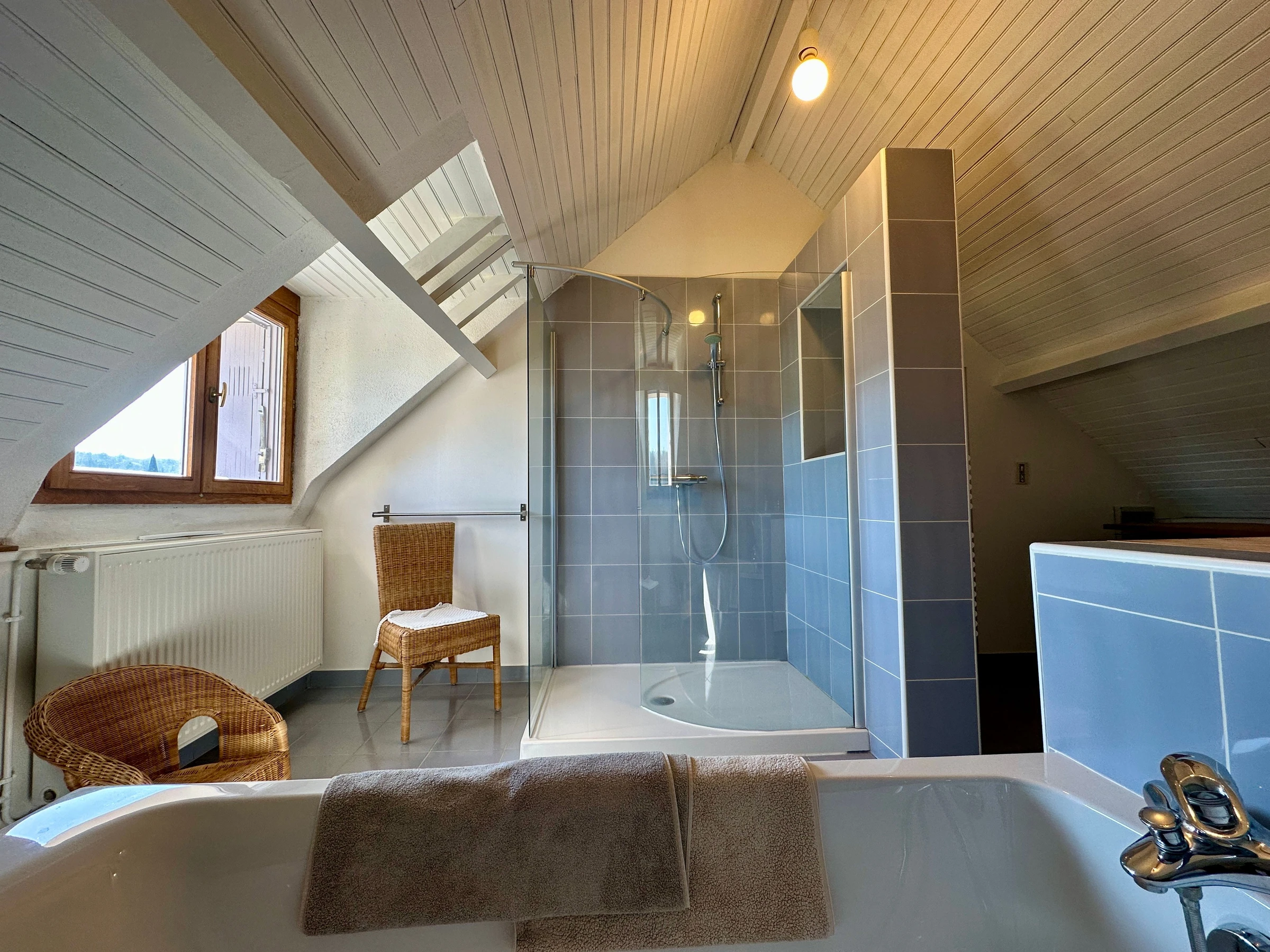 A l’étage, deux chambres, l’une dotée d’un lit 140x190cm et l’autre de trois lits (1 lit 120x190 cm et deux lits 90x210cm). Grande salle de bains avec douche et baignoire. WC indépendant.