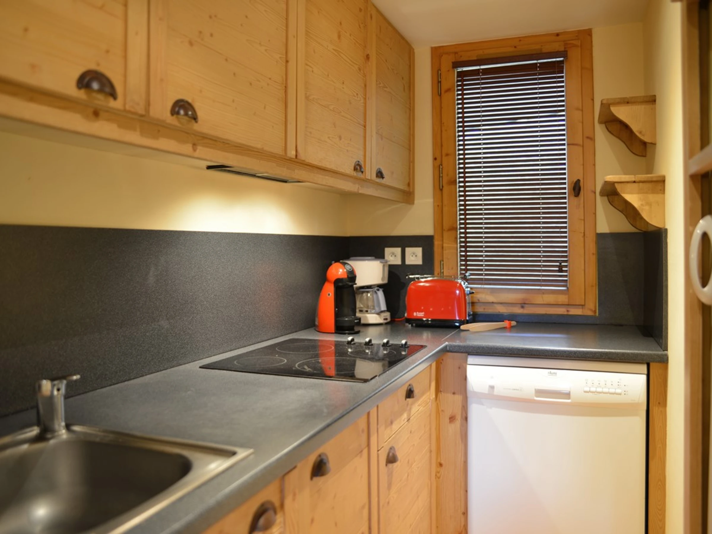 Cuisine ouverte : avec lave-vaisselle, four micro-ondes mixte, 4 plaques à inductions et 1 réfrigérateur.