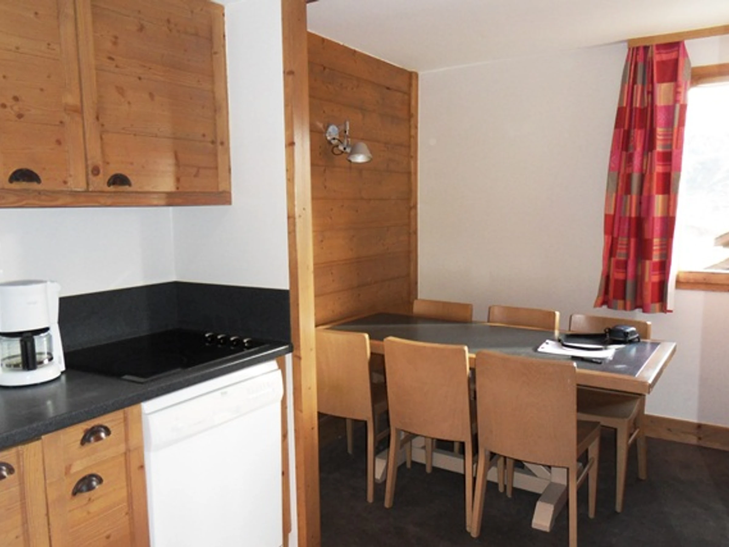 Cuisine: ouverte avec coin repas, équipée avec lave-vaisselle, 4 plaques vitro céramiques, micro-ondes grill + réfrigérateur