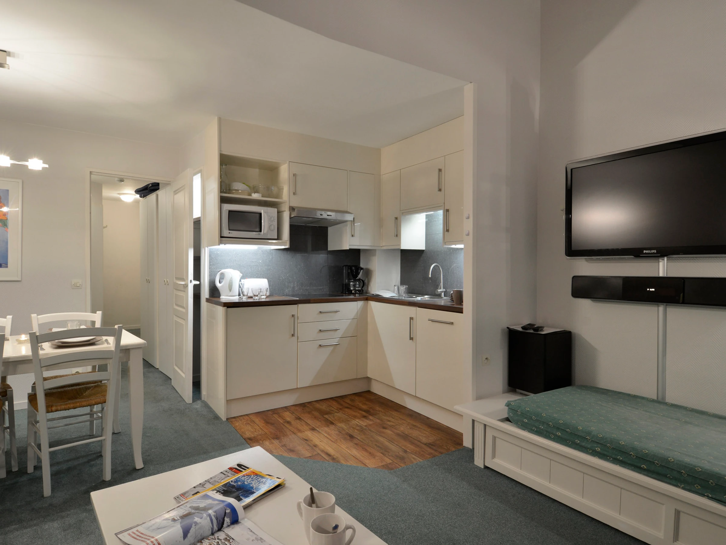 Cuisine : ouverte avec un micro-ondes grill, un lave-vaisselle, un réfrigérateur et 1 plaque vitro céramique 4 feux
