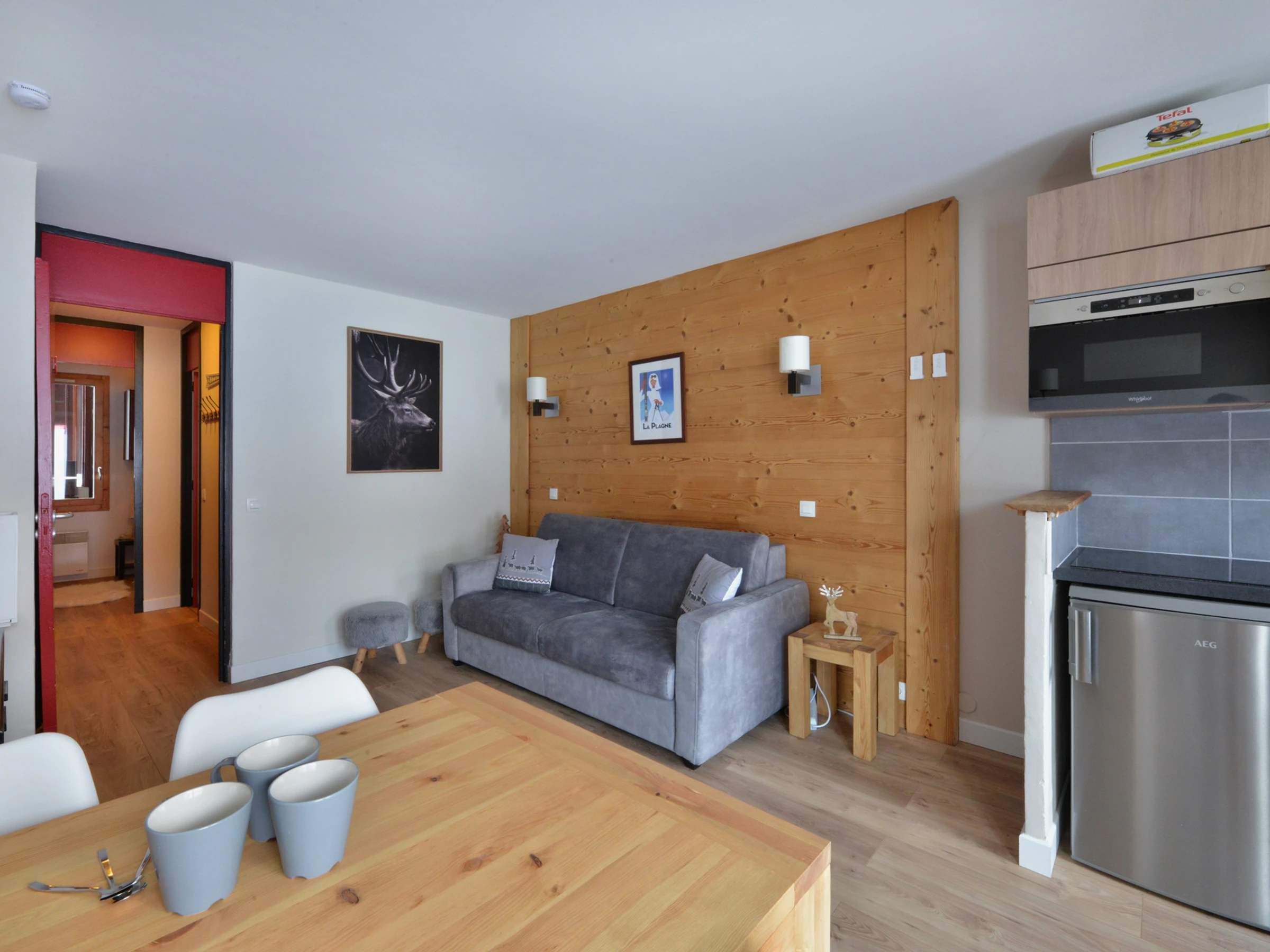 Cuisine : ouverte sur le séjour avec un micro-ondes grill, un lave-vaisselle et 1 plaque vitrocéramique 4 feux