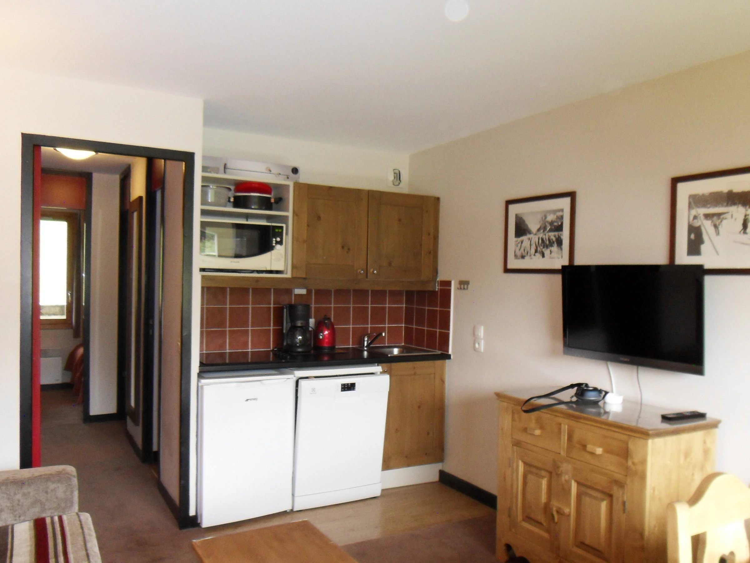 Cuisine : ouverte sur le séjour avec un micro-ondes grill, un lave-vaisselle et 1 plaque vitrocéramique 4 feux