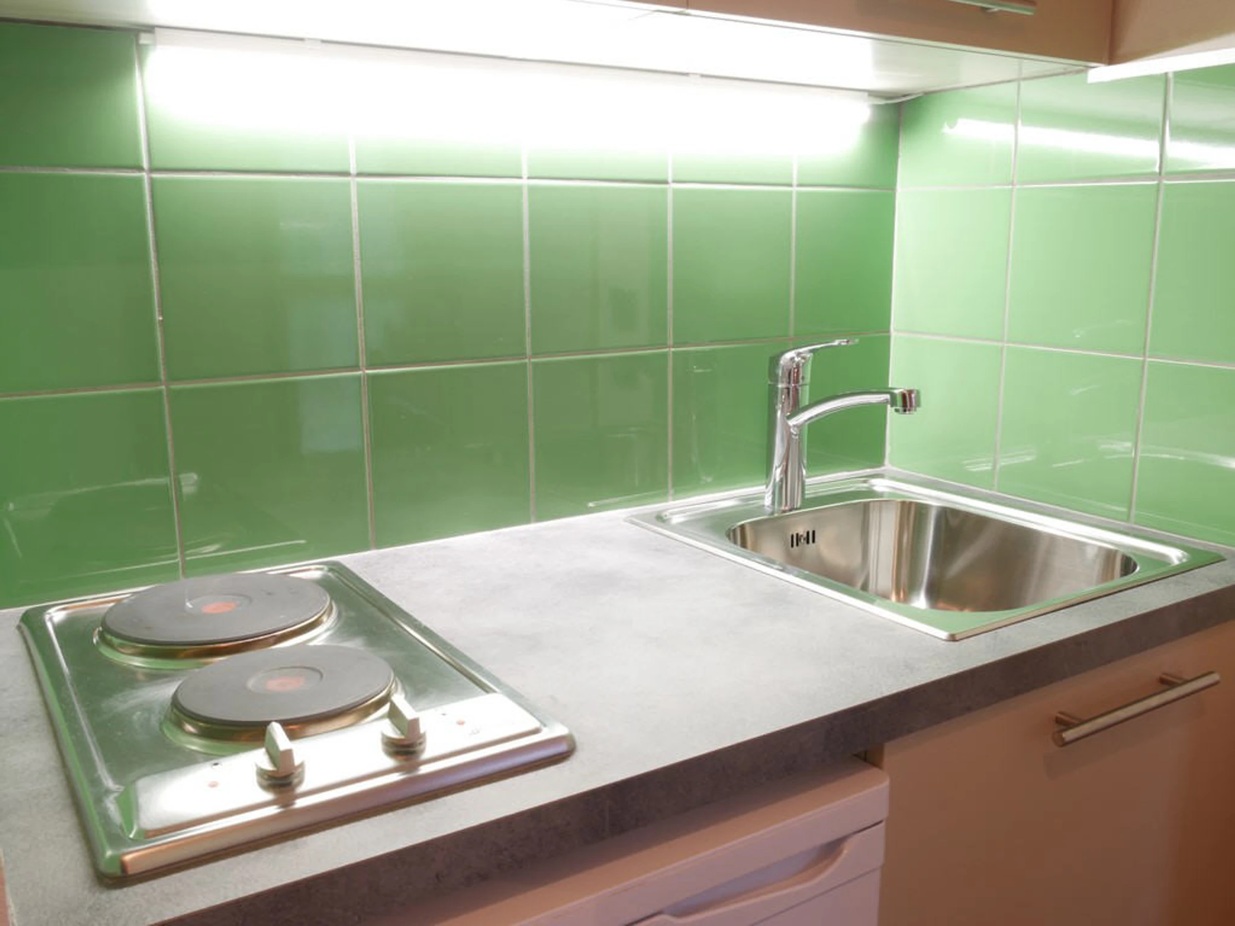 Coin cuisine : 2 plaques électriques, réfrigérateur, four micro-ondes, cafetière électrique, grille pain.
