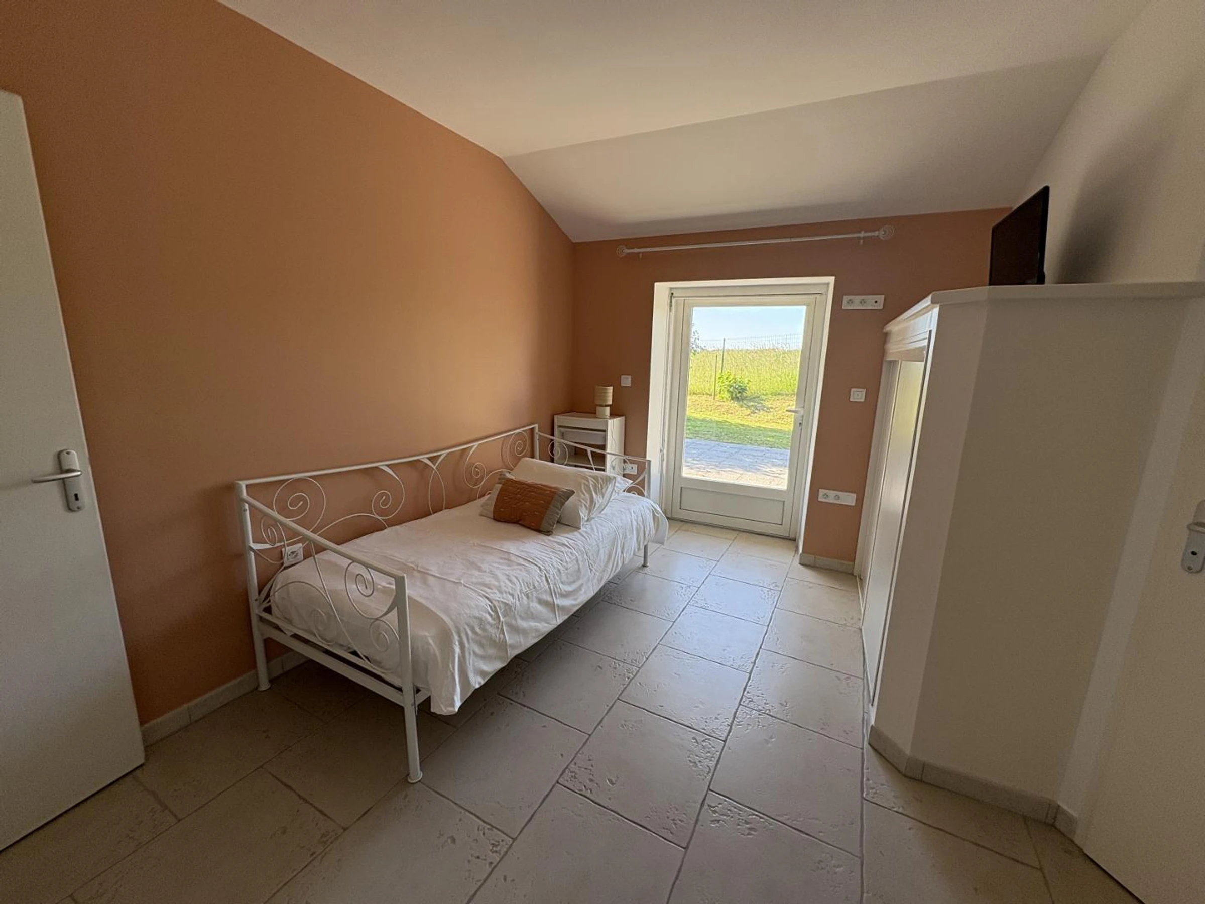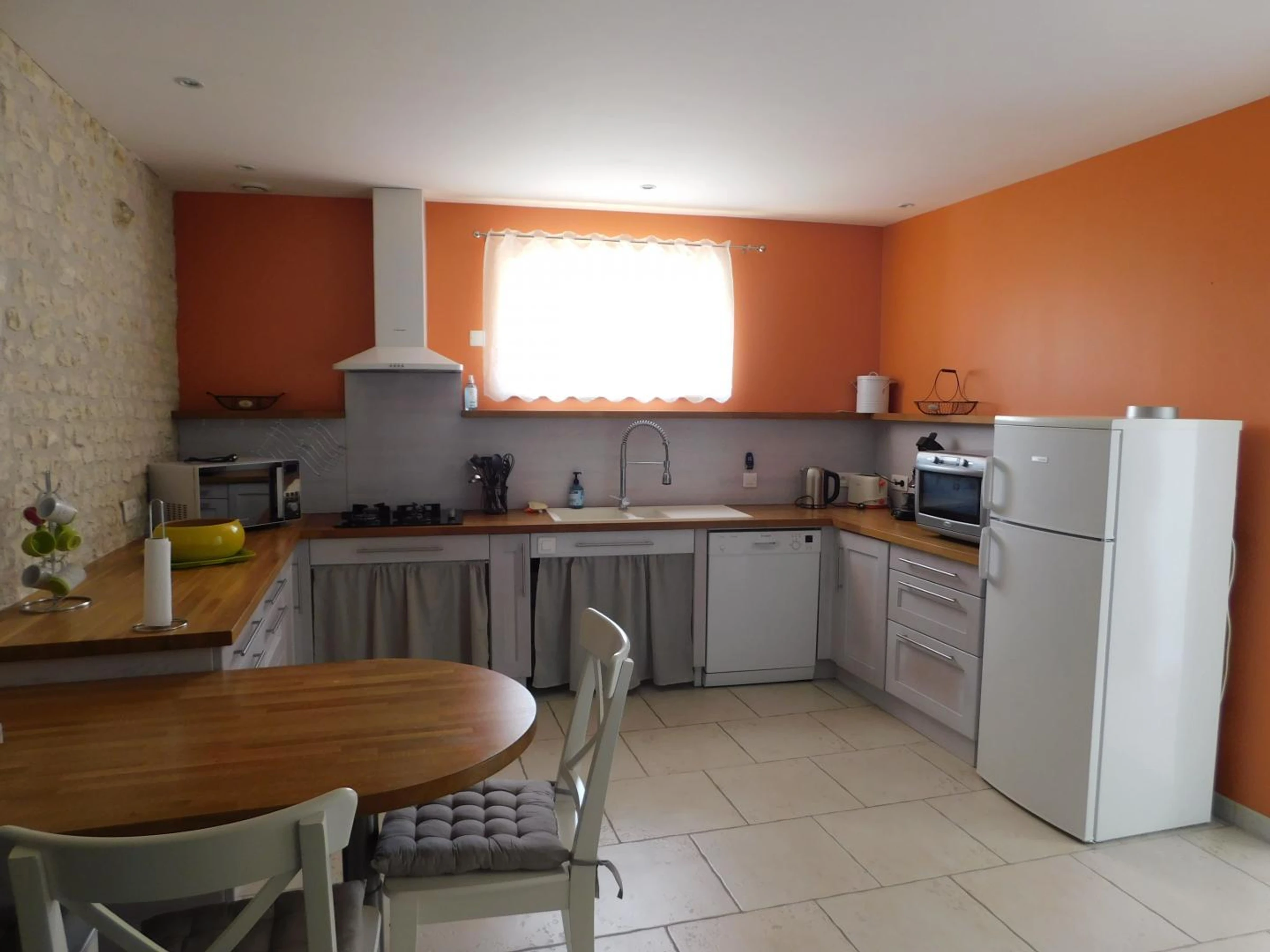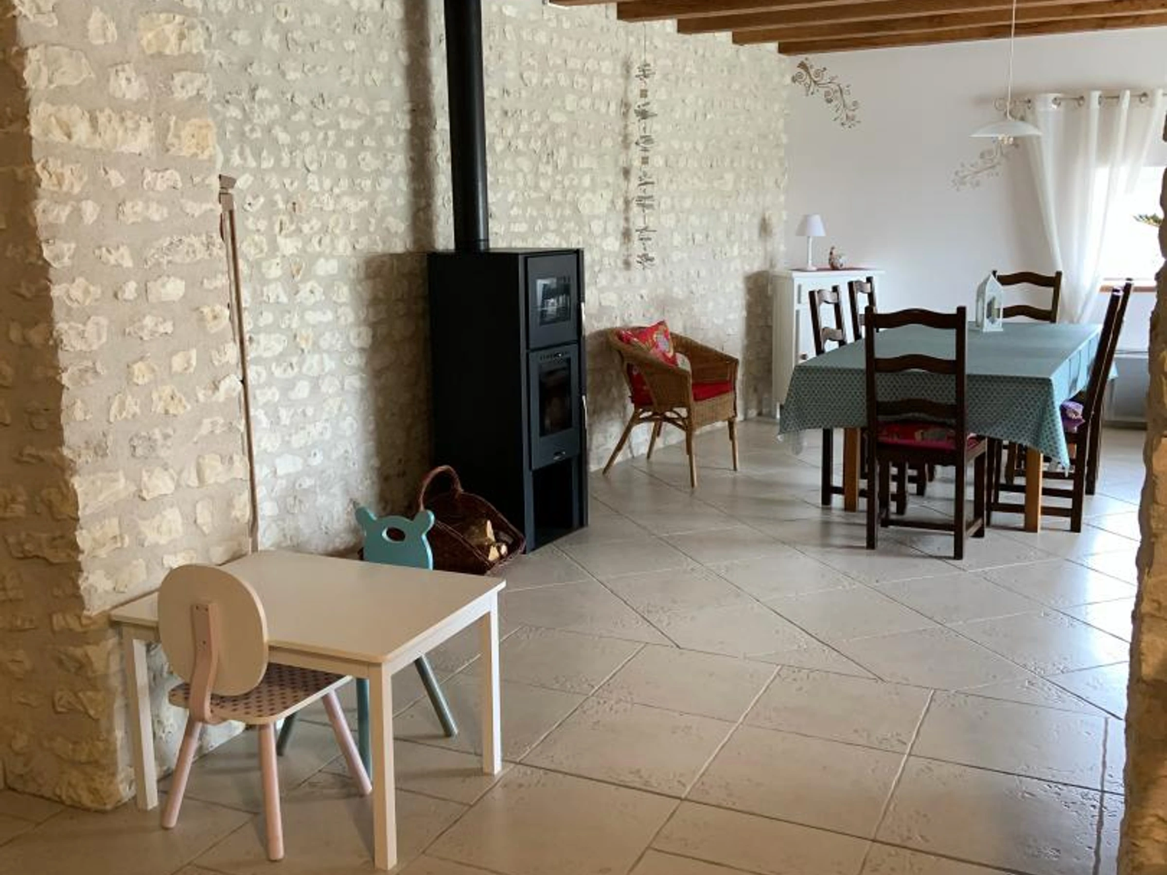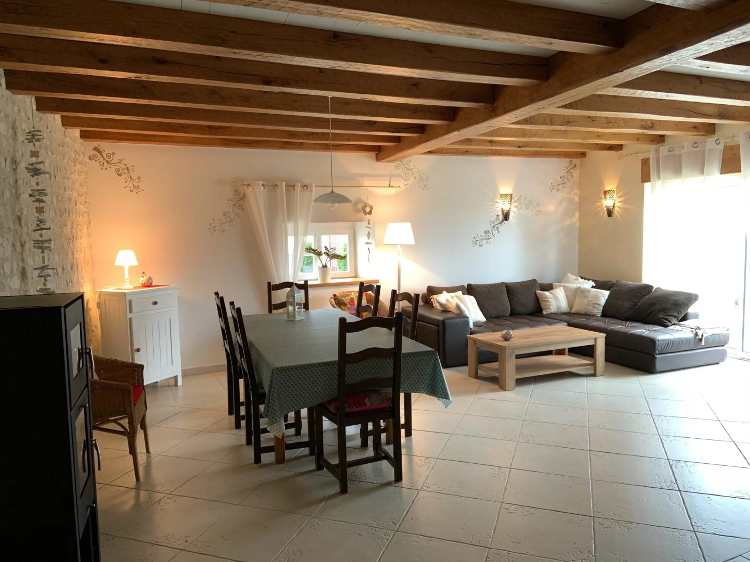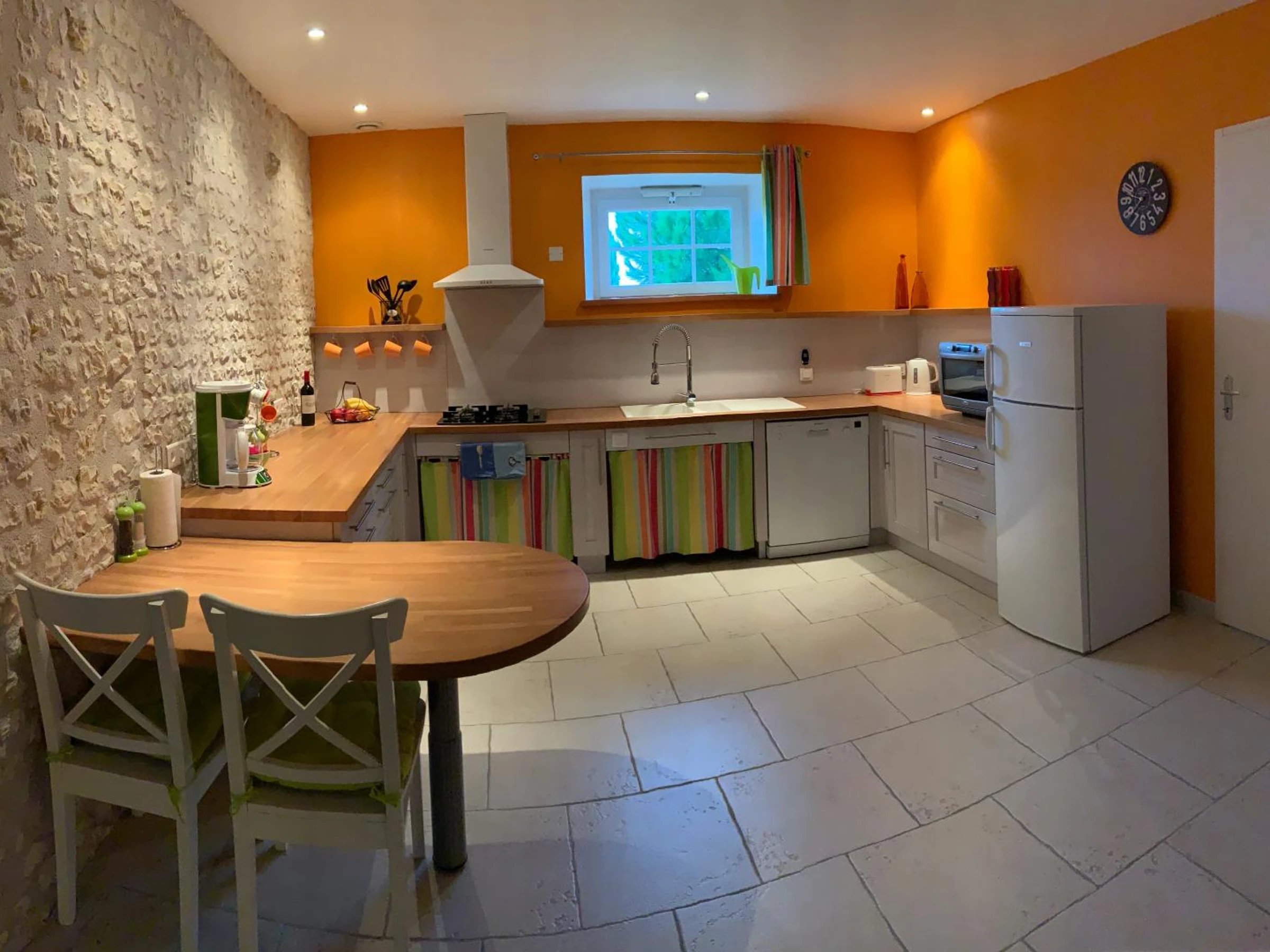 Rez-de-chaussée : cuisine, séjour 37 m² avec poêle à bois faisant four à pain/pizza (bois fourni), salle d'eau avec wc, cellier, 1 chambre accessible handicap moteur (2 lits 90*190) avec salle d'eau et wc.