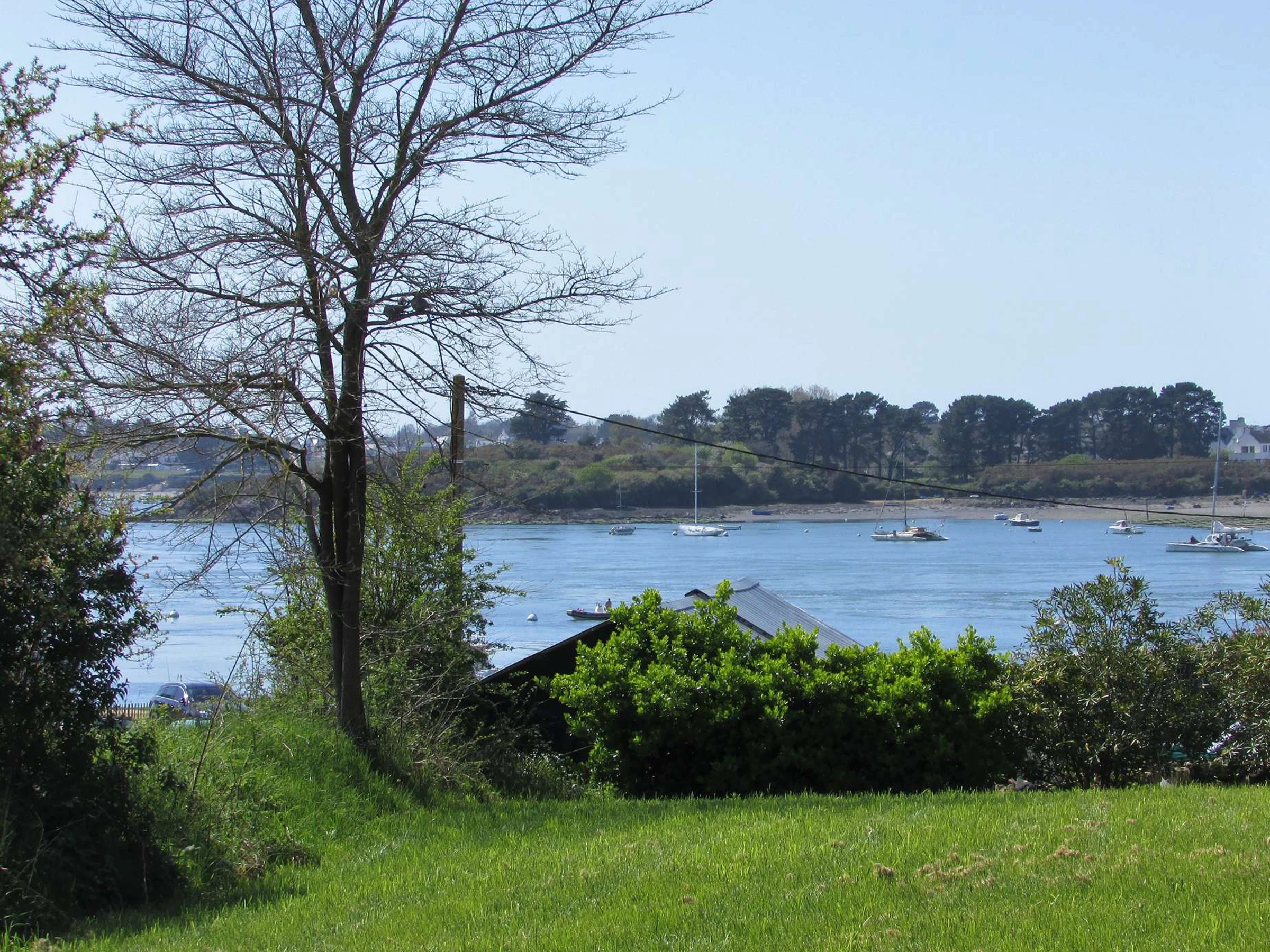 - Séjour avec partie salon (TV, lecteur DVD, canapés) et partie repas (table et chaises) donnant accès à la terrasse (meuble de jardin, barbecue) prolongée par le jardin avec vue sur la Ria d’Étel