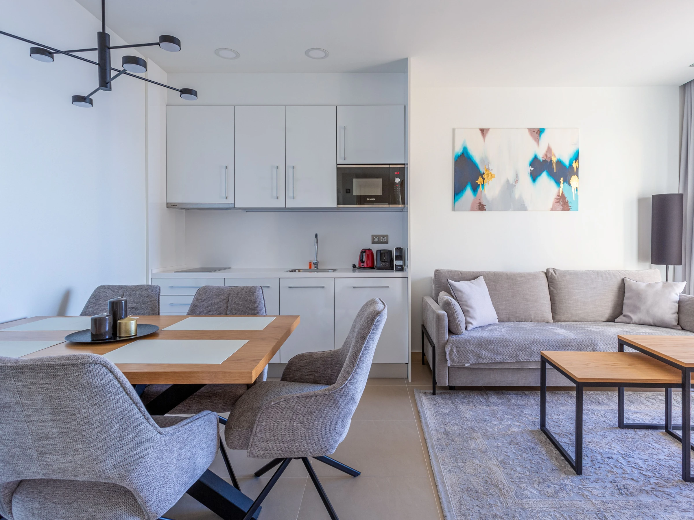 La cuisine américaine, à plaque vitrocéramique, est équipée d'un réfrigérateur, d'un micro-ondes, d'un congélateur, d'un lave-vaisselle, de vaisselle/couverts, d'ustensiles/cuisine, d'une cafetière, d'un grille-pain et d'un bouilloire.