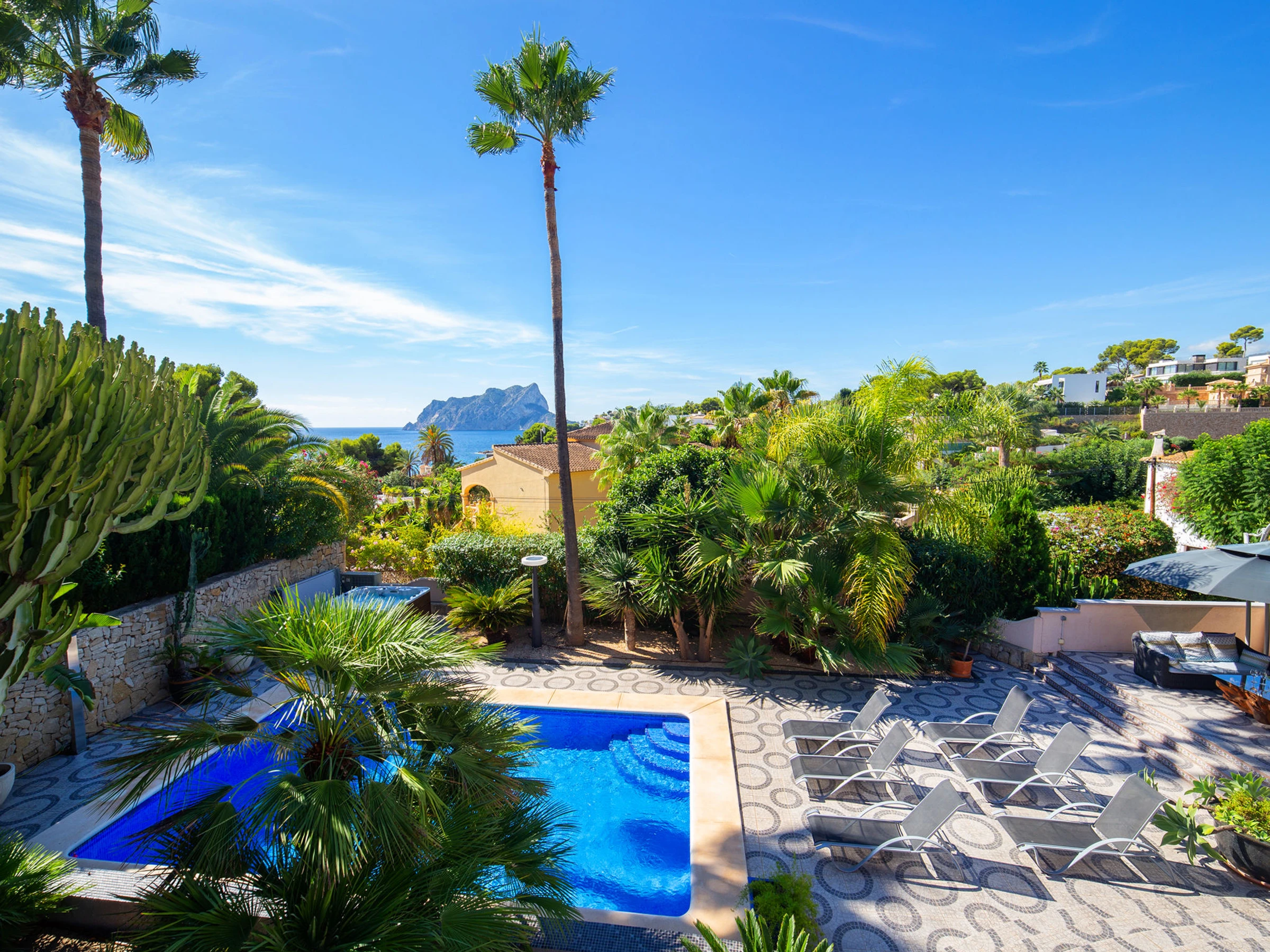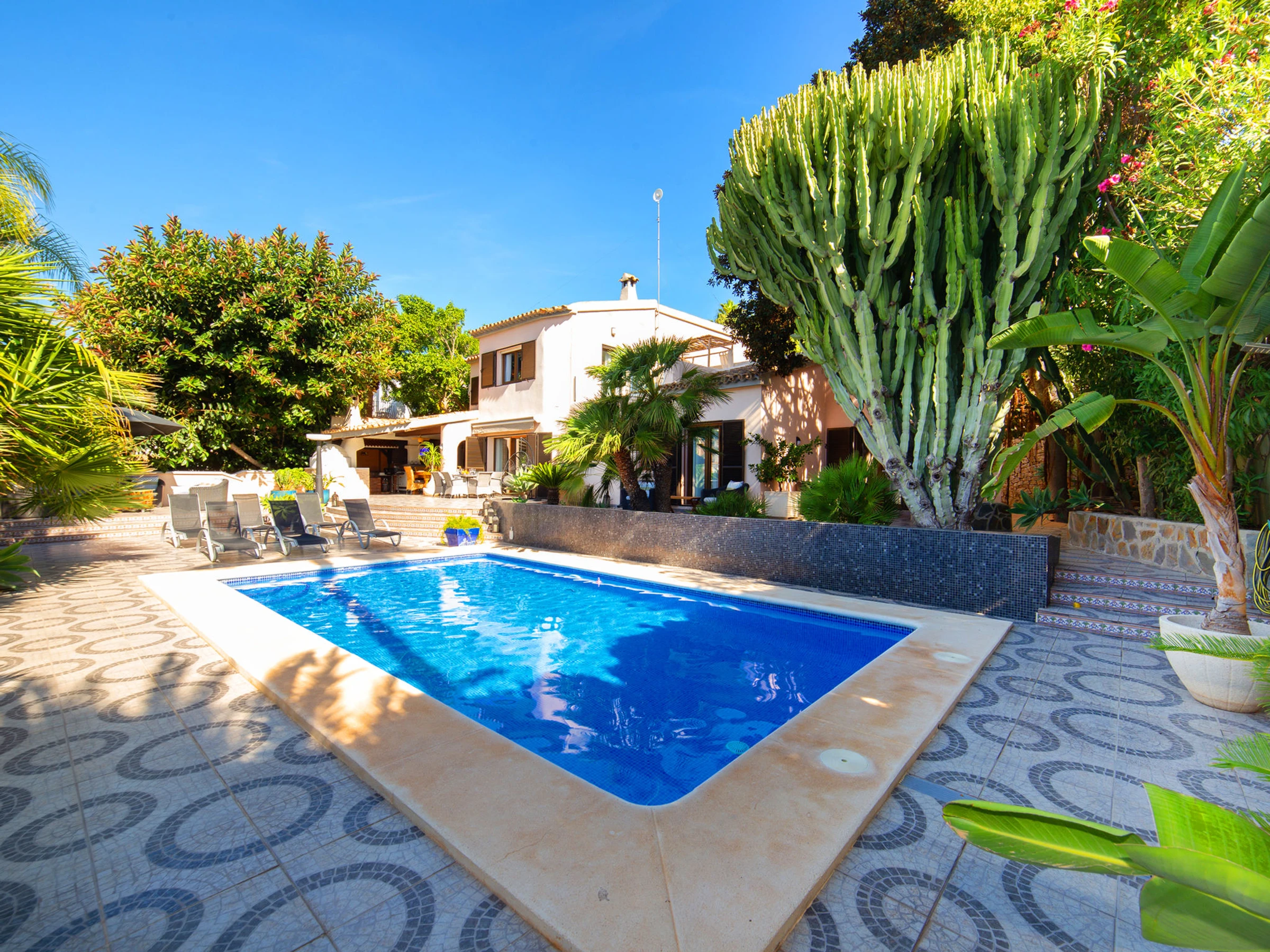 Belle villa confortable "El Salvador", de 2 étages. À 7 km du centre de Moraira, à 7 km du centre de Calpe, situation isolée, tranquille quartier résidentiel, zone avec peu de trafic, à 250 m de la mer, à 250 m de la plage. A usage privé: terrain (clôturé), beau jardin entretenu, piscine (8 x 4 m, disponibilité saisonnière: [hidden] - [hidden] Douche extérieure, bain à remous  , pool house avec réfrigérateur et plaque de cuisson, terrasse, barbecue. Magasin d'alimentation, supermarché 750 m, restaurant, bar, café 650 m, arrêt de bus 600 m, plage de sable "Playa la Fustera" 650 m. Port plaisance 2 km, terrain de golf (9 trous) 6 km. Attractions à proximité: Aqualandia, Mundomar, Terra Mítica, Terra Natura, Benidorm Palace (Benidorm), Les Fonts de l'Algar, Castillo de Guadalest. Le propriétaire n'accepte pas les groupes de jeunes.