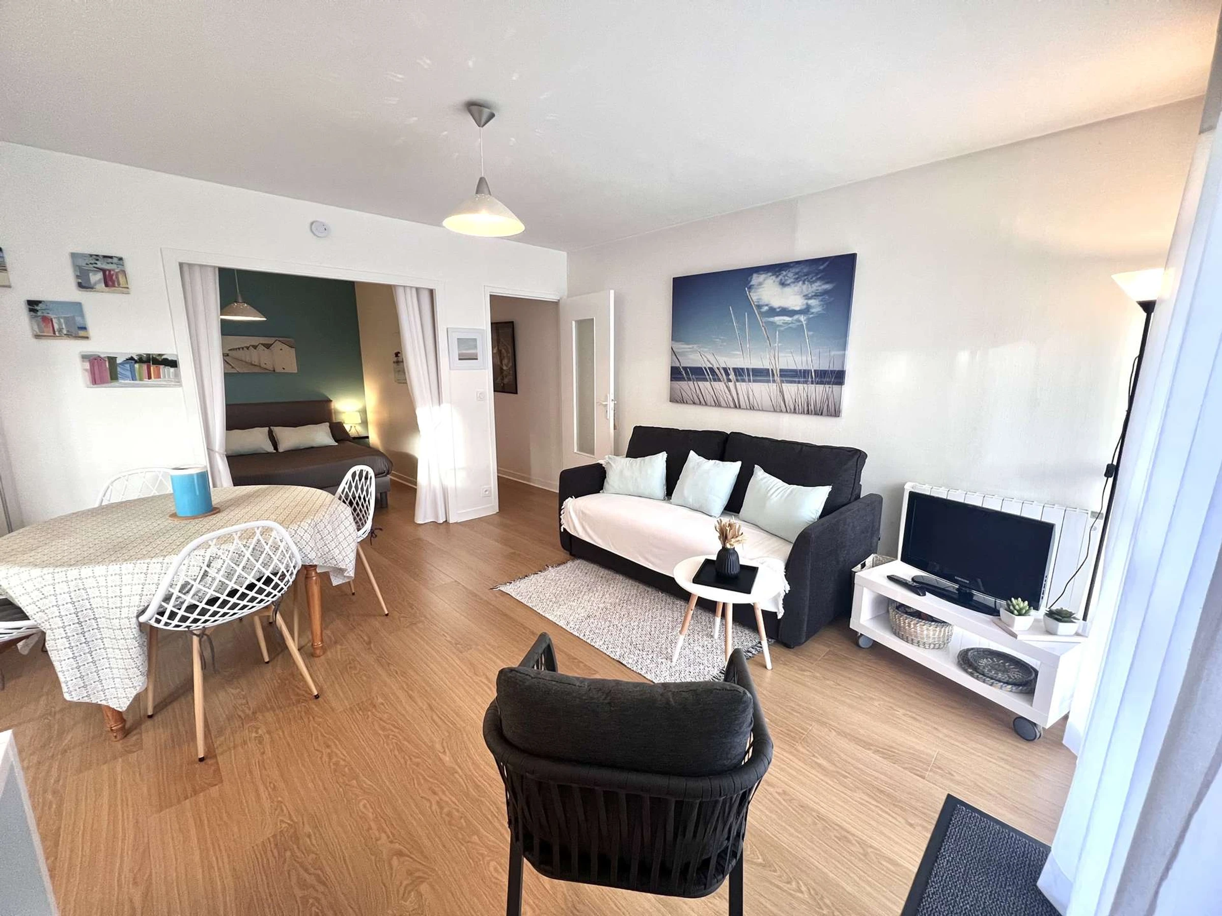 Appartement avec 1 chambre ouverte, au rez-de-chaussée de la Résidence de la Plage, à 150 m de la plage du Trez, des restaurants, du cinéma et de la thalasso.