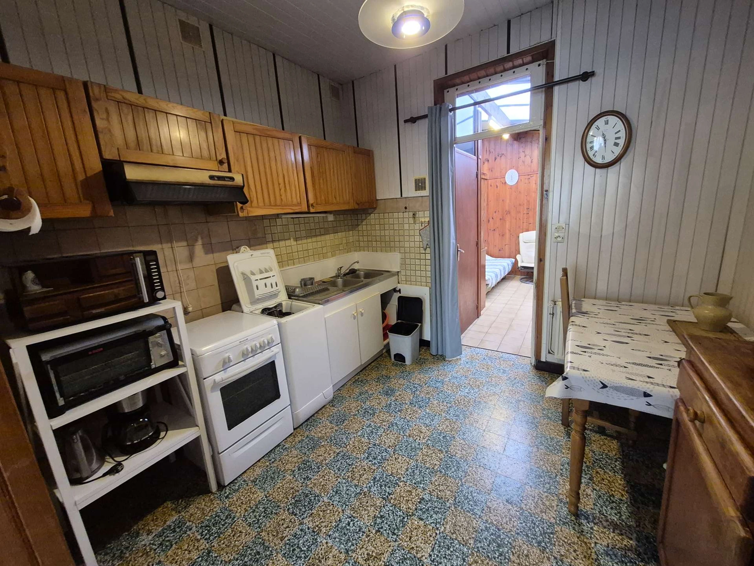 - d'une cuisine équipée ( plaque électrique, cafetière, four, micro-ondes, réfrigérateur, machine à laver),