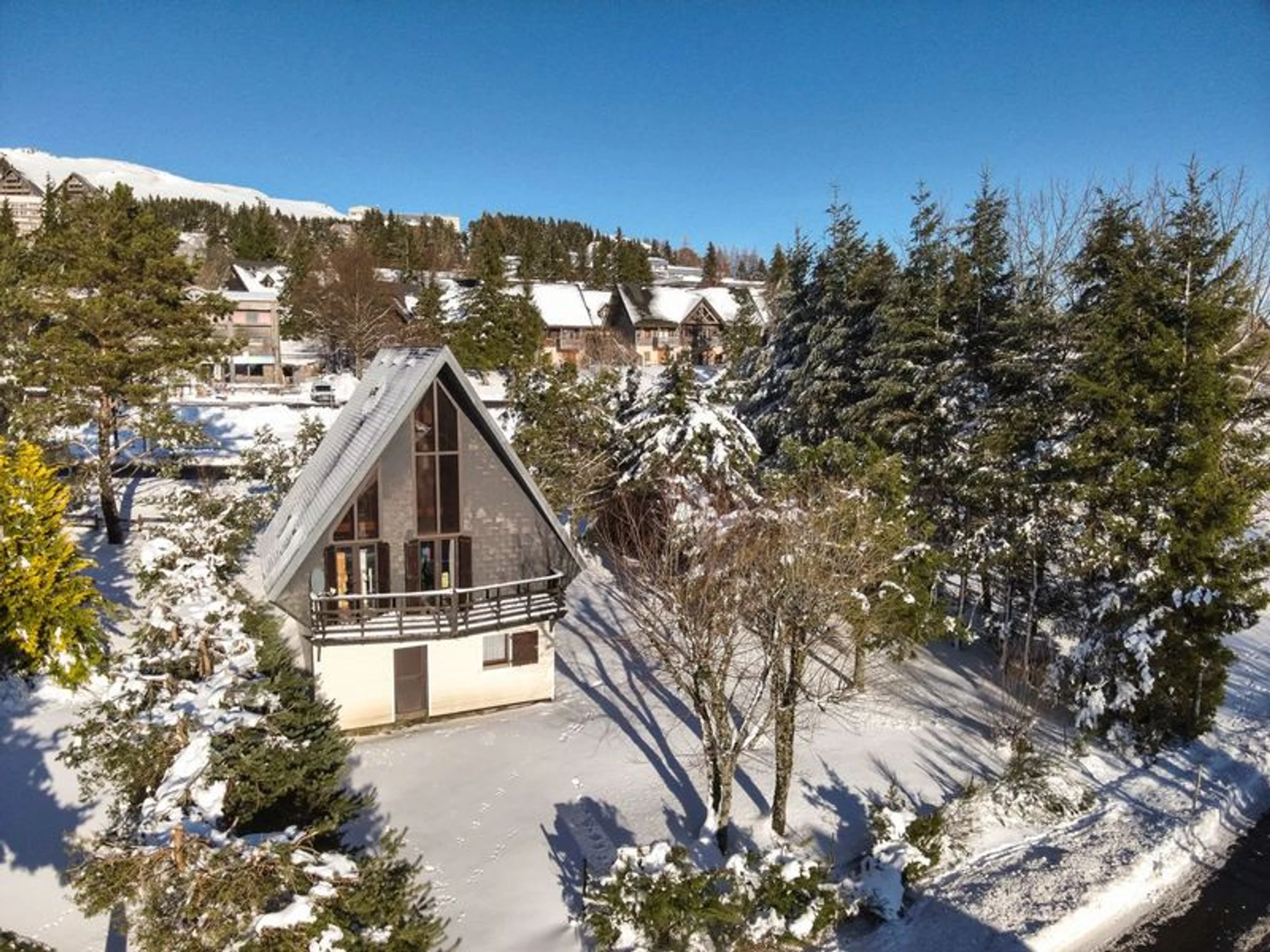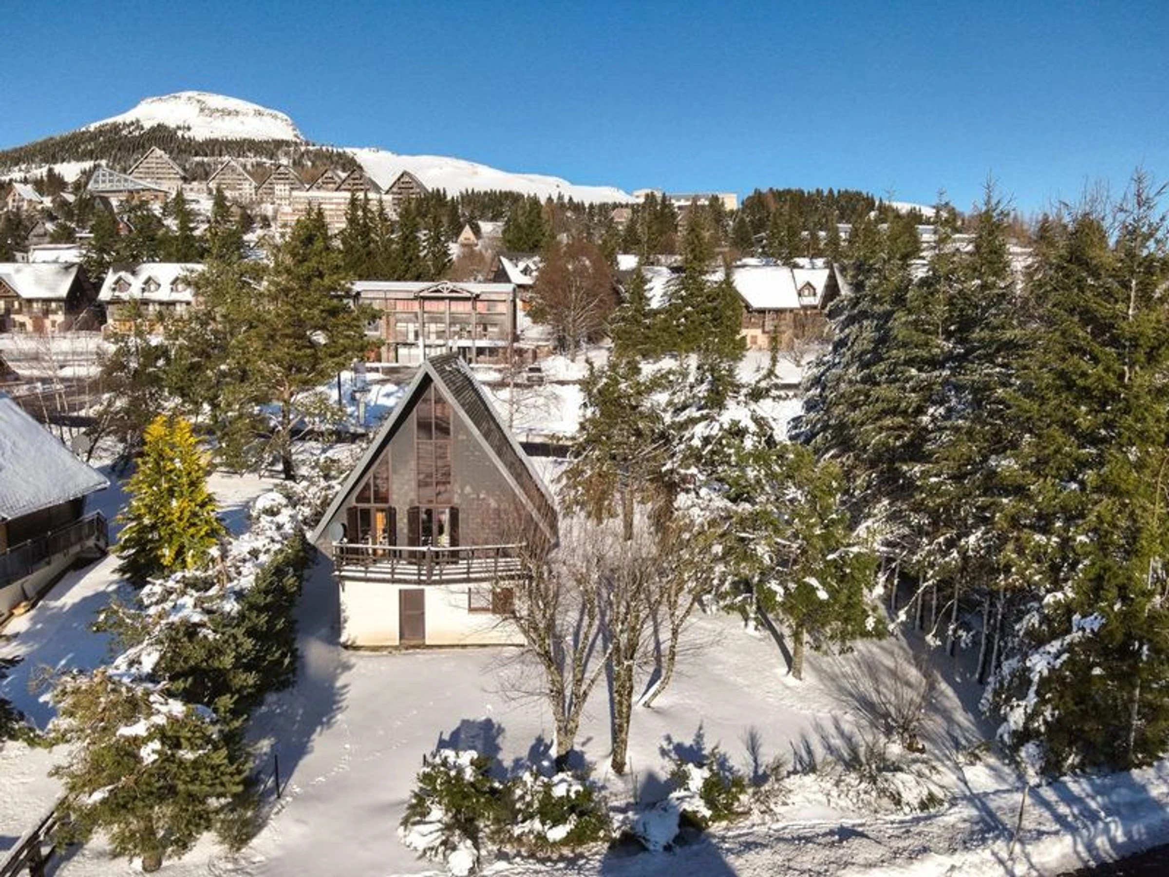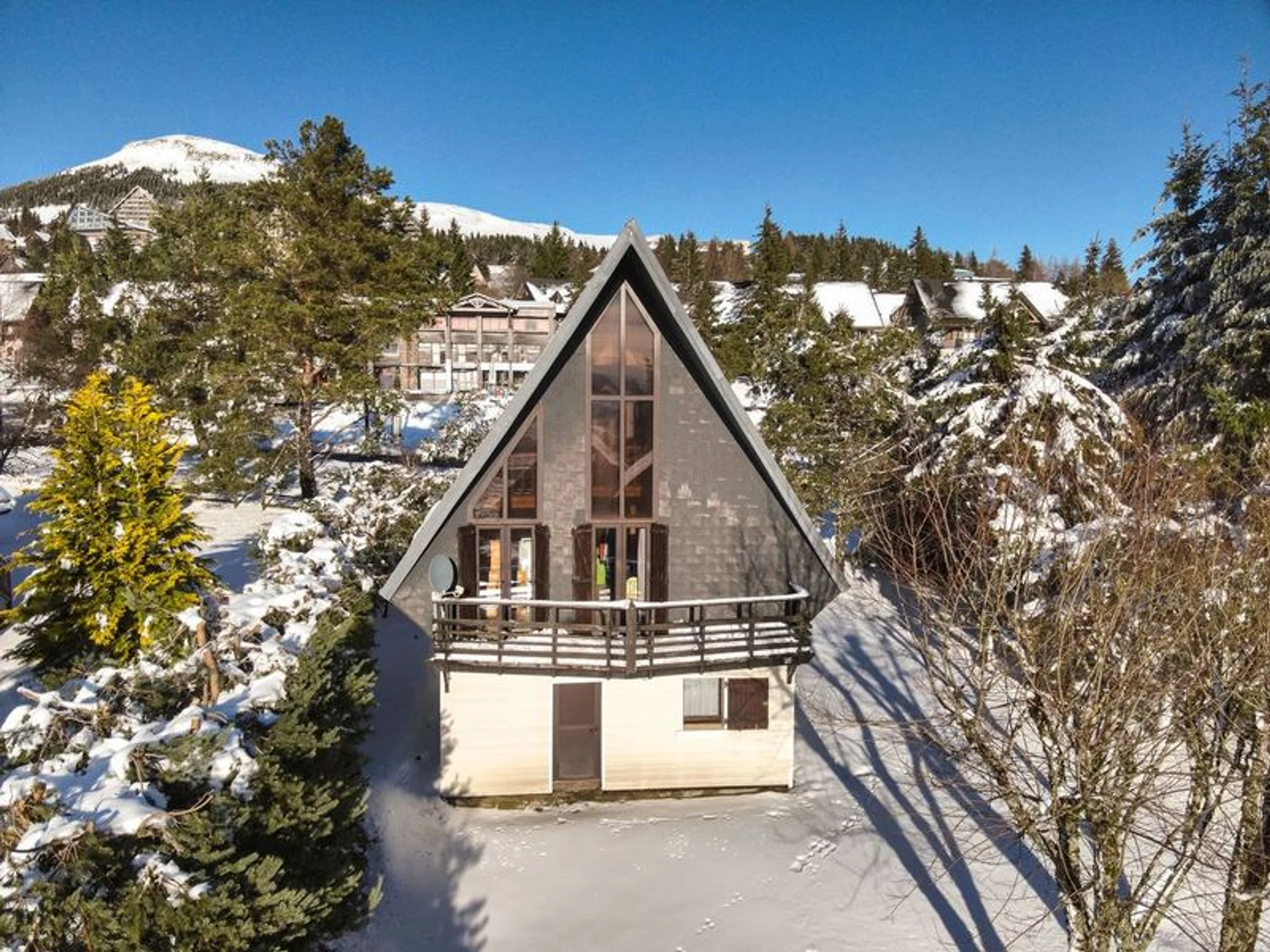 Ce chalet montagnard (130m2 à 12 personnes) est situé à l’entrée de la station à 13mn du centre du village. Son grand terrain arboré est idéal pour pratiquer des activités de plein air. Son parking privé et son garage sont à disposition. Vous pourrez profiter d’une pause en pleine nature pour vous ressourcer en admirant le massif du Sancy et ses montagnes sur son balcon plein sud et par sa mezzanine. Vous profiterez de sa grande pièce ouverte comprenant un salon confortable, une salle à manger spacieuse et sa cuisine tout équipée pour des repas conviviaux en famille ou entre amis. Vous pourrez bénéficier d'une navette à proximité pour vous conduire au cœur de la station.