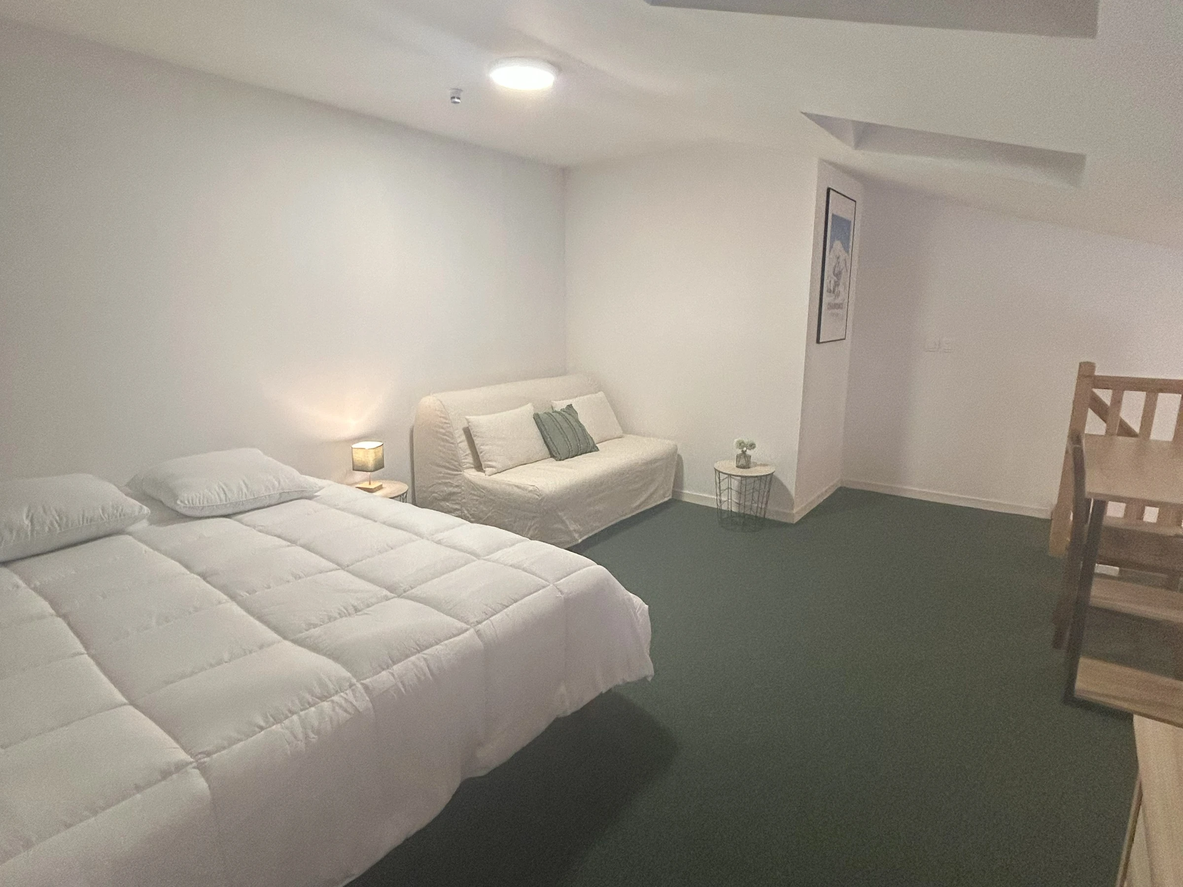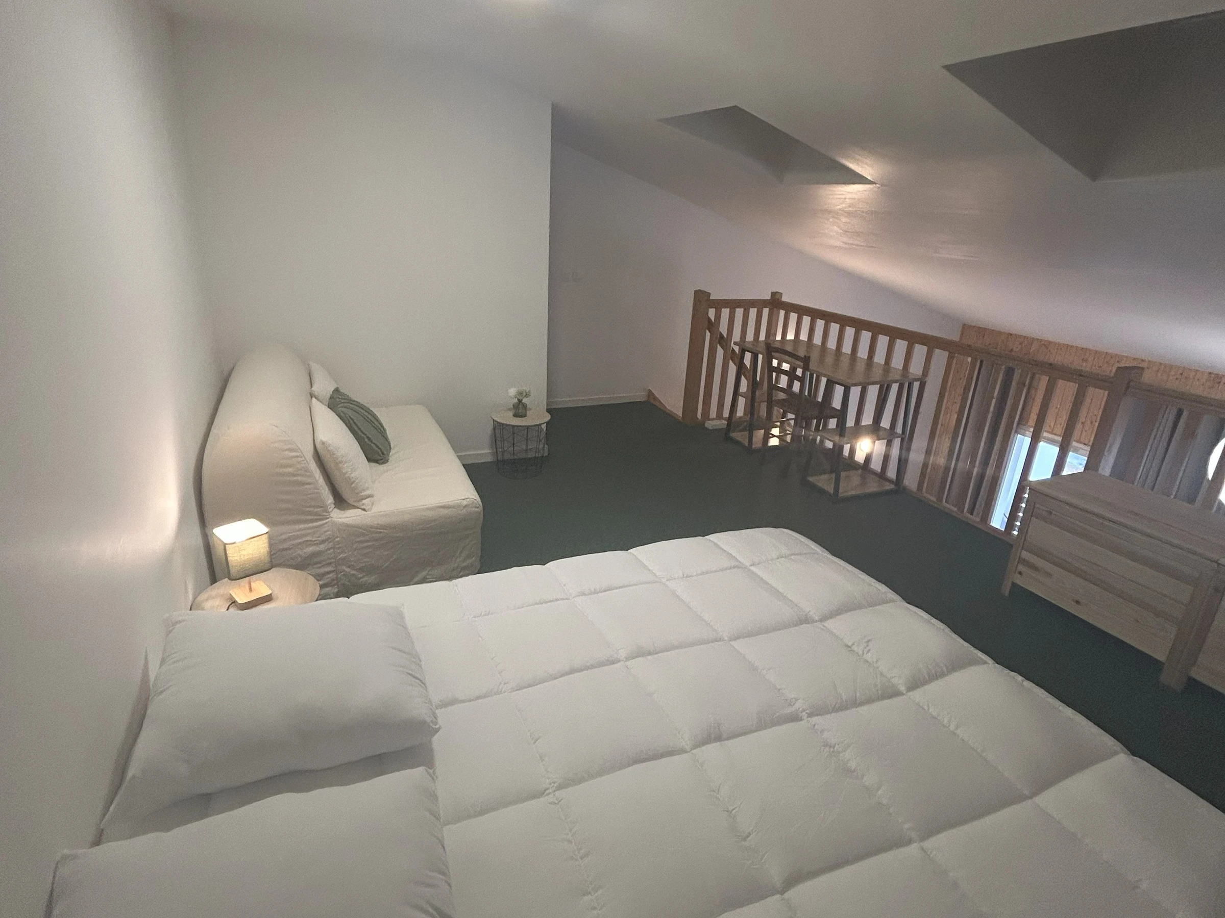 L'appartement est agencé avec 1 cabine séparée pour 2 personnes en lits simple, 1 cabine séparée pour 2 personnes en lit superposés + 1 grande mezzanine avec 1 lit 2 personnes de 160 et 1 banquette lit de 140 pour 2 personnes supplémentaires.