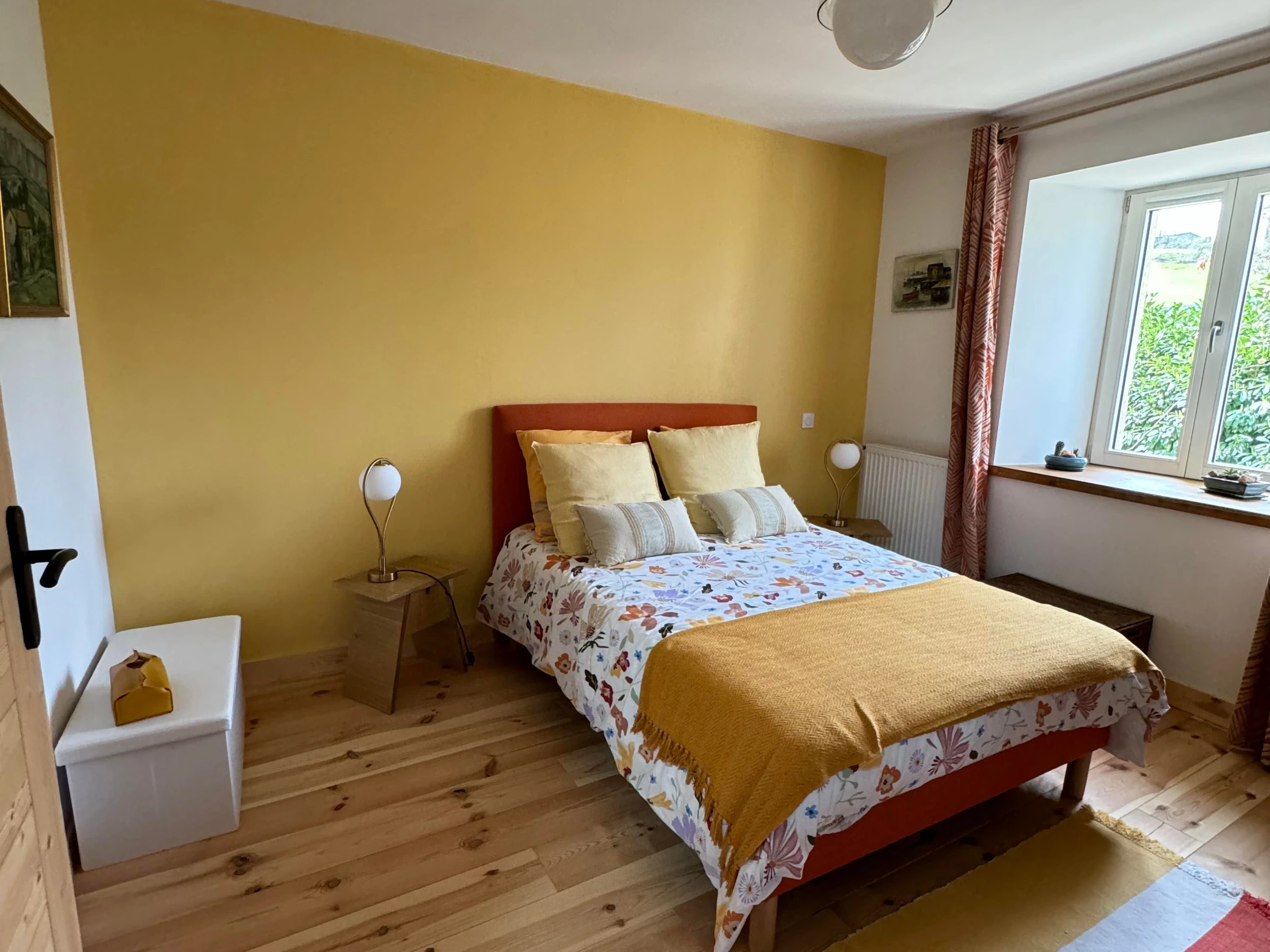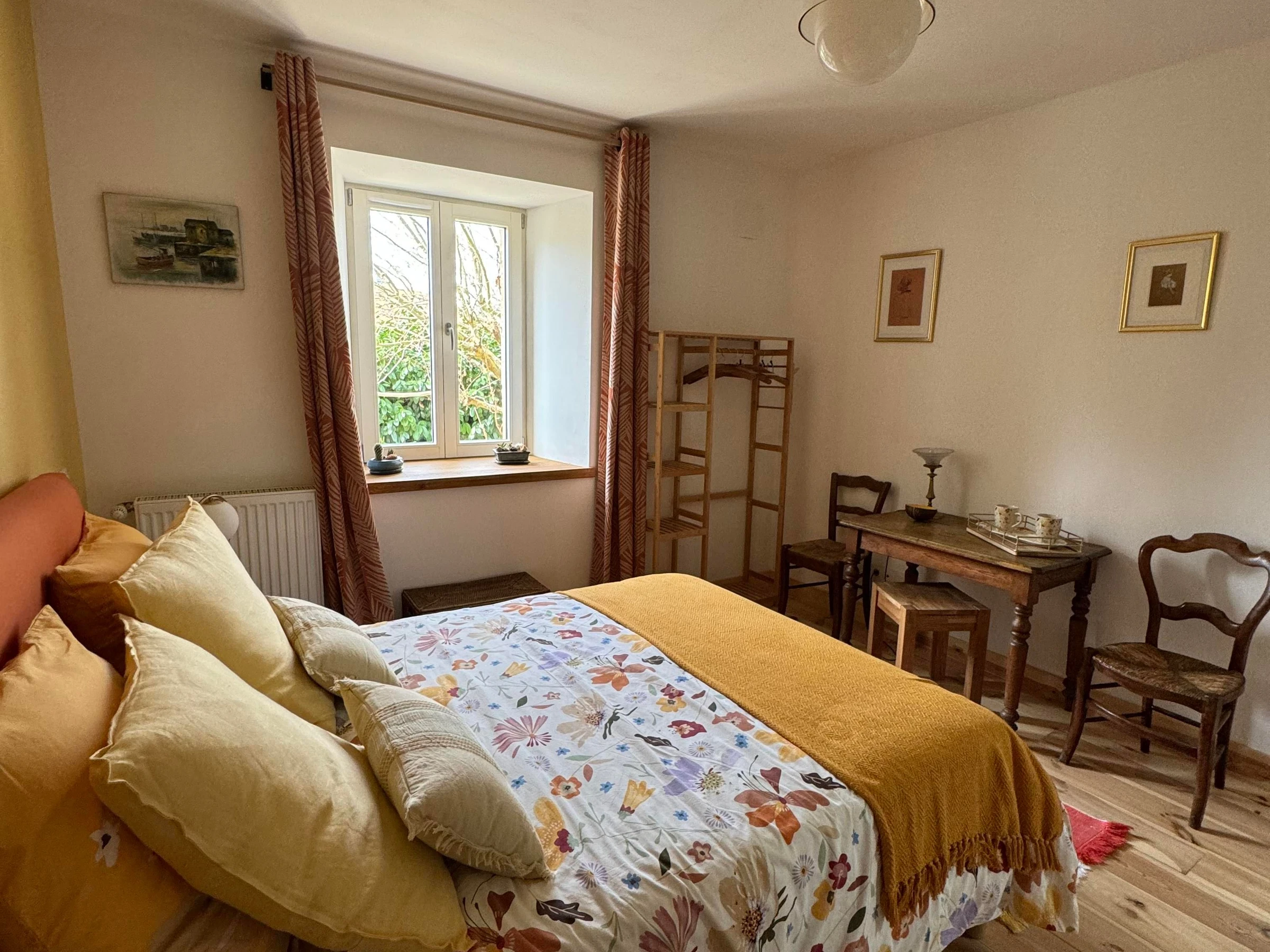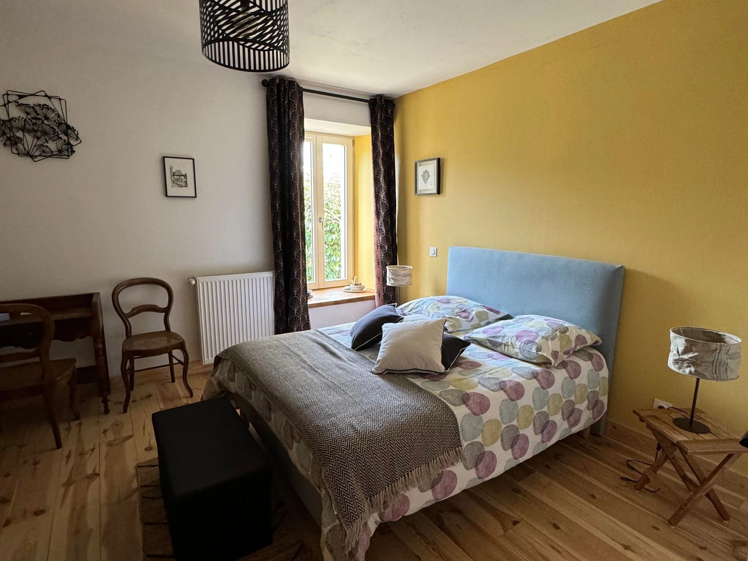 Vous trouverez au rez-de-chaussée, une pièce spacieuse comprenant la salle à manger et le salon avec une bibliothèque et cheminée. Les petits déjeuners y sont proposés avec des produits locaux et/ou faits maison, avec les fruits du jardin et les œufs de nos poules. À l’étage, également, vous est proposé un second espace de détente avec télévision et jeux de sociétés. En cas de beau temps, vous pourrez profiter du jardin, des tables, chaises et transats qui vous attendent à différents endroits de cet espace partagé. À partir de mi-juin, vous avez à disposition l’après-midi un espace extérieur supplémentaire avec piscine semi enterrée, salon de jardin et transats, table et chaises. Chambre double de 22 m2 située au rez-de-chaussée, avec un lit de 160, salle d'eau privative avec douche et WC. Chambre au rez de chaussée accessible aux personnes à mobilité réduite.