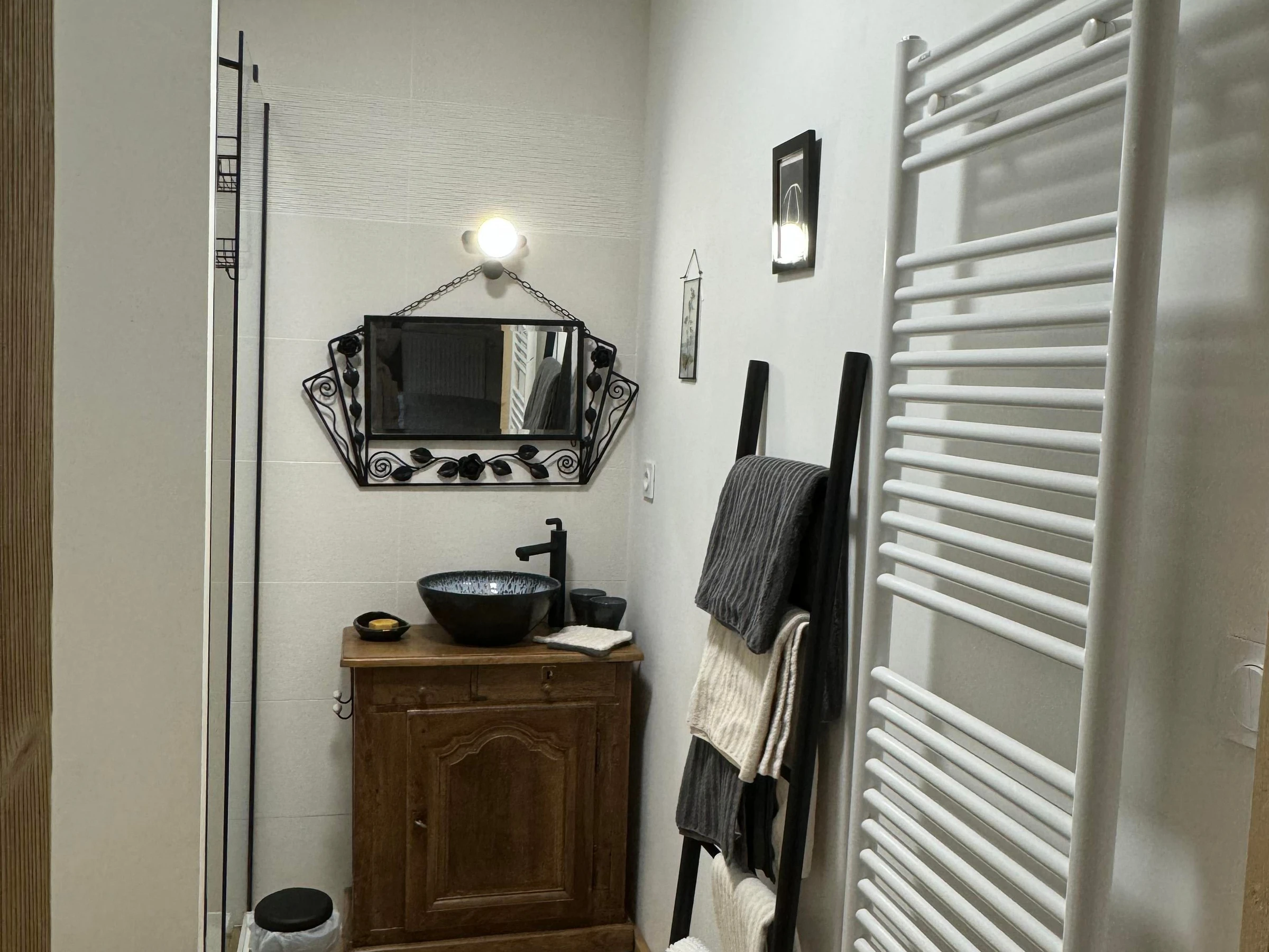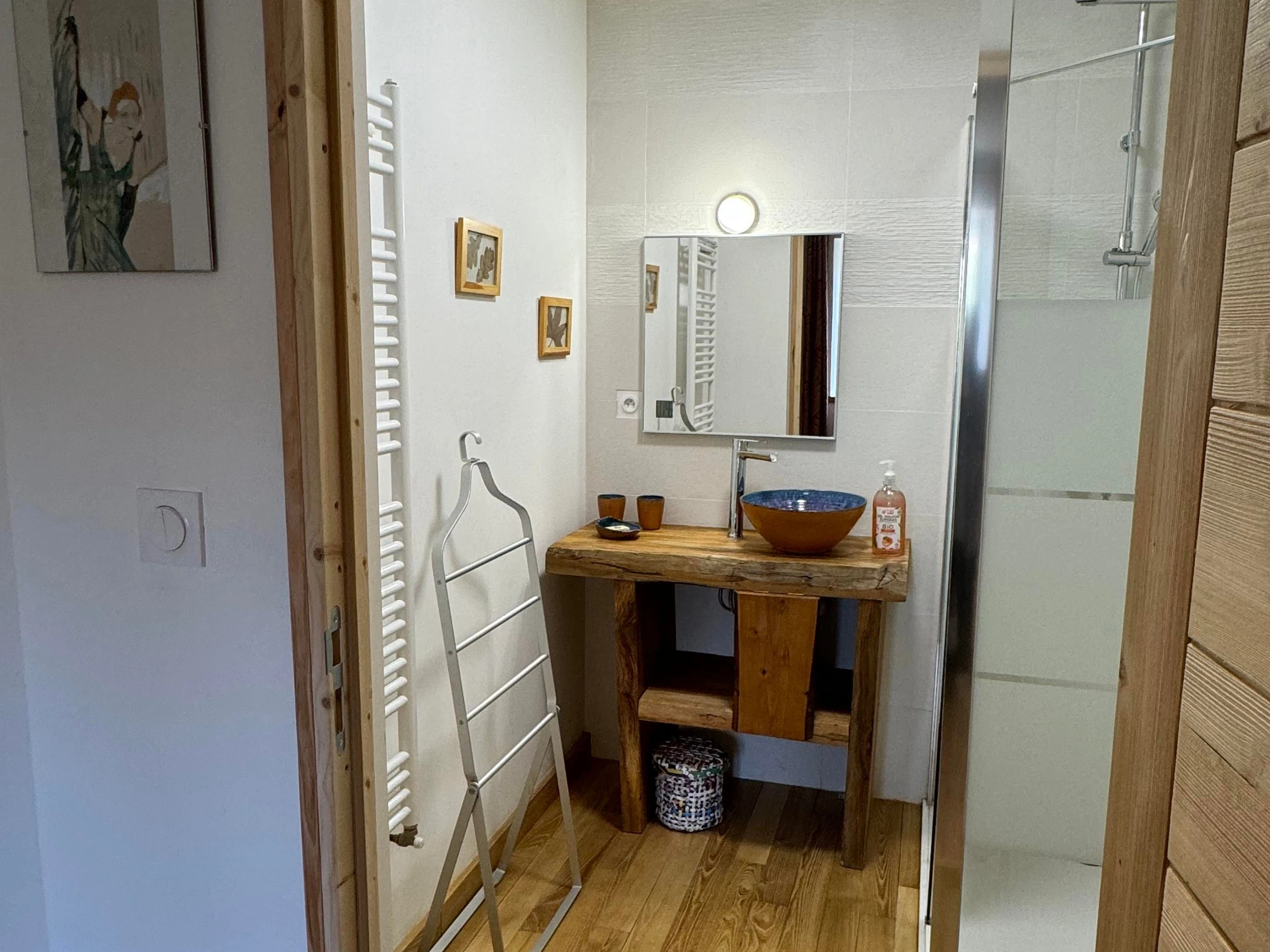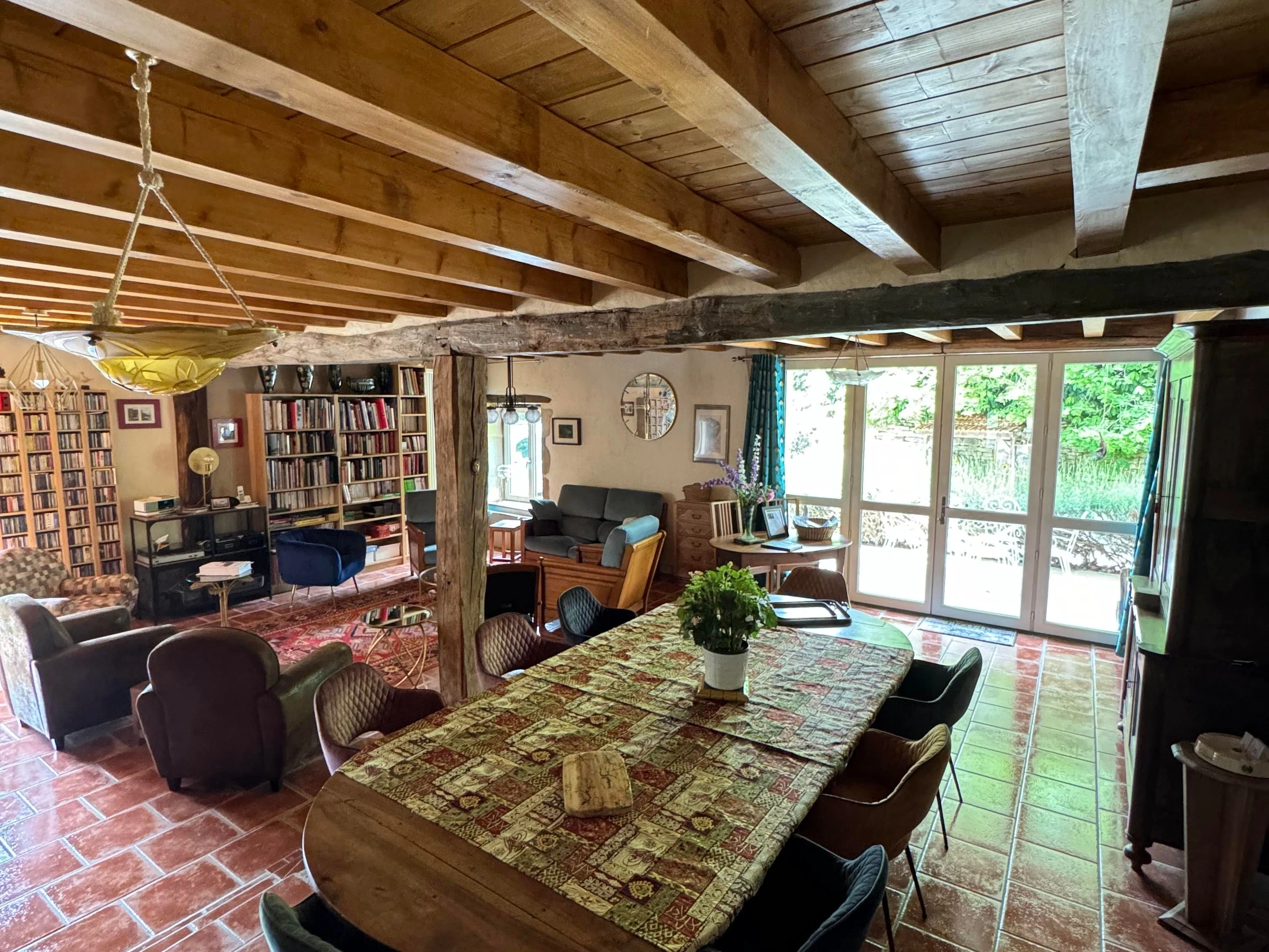 Vous trouverez au rez-de-chaussée, une pièce spacieuse comprenant la salle à manger et le salon avec une bibliothèque et cheminée. Les petits déjeuners y sont proposés avec des produits locaux et/ou faits maison, avec les fruits du jardin et les œufs de nos poules. À l’étage, également, vous est proposé un second espace de détente avec télévision et jeux de sociétés. En cas de beau temps, vous pourrez profiter du jardin, des tables, chaises et transats qui vous attendent à différents endroits de cet espace partagé. À partir de mi-juin, vous avez à disposition l’après-midi un espace extérieur supplémentaire avec piscine semi enterrée, salon de jardin et transats, table et chaises. Chambre double de 22 m2 située au rez-de-chaussée, avec un lit de 160, salle d'eau privative avec douche et WC. Chambre au rez de chaussée accessible aux personnes à mobilité réduite.
