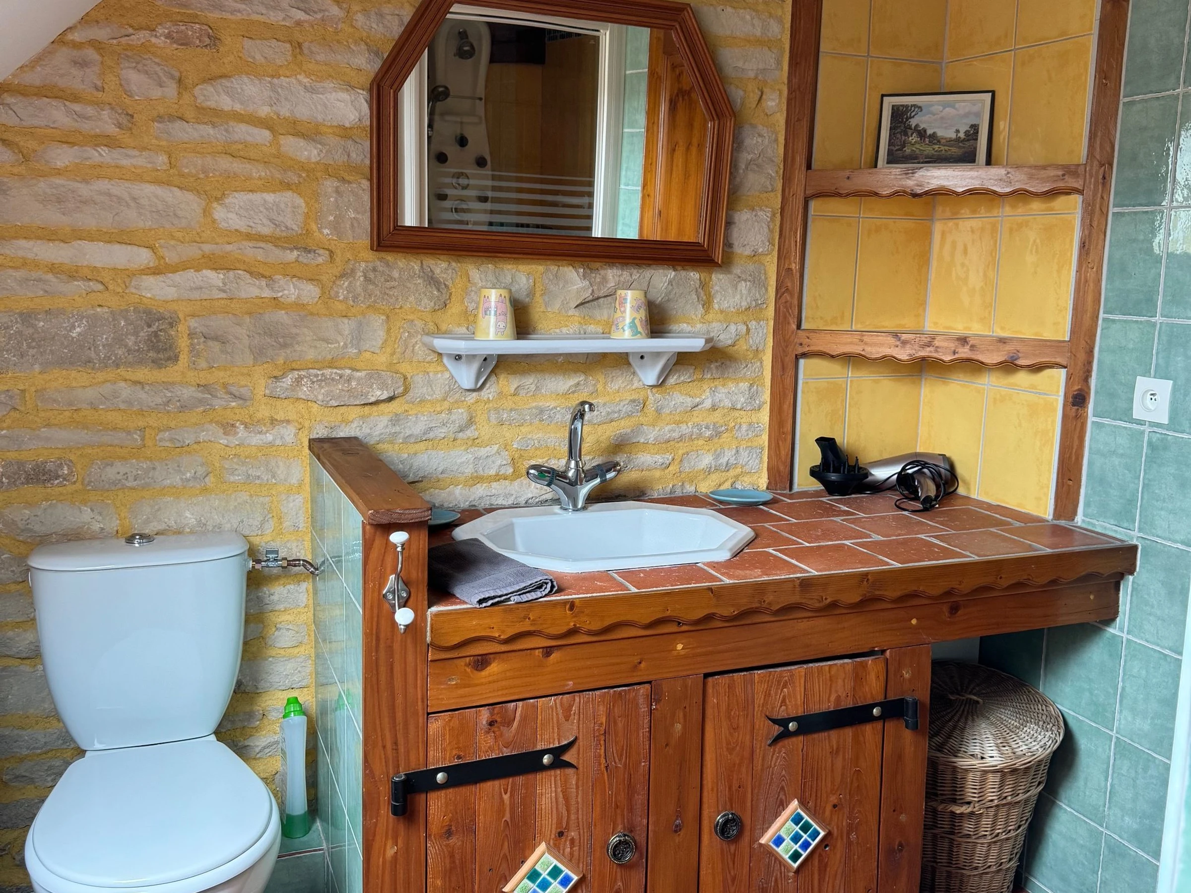 2 accès vers l'étage, de la cuisine ou du salon, menant aux 2 chambres (3 lits double de 140x190) et à la salle d'eau avec WC . Un espace extérieur attenant est à disposition avec table , chaises et barbecue. Le jardin, partagé avec les propriétaires est ouvert aux locataires, des tables, chaises, et fauteuils sont disséminés en différents endroits pour profiter de la verdure et de l'eau. Une aire de jeux avec balançoires attend les enfants…Nous mettons à disposition l’été un espace aménagé avec piscine semi enterrée, table et chaises, salon de jardin, transats… L’usage de la piscine est réglementé, au niveau des horaires d’ouverture, de 15h à 19 h, et de son accès quand il y a des enfants, les consignes sont écrites sur place.
