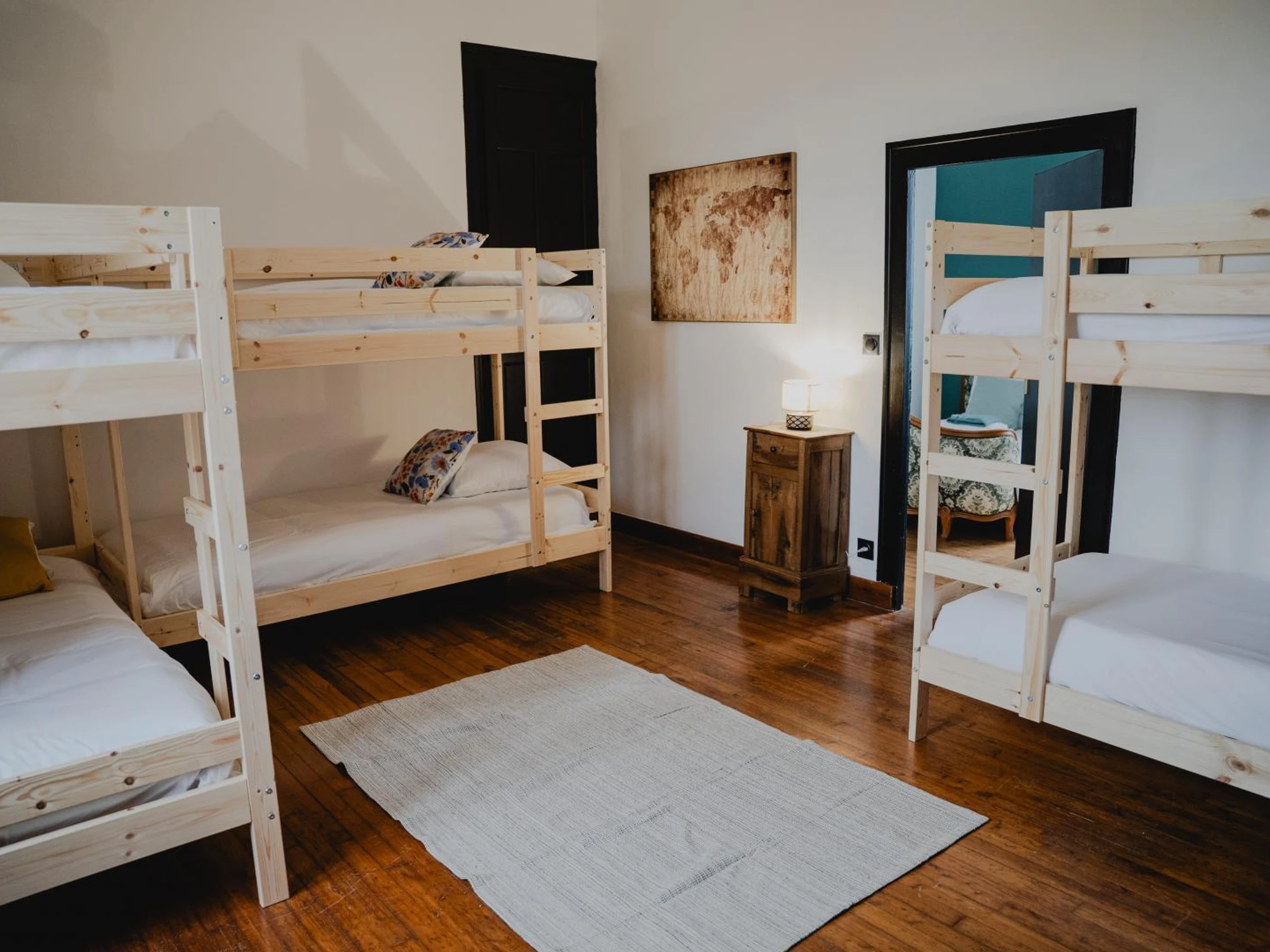 A l'étage, un grand palier dessert 2 chambres familiales avec chacune 1 lit 140 et 2 lits superposés 90x190, une salle d'eau, un WC indépendants et 2 chambres avec chacune 1 lit 140, salle d'eau privative et WC privatifs.