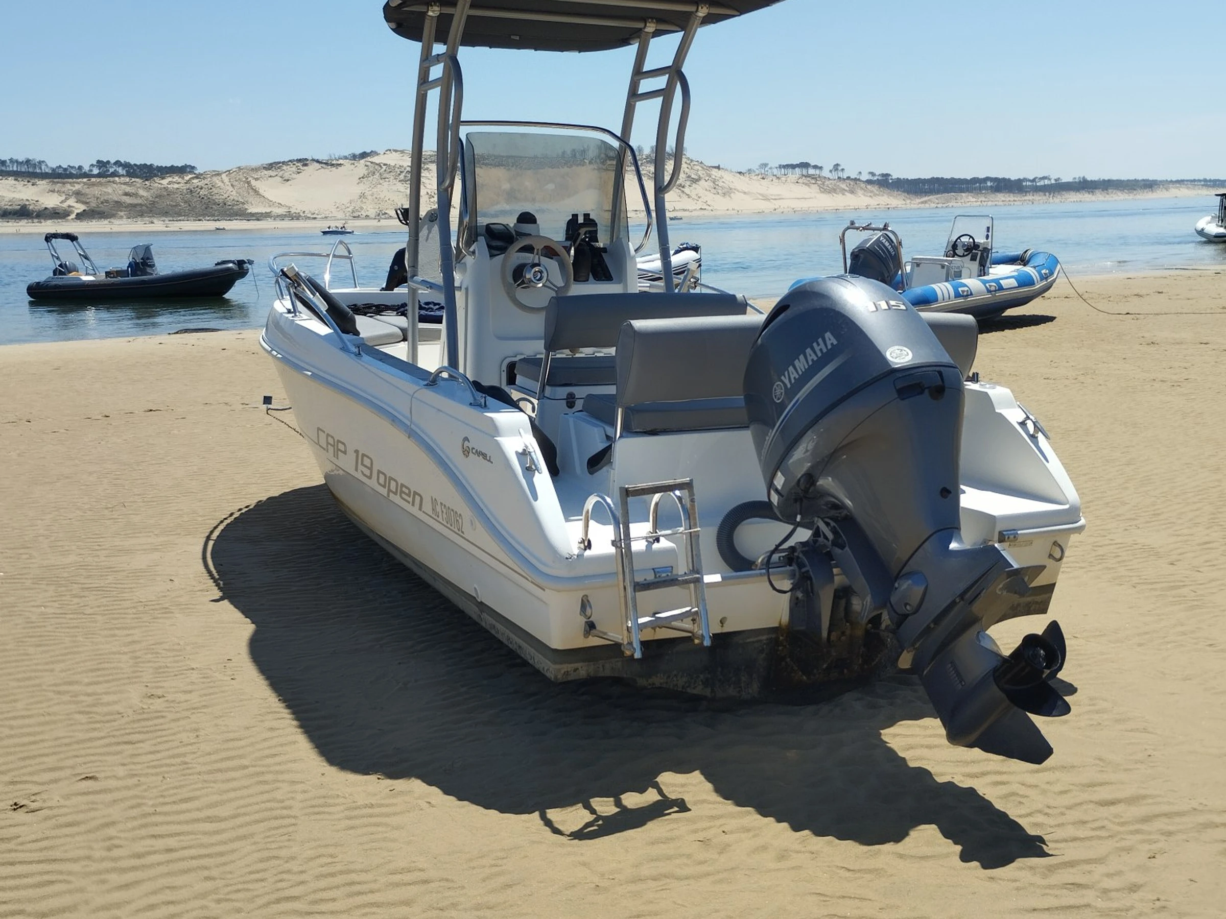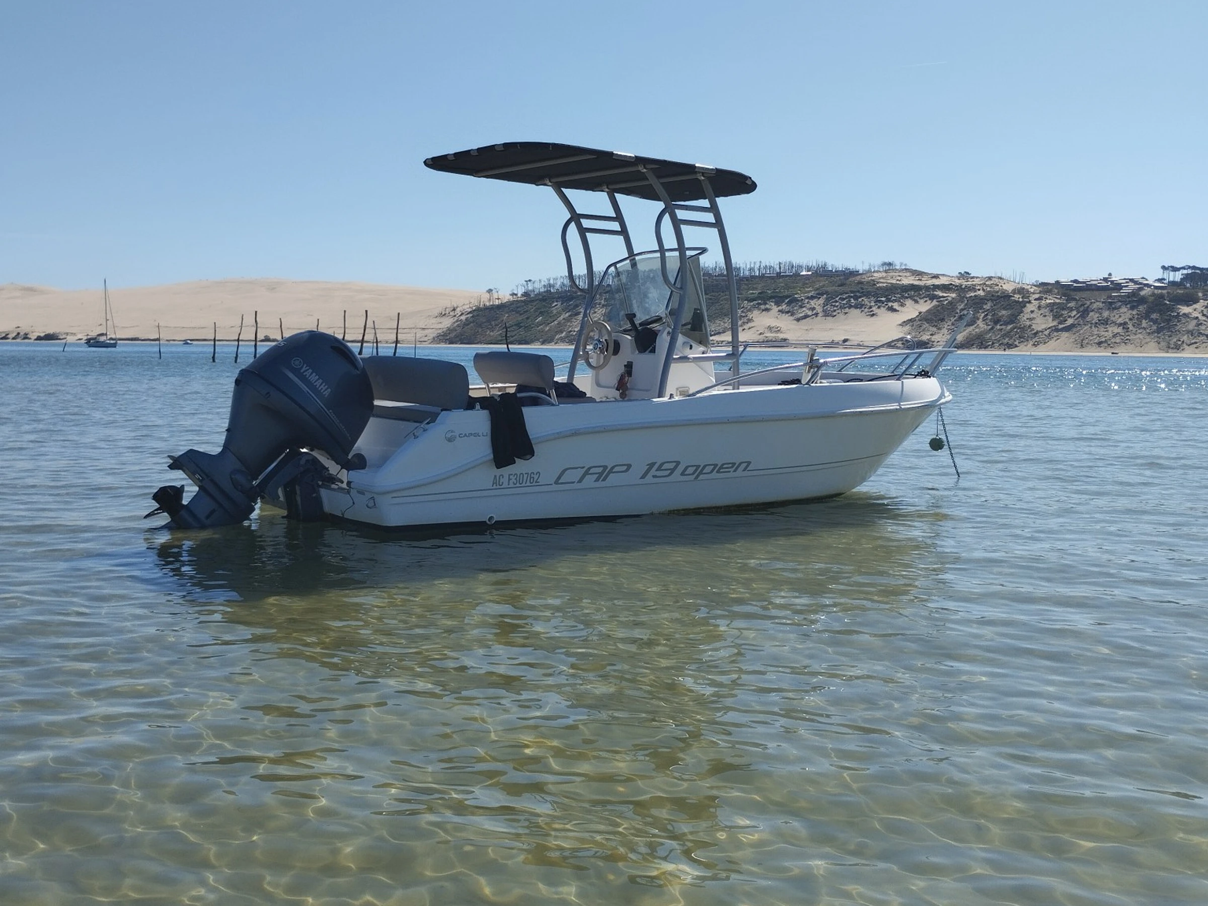 Concernant la prestation de bateau ( photo non contractuelle ) : Explorez le bassin d'Arcachon a bord du FOAMSTAND, bateau de 6 M pour 5 pers avec un moteur YAMAHA de 115 CV. La découverte de l'ile aux oiseaux avec les fameuses cabanes thanques, mais aussi la pointe du cap ferret, le banc d'arguin, ou la dune du Pyla, rend la journée exceptionnelle. Le permit mer ou côtier est nécessaire . ( Devis sur demande )