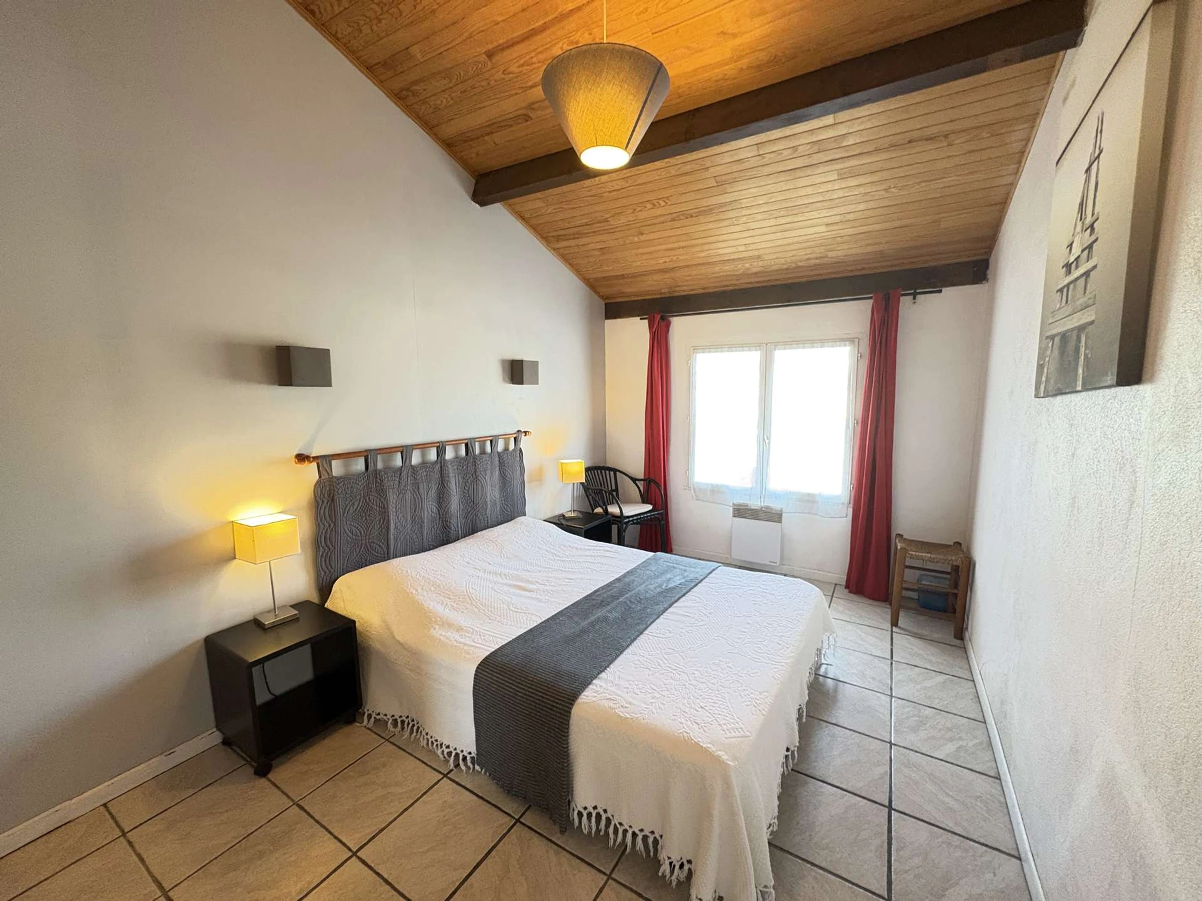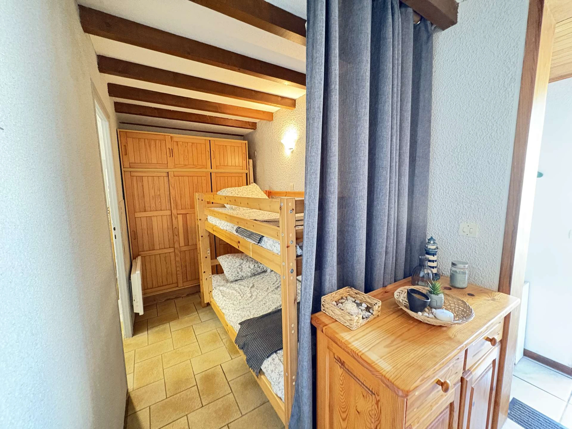 Entrée fonctionnelle : un espace accueillant avec deux lits superposés (90 cm), accompagnés d'un placard pour un rangement pratique.