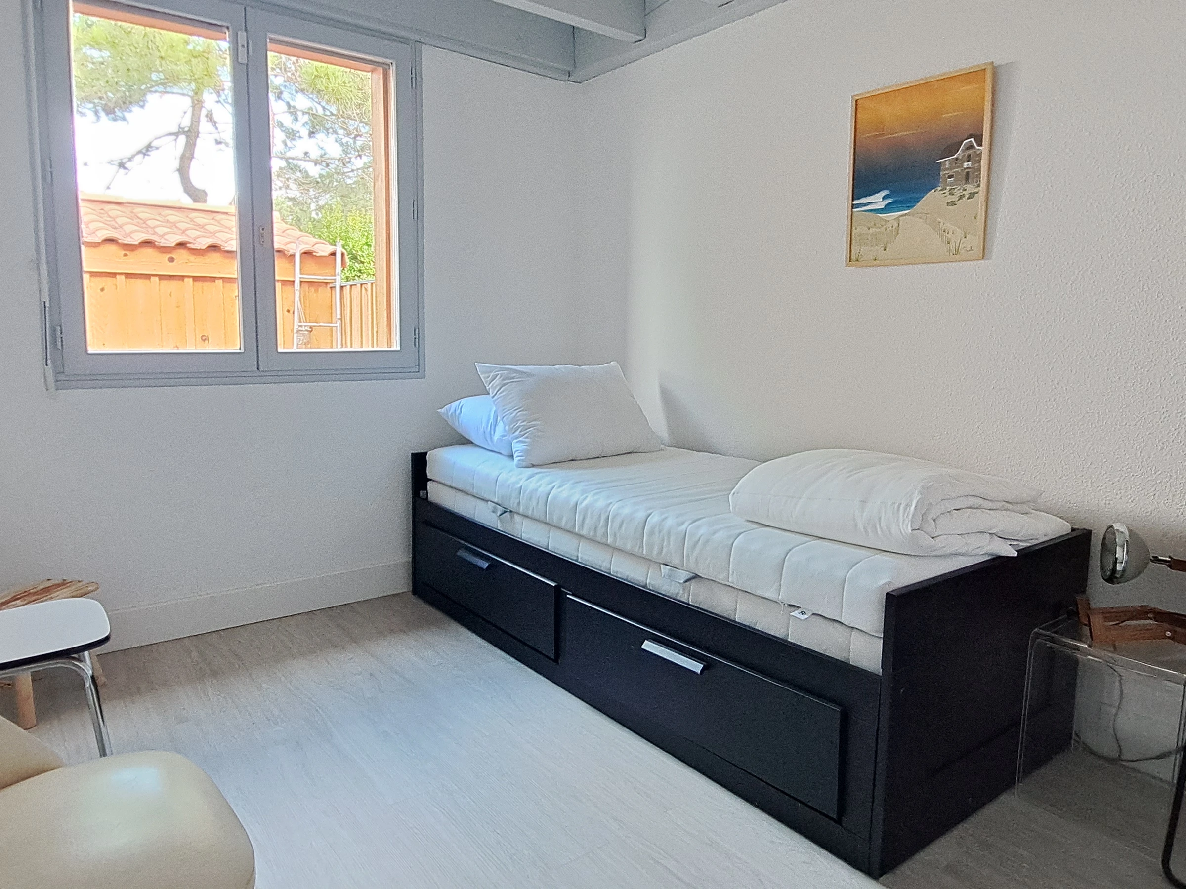 Une chambre avec un lit tiroir de 2x 90 cm et placard . Salle d’eau, avec WC.