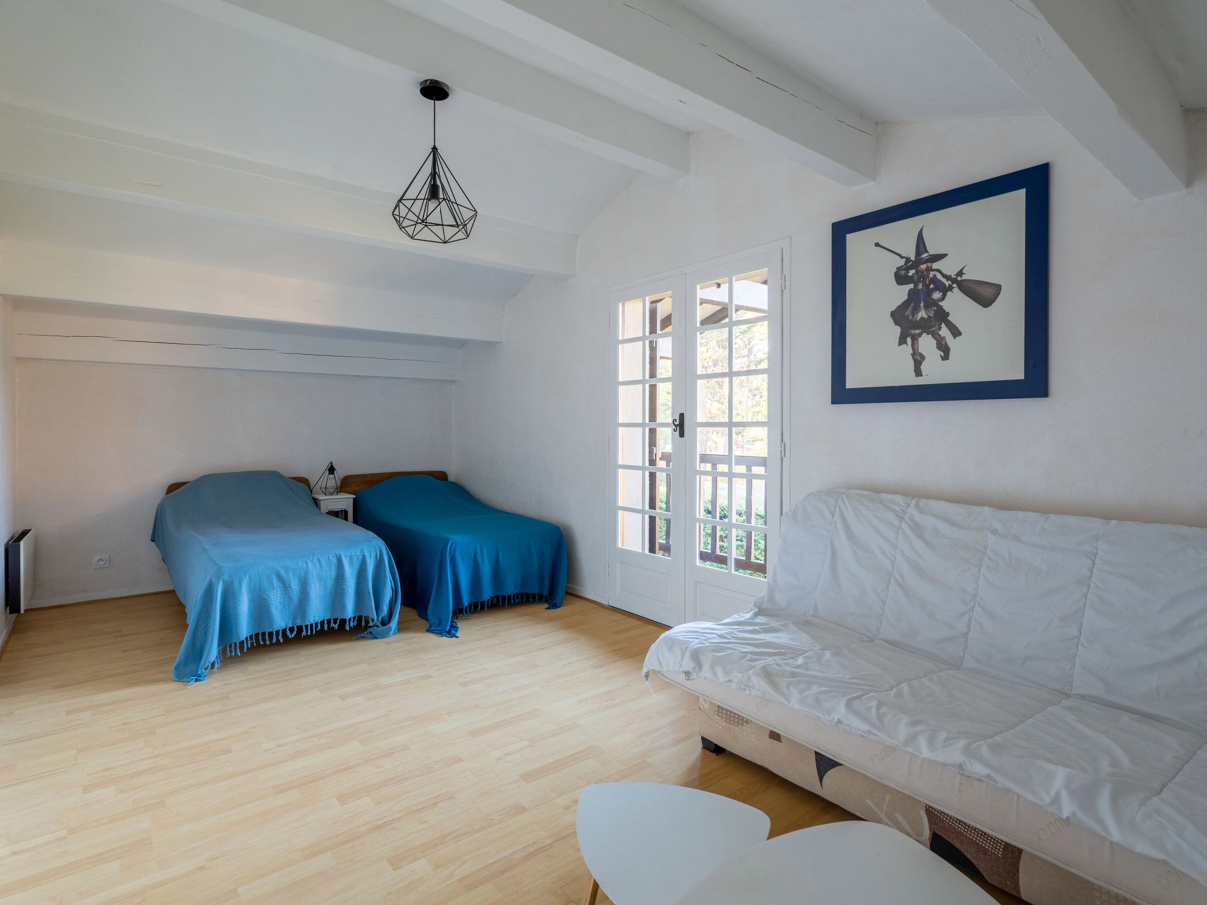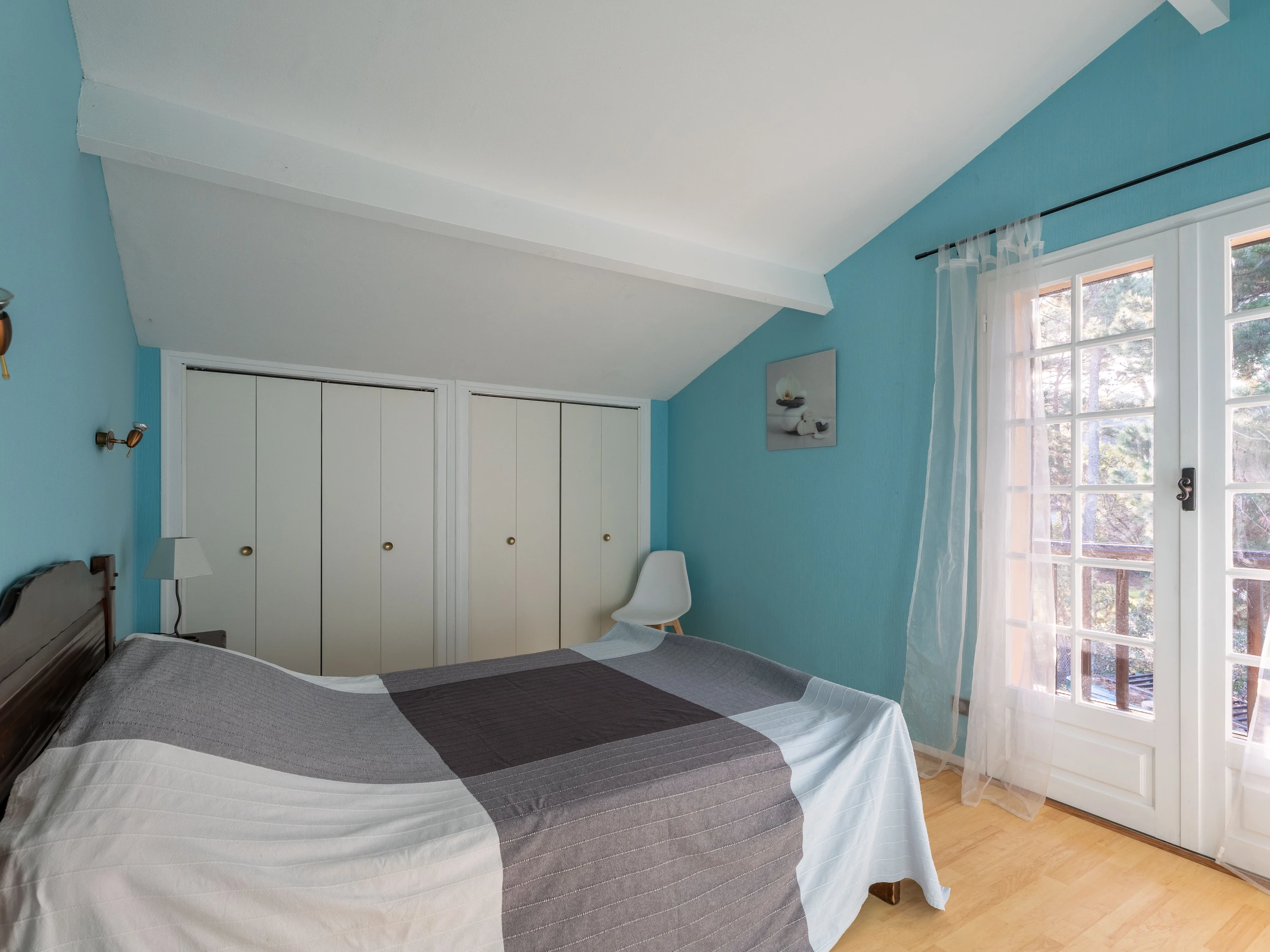 À l’étage, une chambre avec lit double en 140 cm, une chambre dortoir composée de deux lits simples en 90 cm et d’un canapé convertible, les deux avec balcons ainsi qu’une salle d’eau avec WC et lave-linge.
